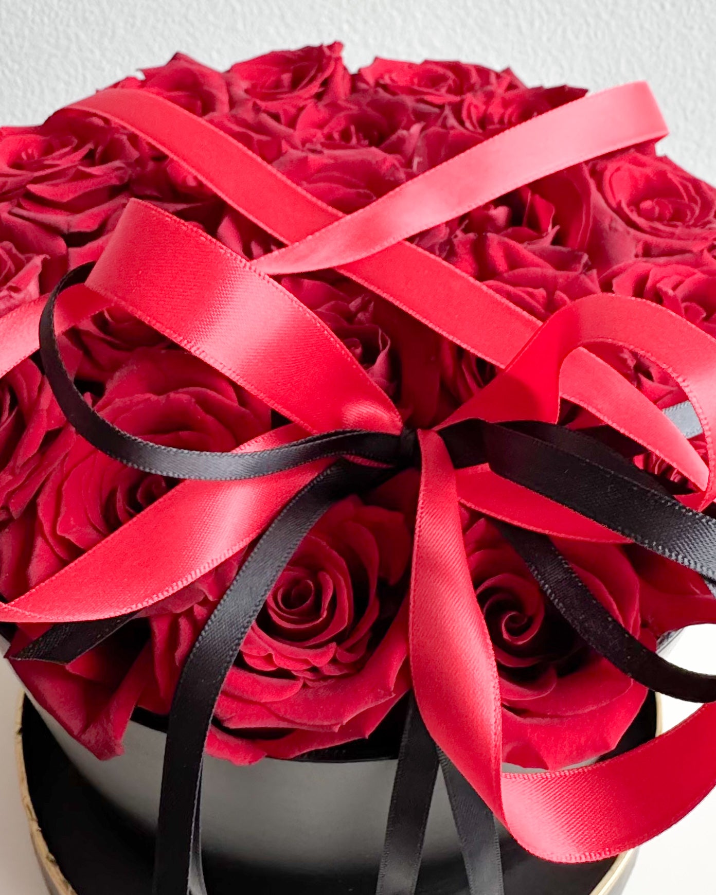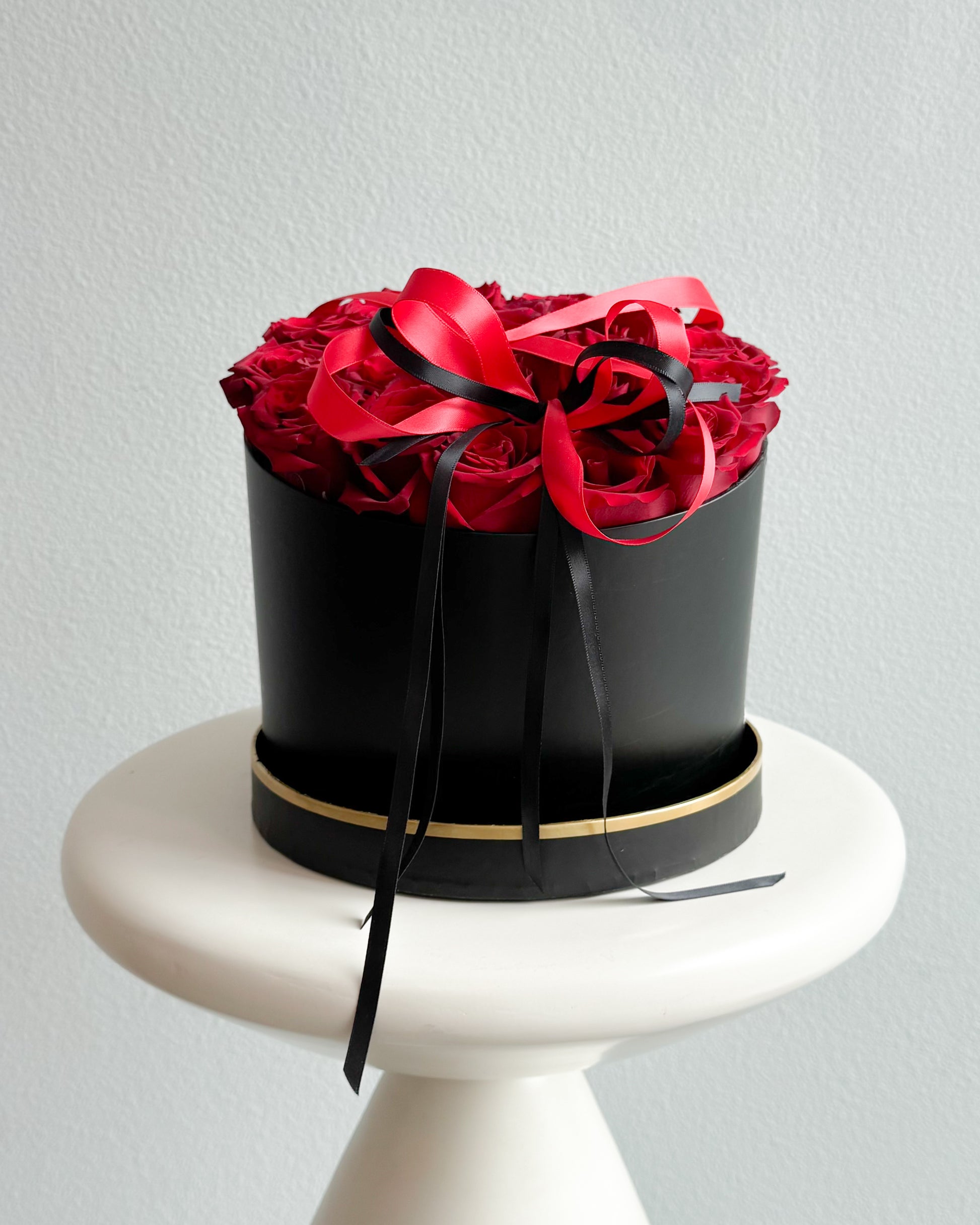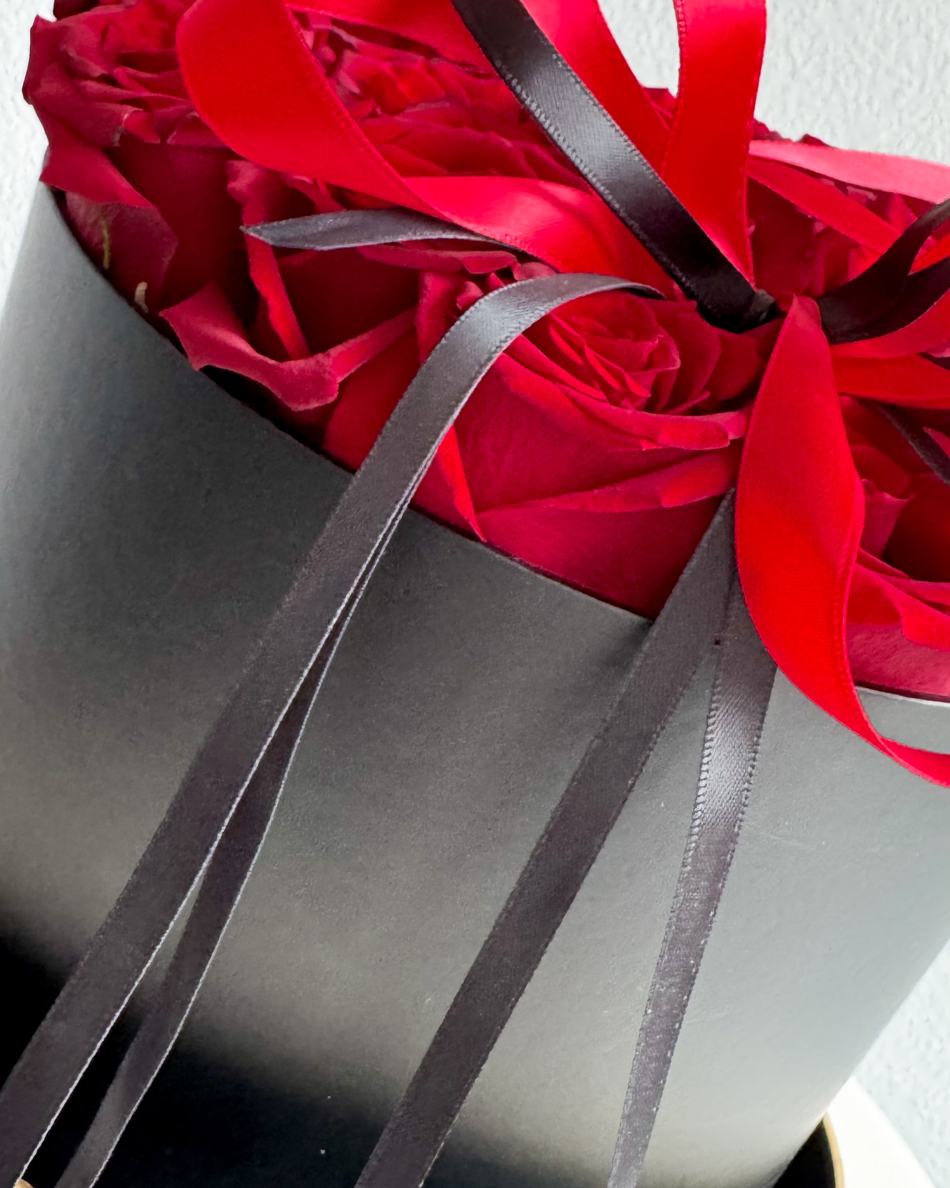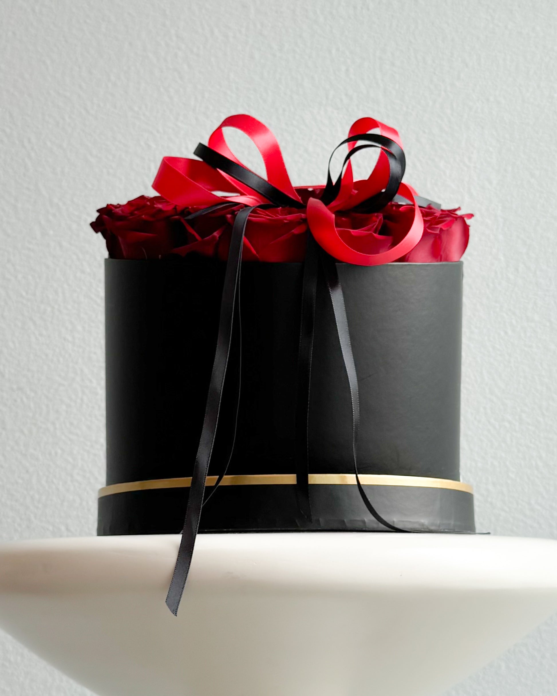 Matte black hatbox, Satin ribbons (red & black), Gold detailing on the box