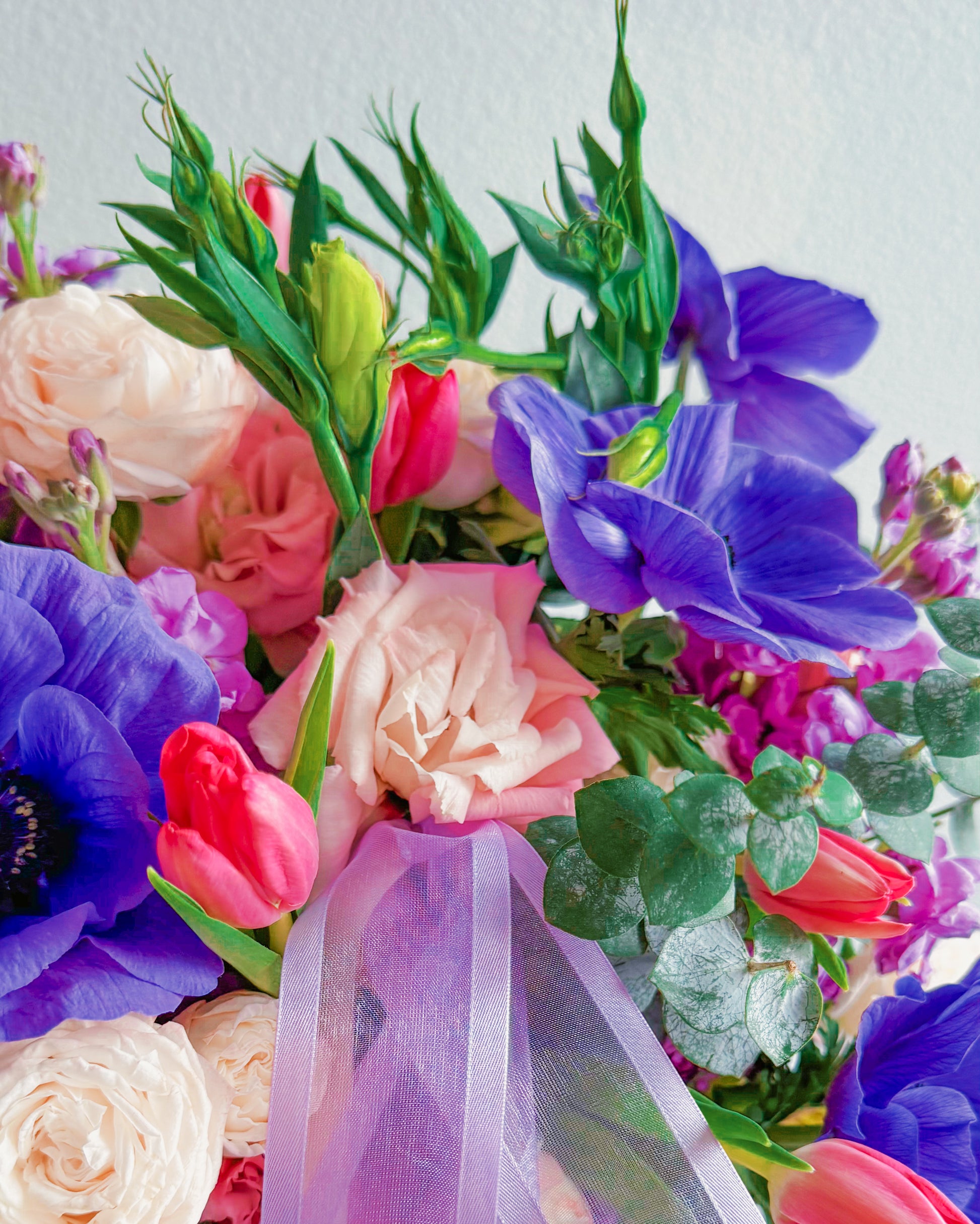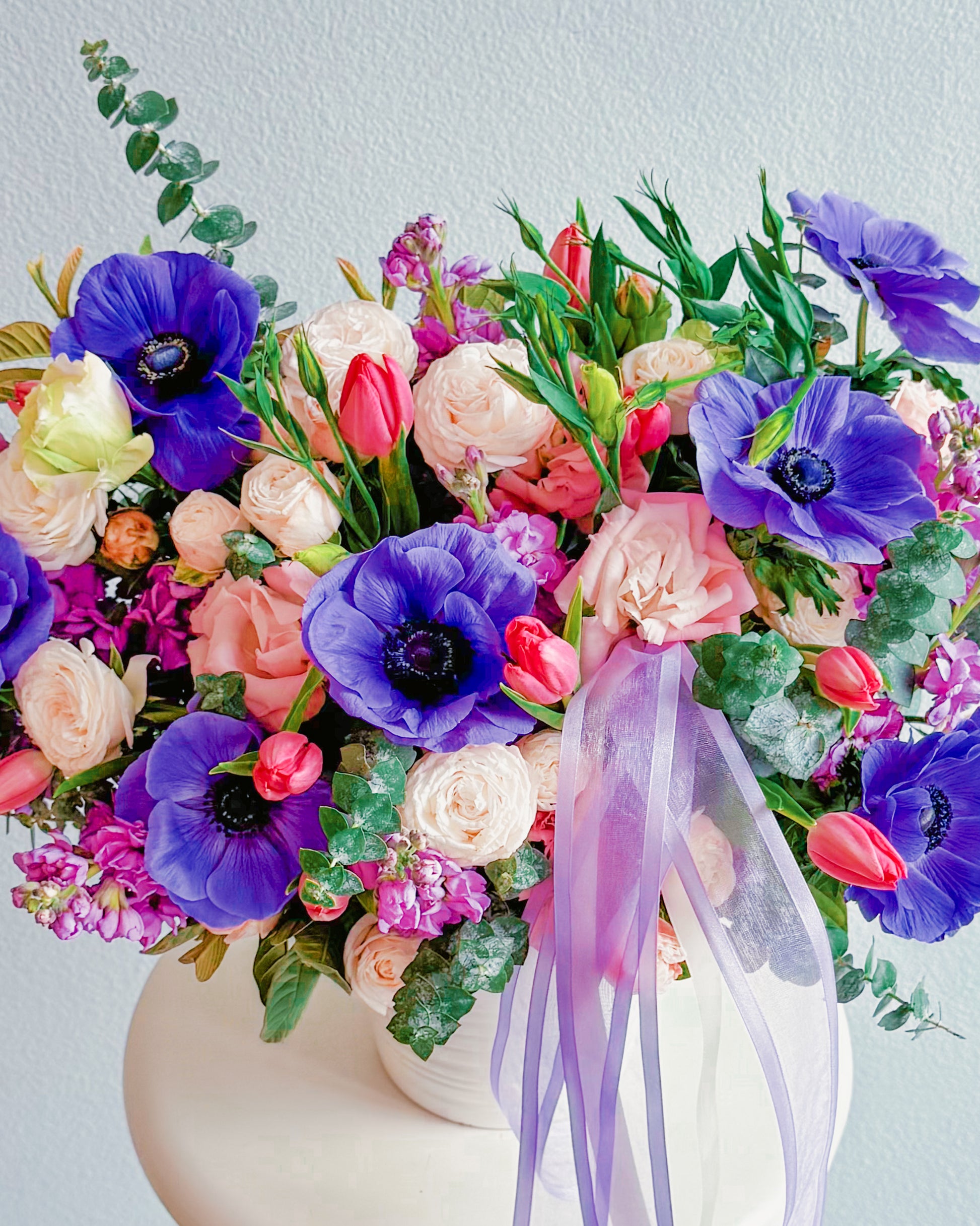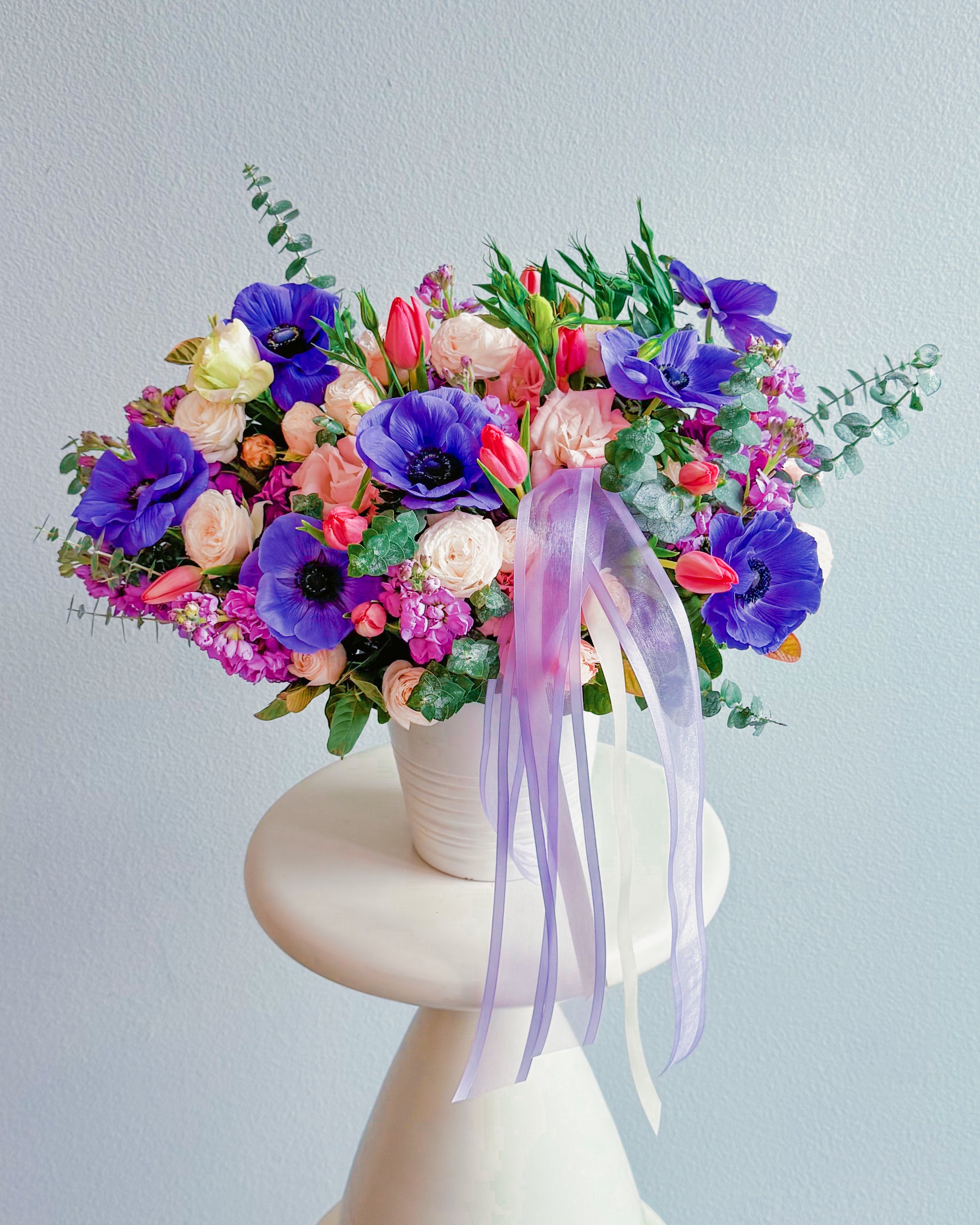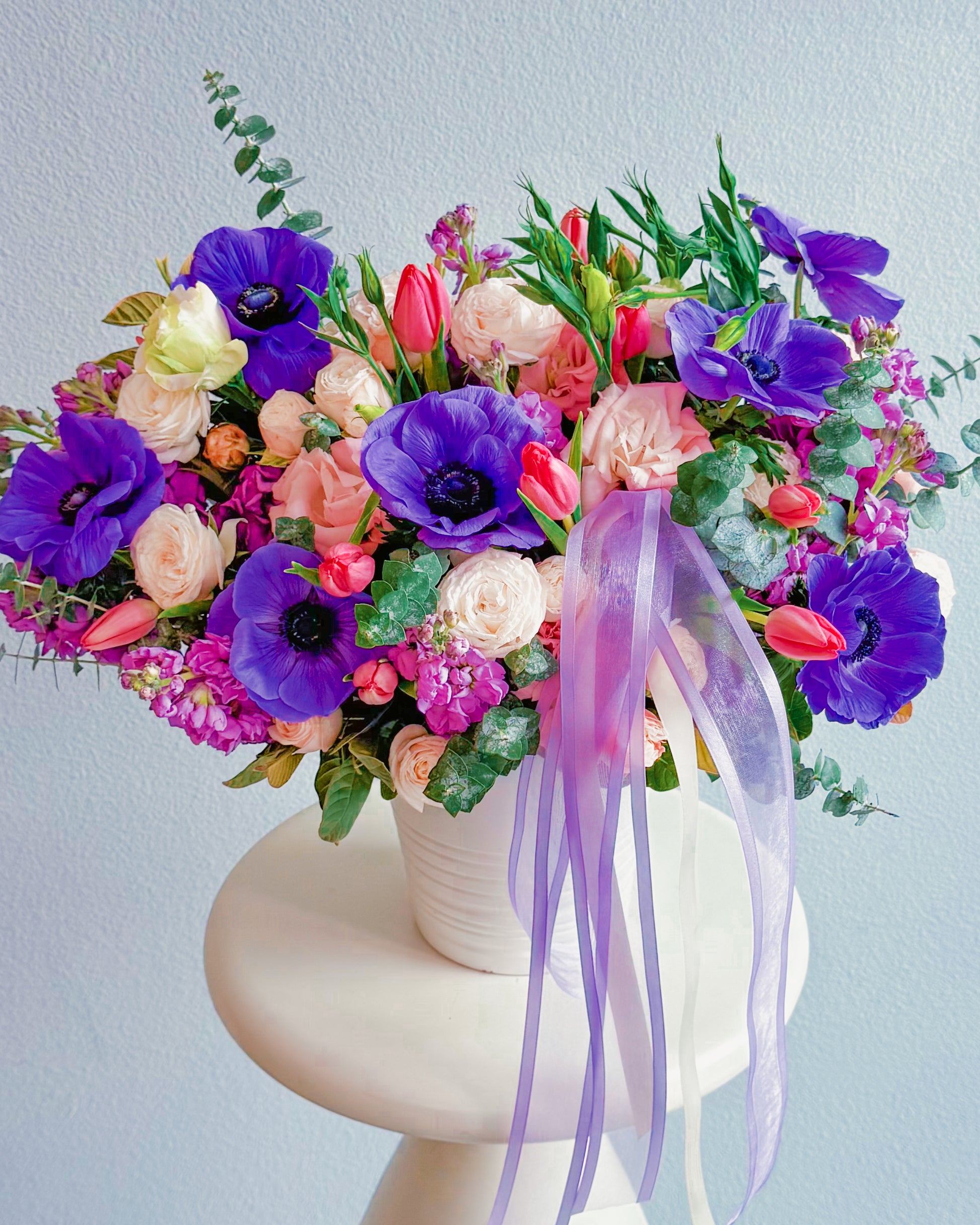 Check out this bouquet - it’s straight-up gorgeous! A total mix of soft, dreamy roses, bold pops of anemones, and cute lil’ tulips giving that fresh, playful vibe. The purples, pinks, and creams make it classy but with just the right touch of fun. That sheer ribbon? Yeah, that’s the cherry on top. Whether you’re flexin’ on a date, surprising your bestie, or just treatin’ yourself - this one’s a winner!