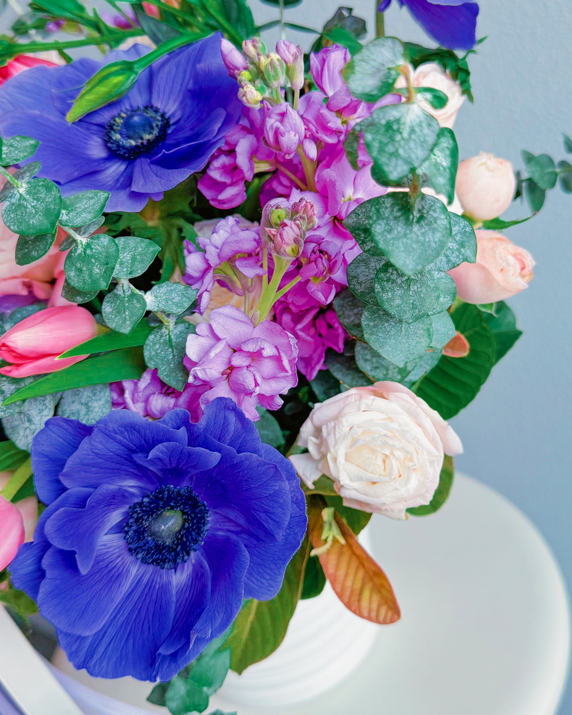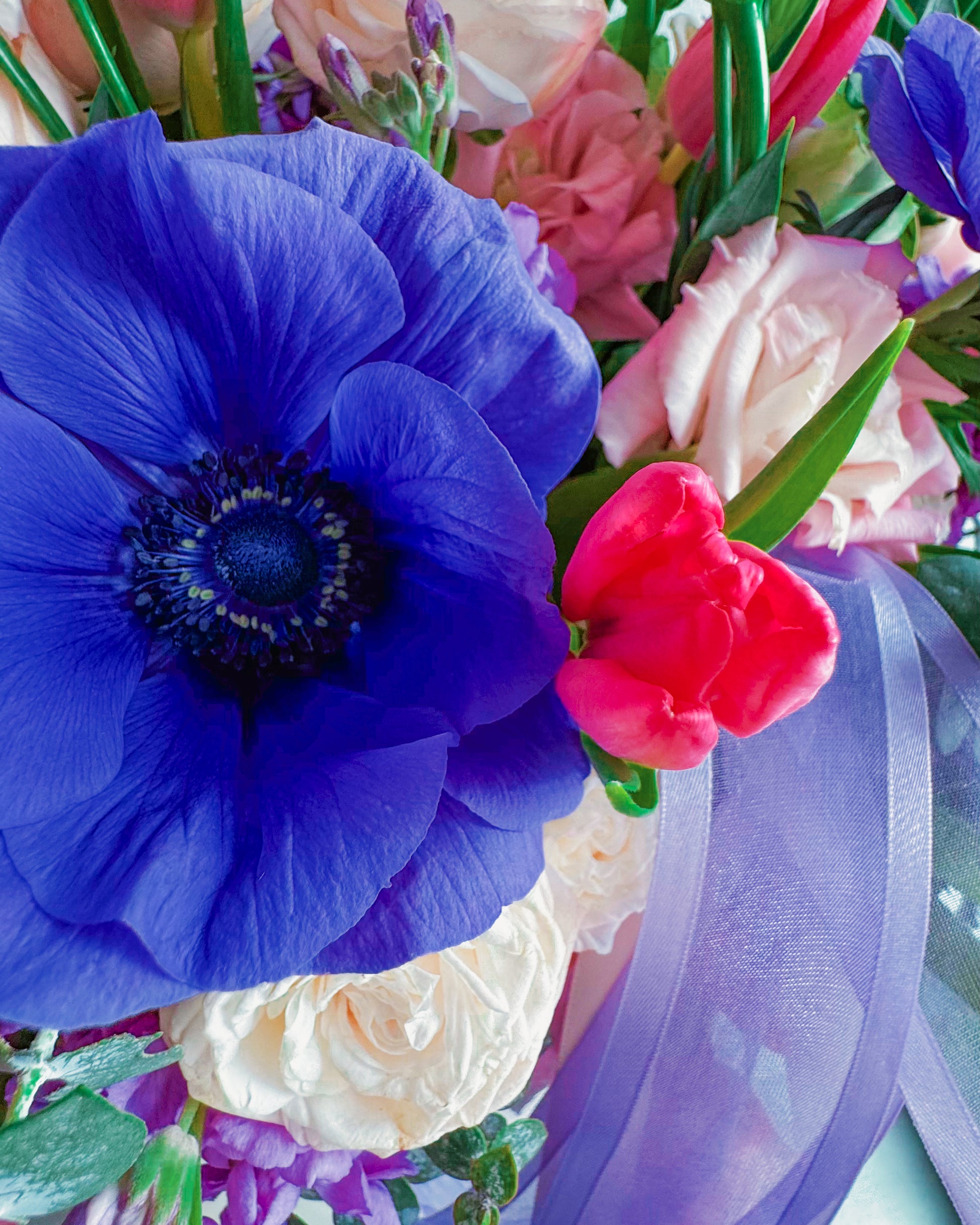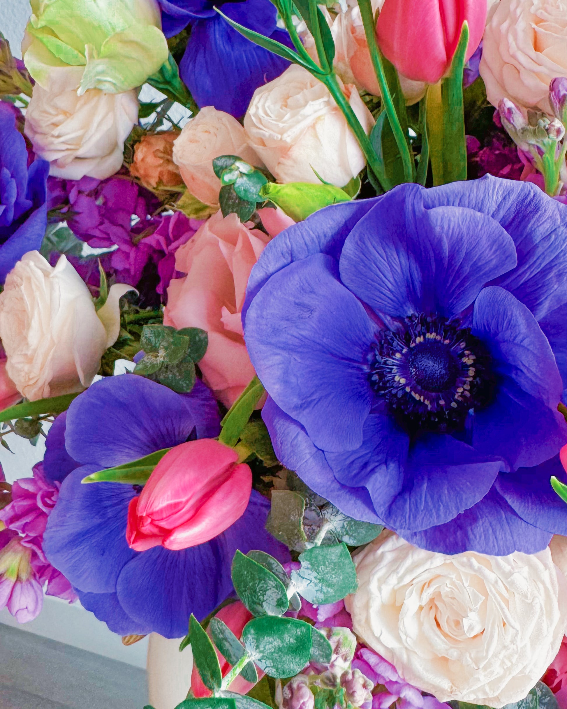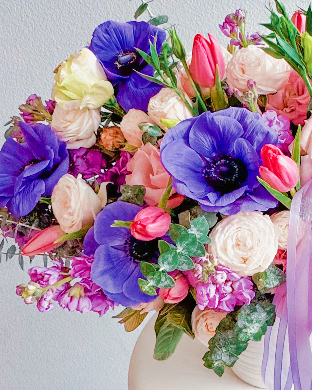 Check out this bouquet - it’s straight-up gorgeous! A total mix of soft, dreamy roses, bold pops of anemones, and cute lil’ tulips giving that fresh, playful vibe. The purples, pinks, and creams make it classy but with just the right touch of fun. That sheer ribbon? Yeah, that’s the cherry on top. Whether you’re flexin’ on a date, surprising your bestie, or just treatin’ yourself - this one’s a winner!