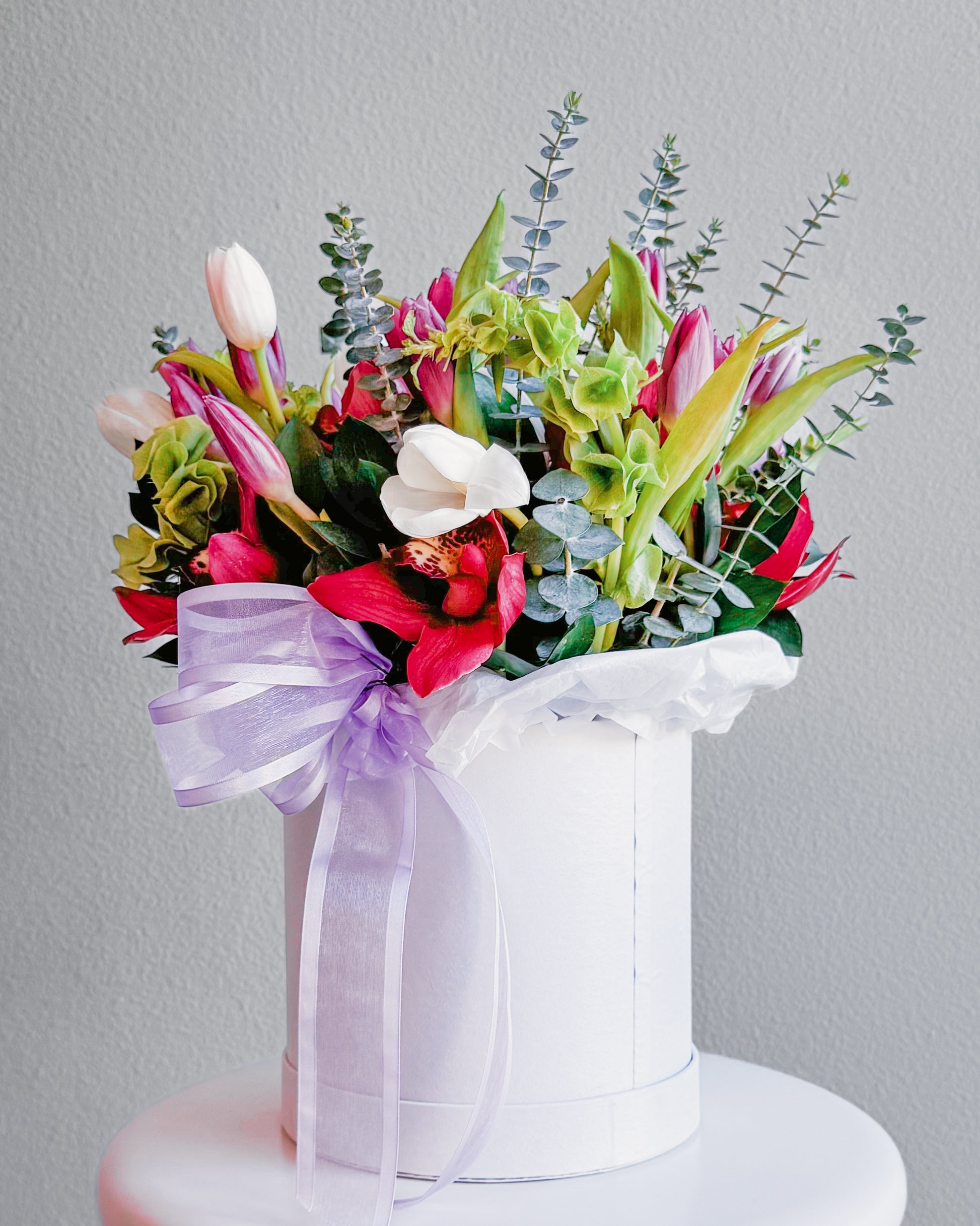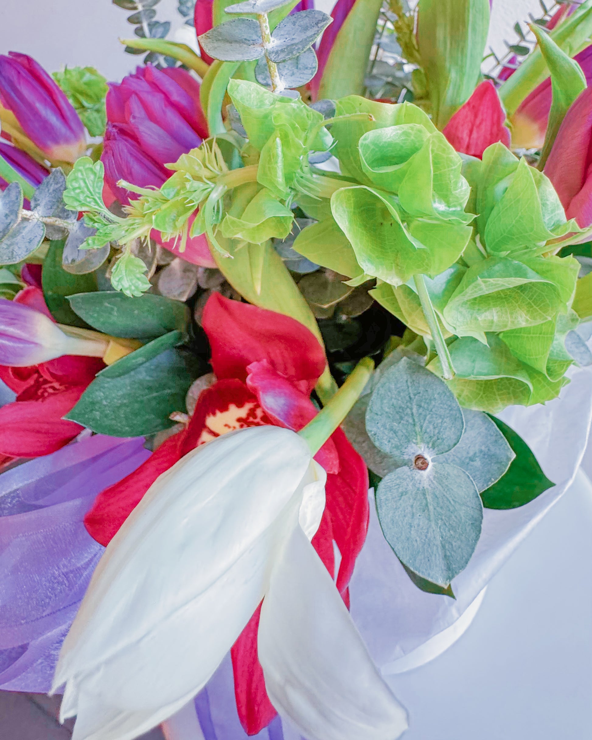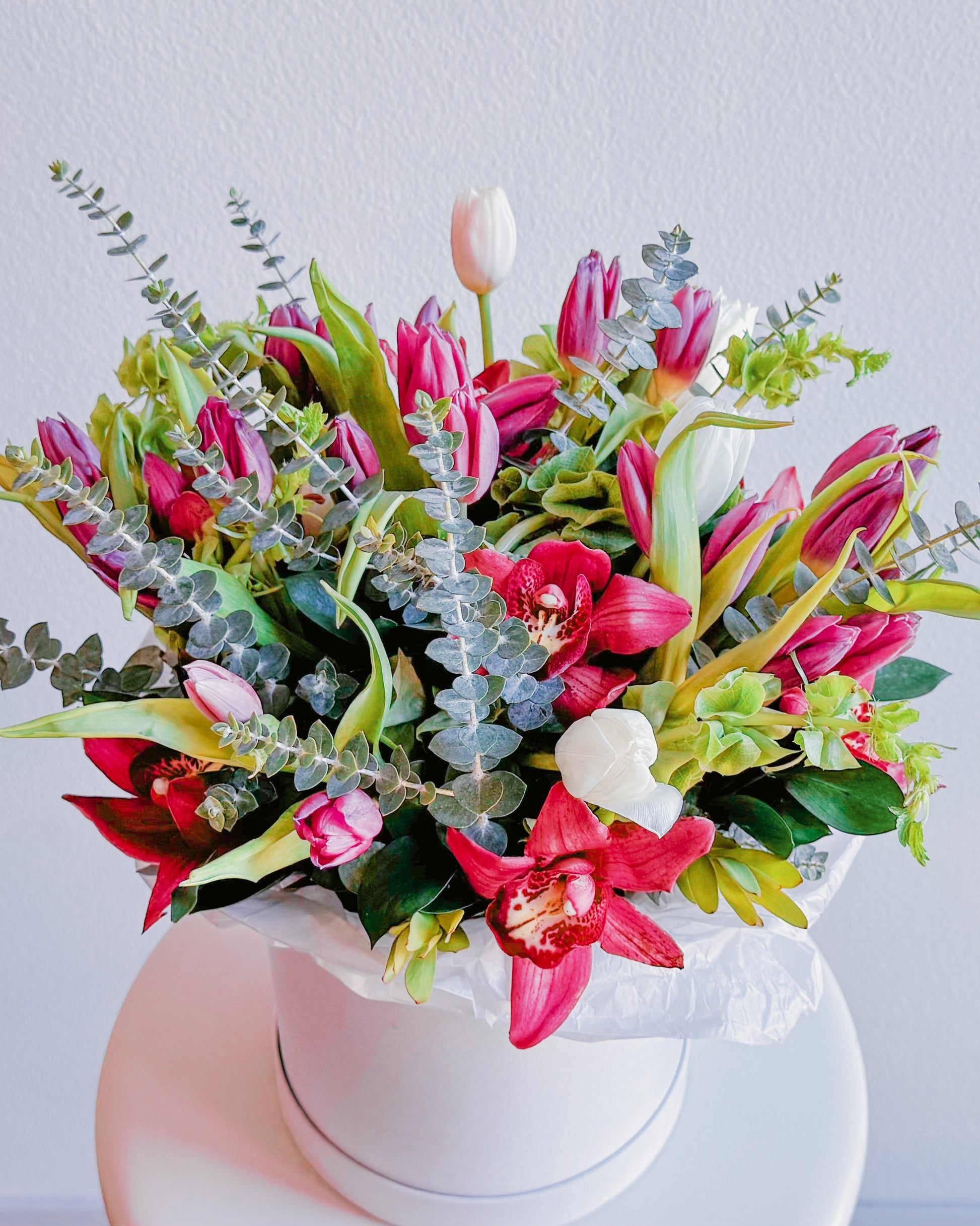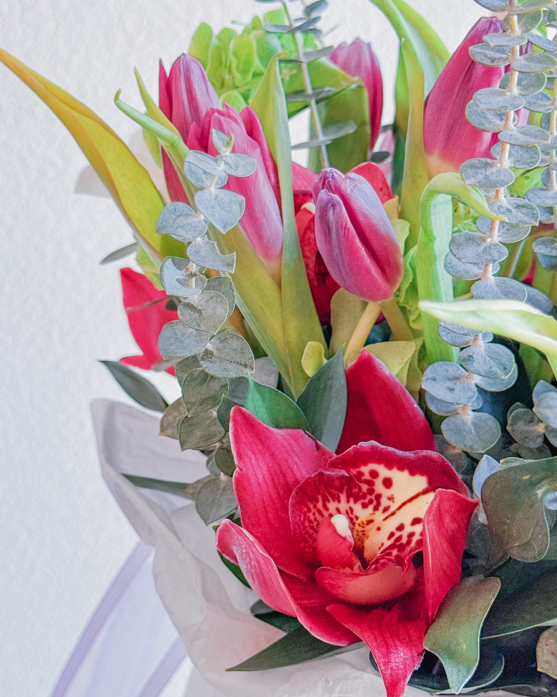 This bouquet is a joyful celebration of life, bursting with vibrancy and elegance. The deep crimson blooms, paired with soft white accents and delicate greenery, create an air of romance and freshness. It feels like a quiet morning in spring when the world awakens with new possibilities. This arrangement effortlessly balances lush richness with natural grace, leaving you with a sense of calm and beauty.