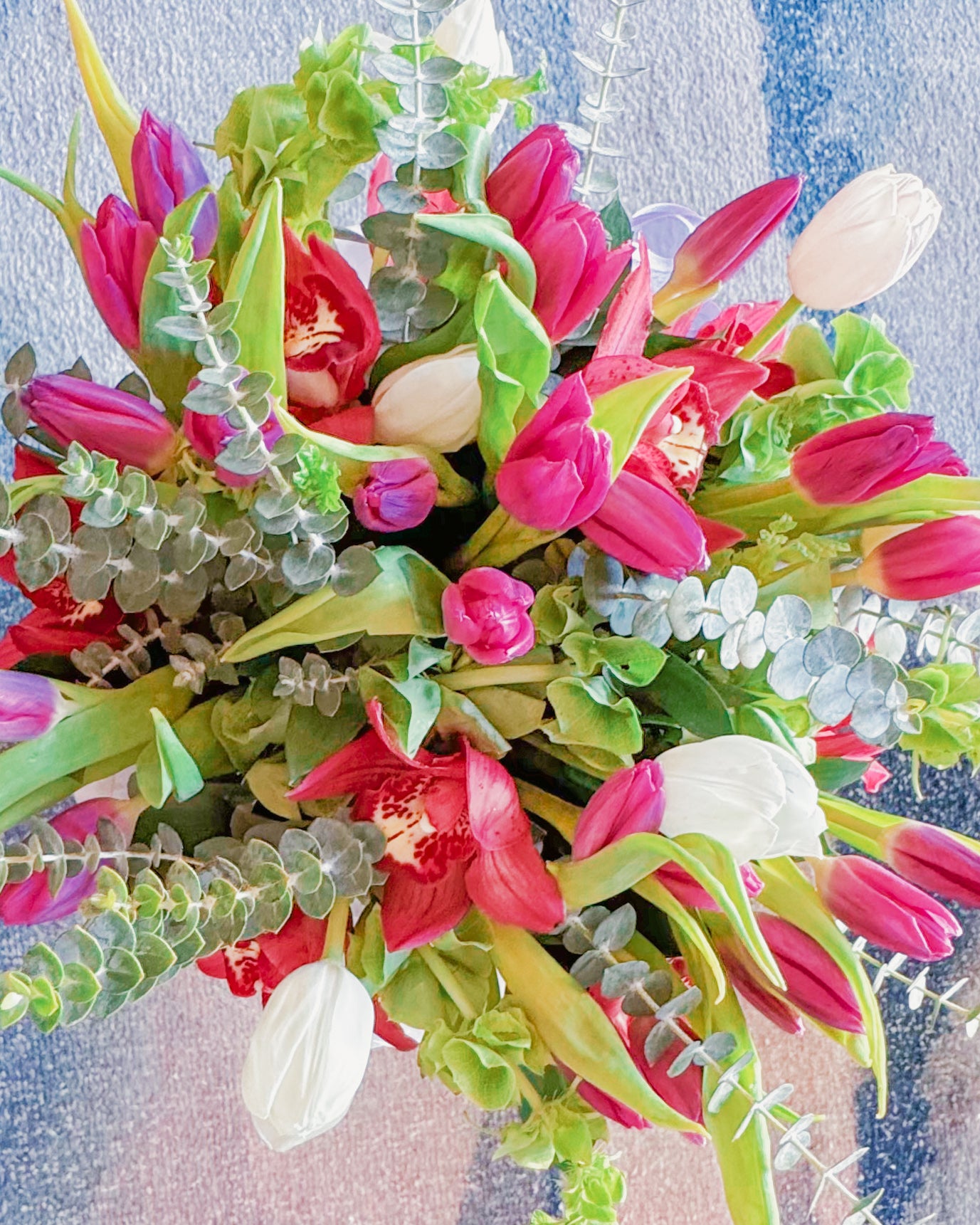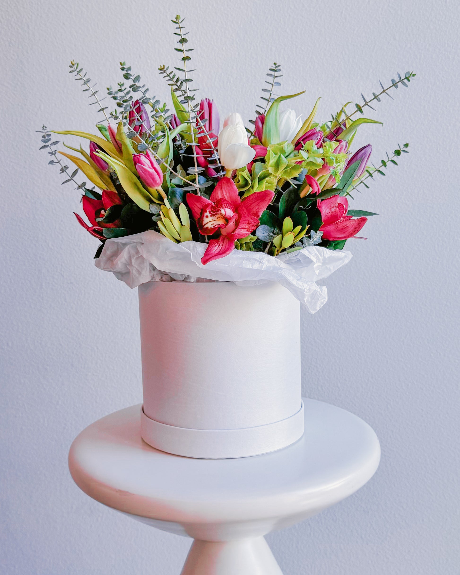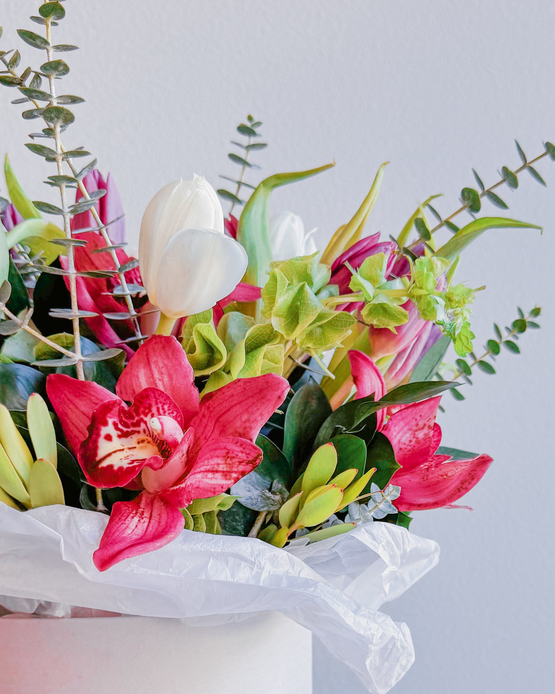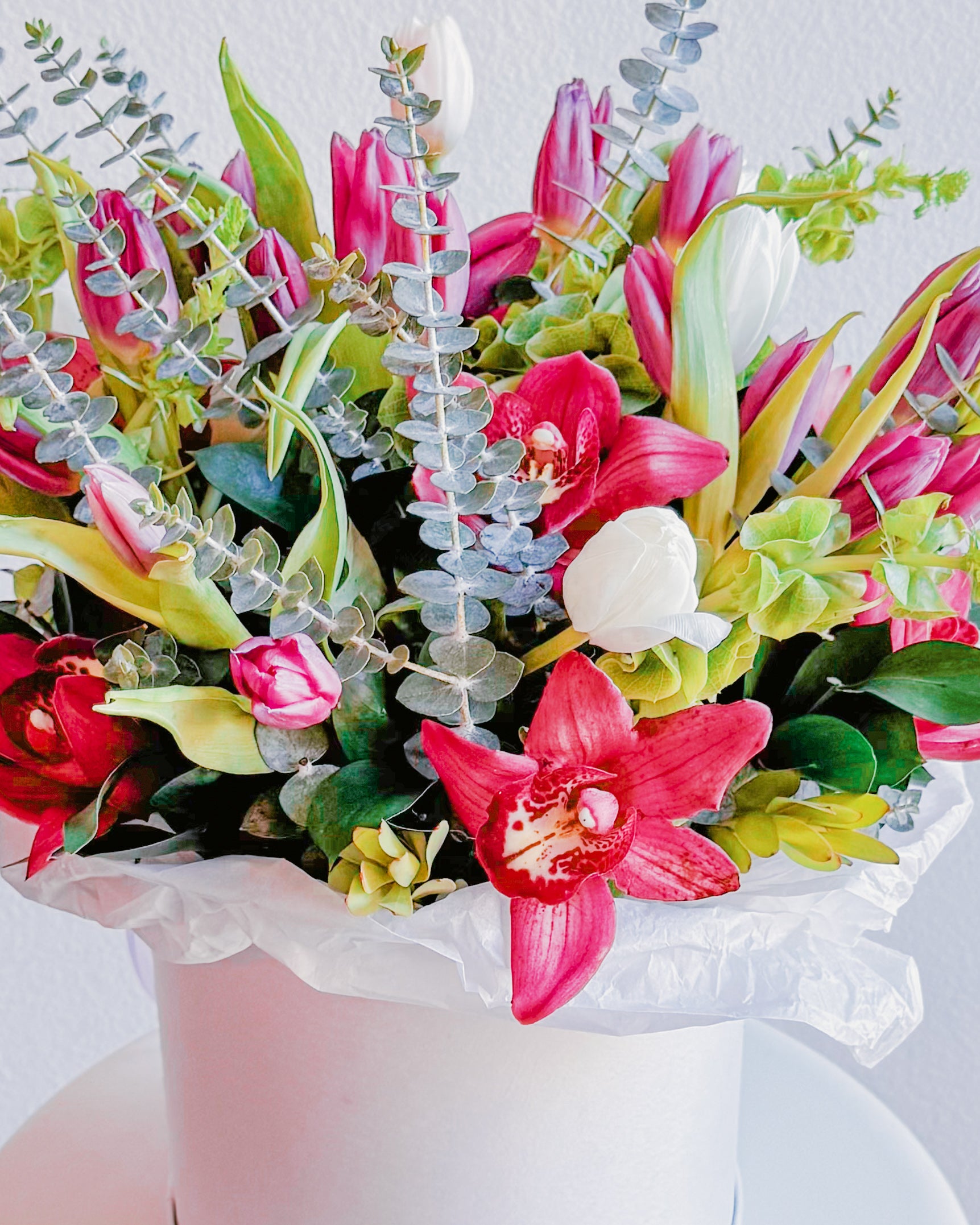 This bouquet is a joyful celebration of life, bursting with vibrancy and elegance. The deep crimson blooms, paired with soft white accents and delicate greenery, create an air of romance and freshness. It feels like a quiet morning in spring when the world awakens with new possibilities. This arrangement effortlessly balances lush richness with natural grace, leaving you with a sense of calm and beauty.