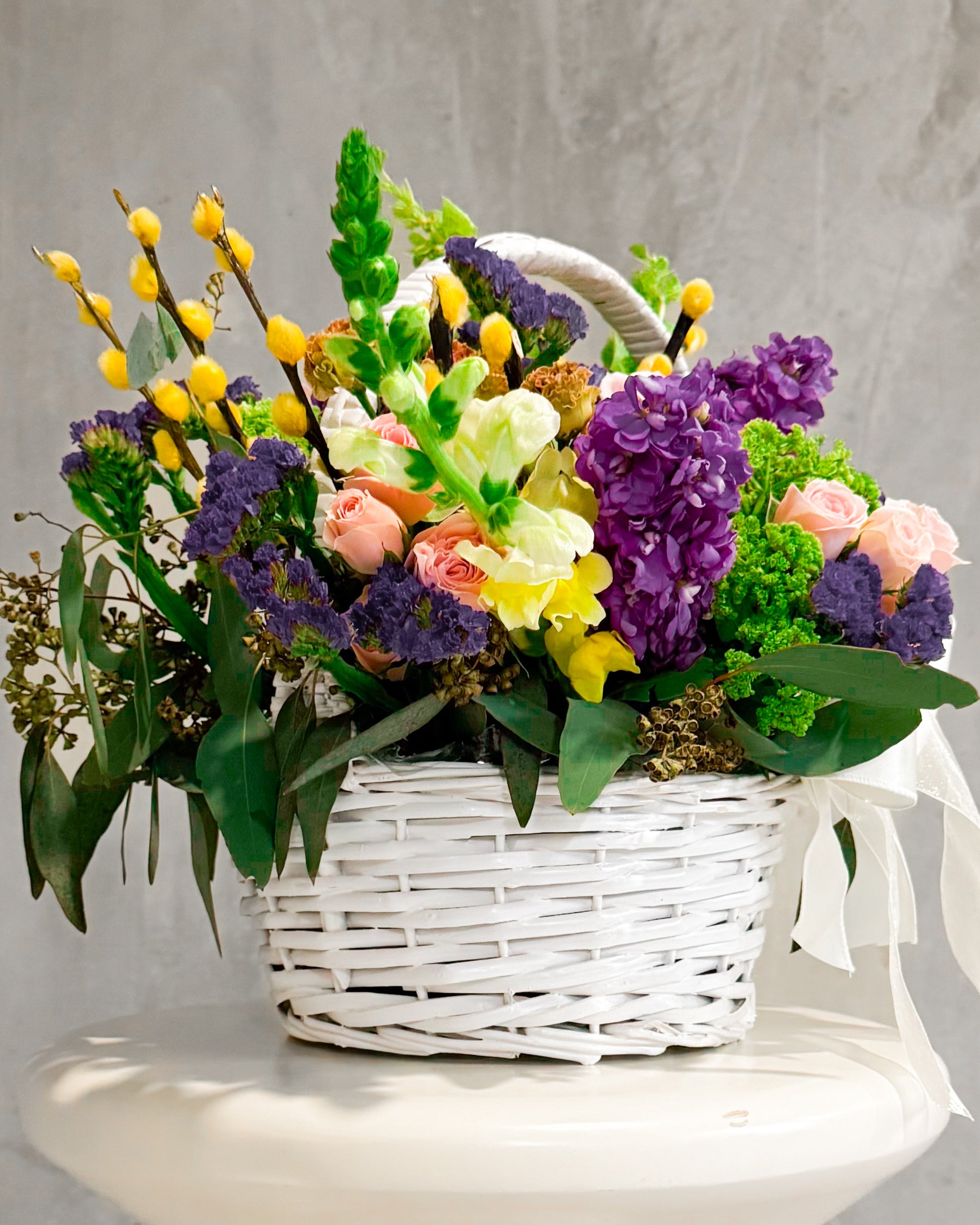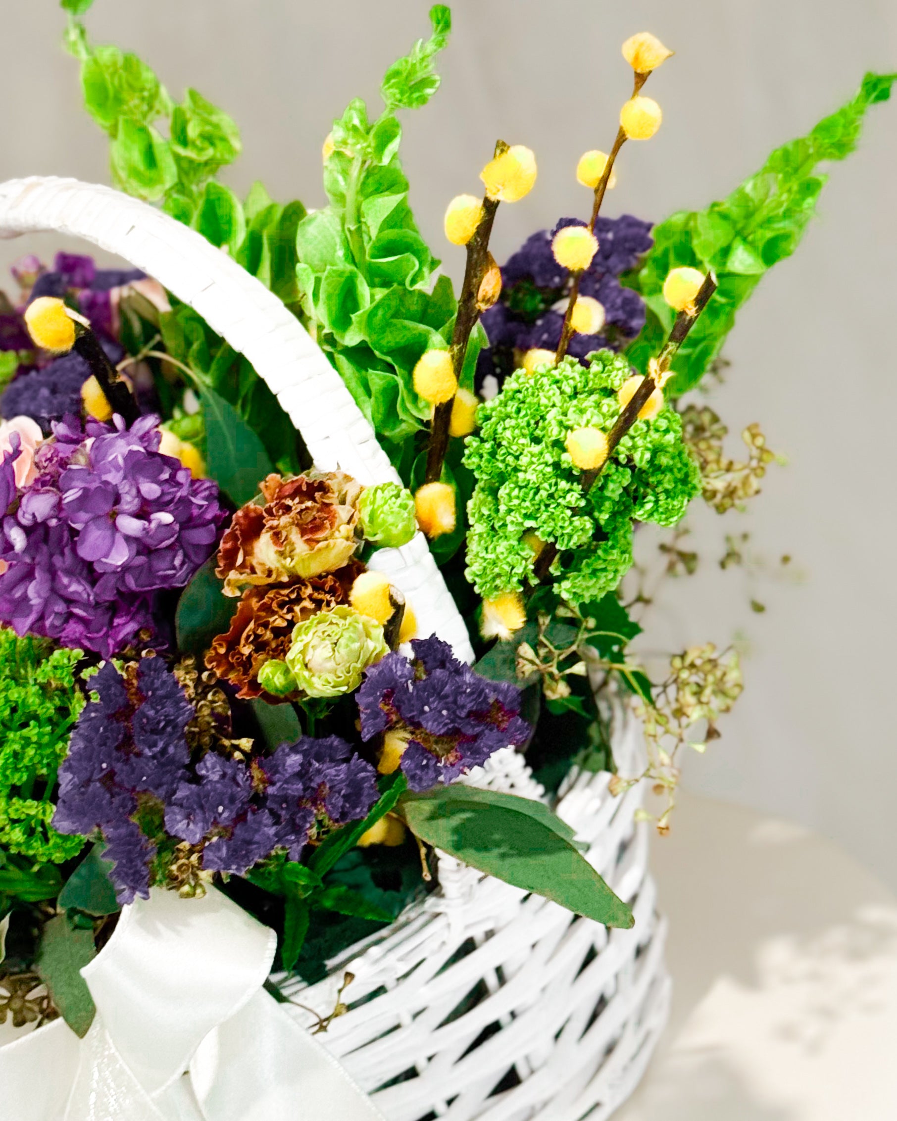 Natural blooms (mixed seasonal flowers), Dyed yellow pussy willow, Eco paper or floral foam base (assumed for structure), Woven white basket, Decorative organza ribbon.