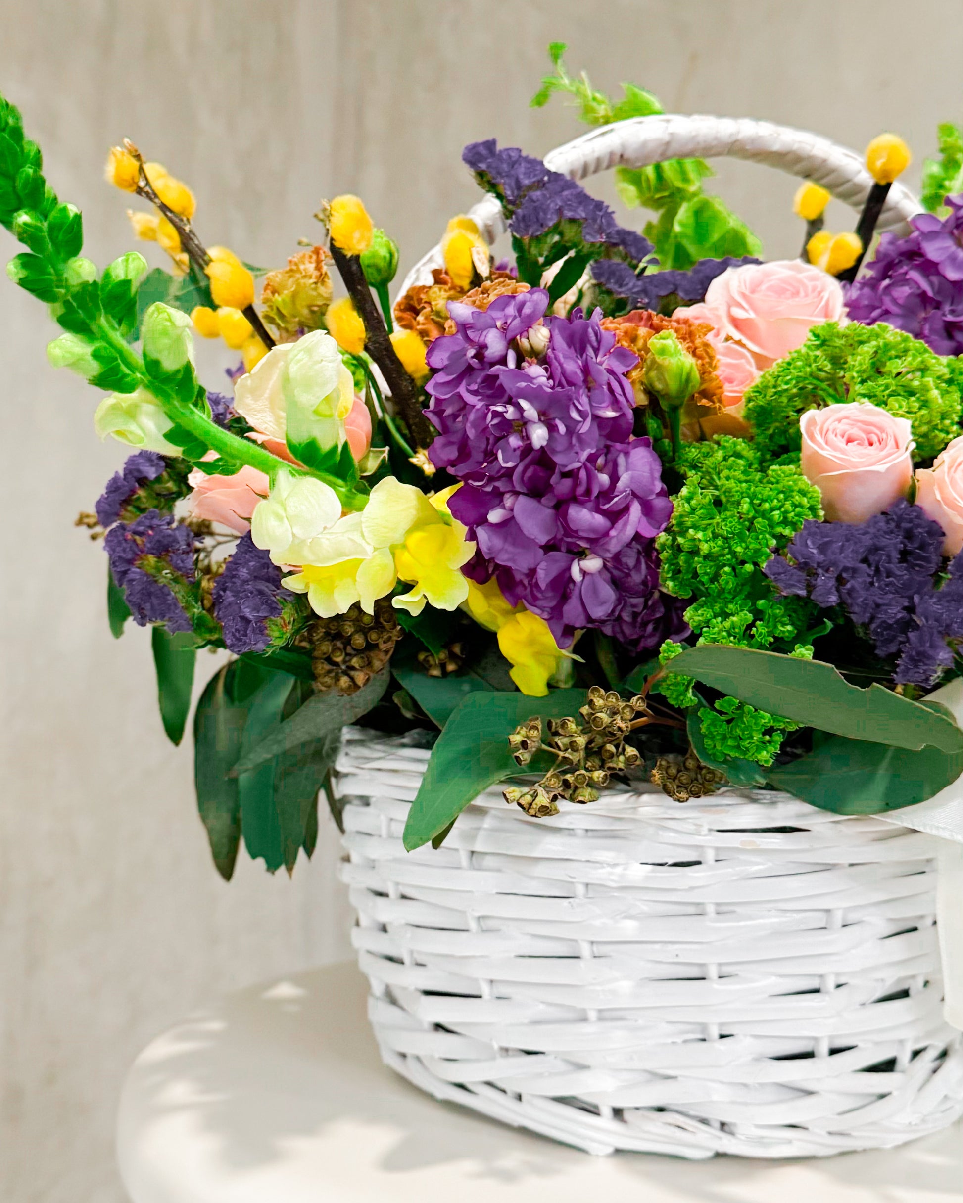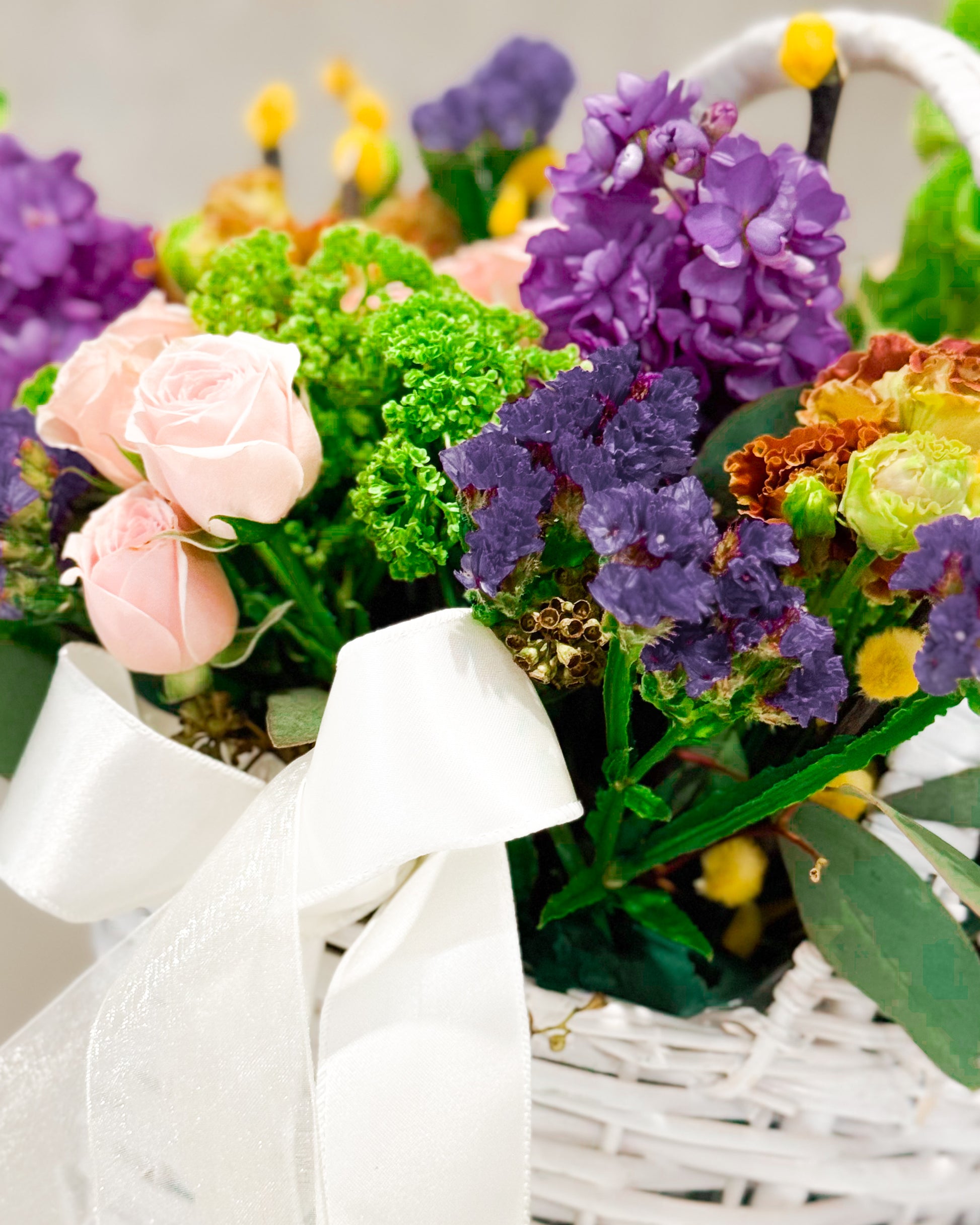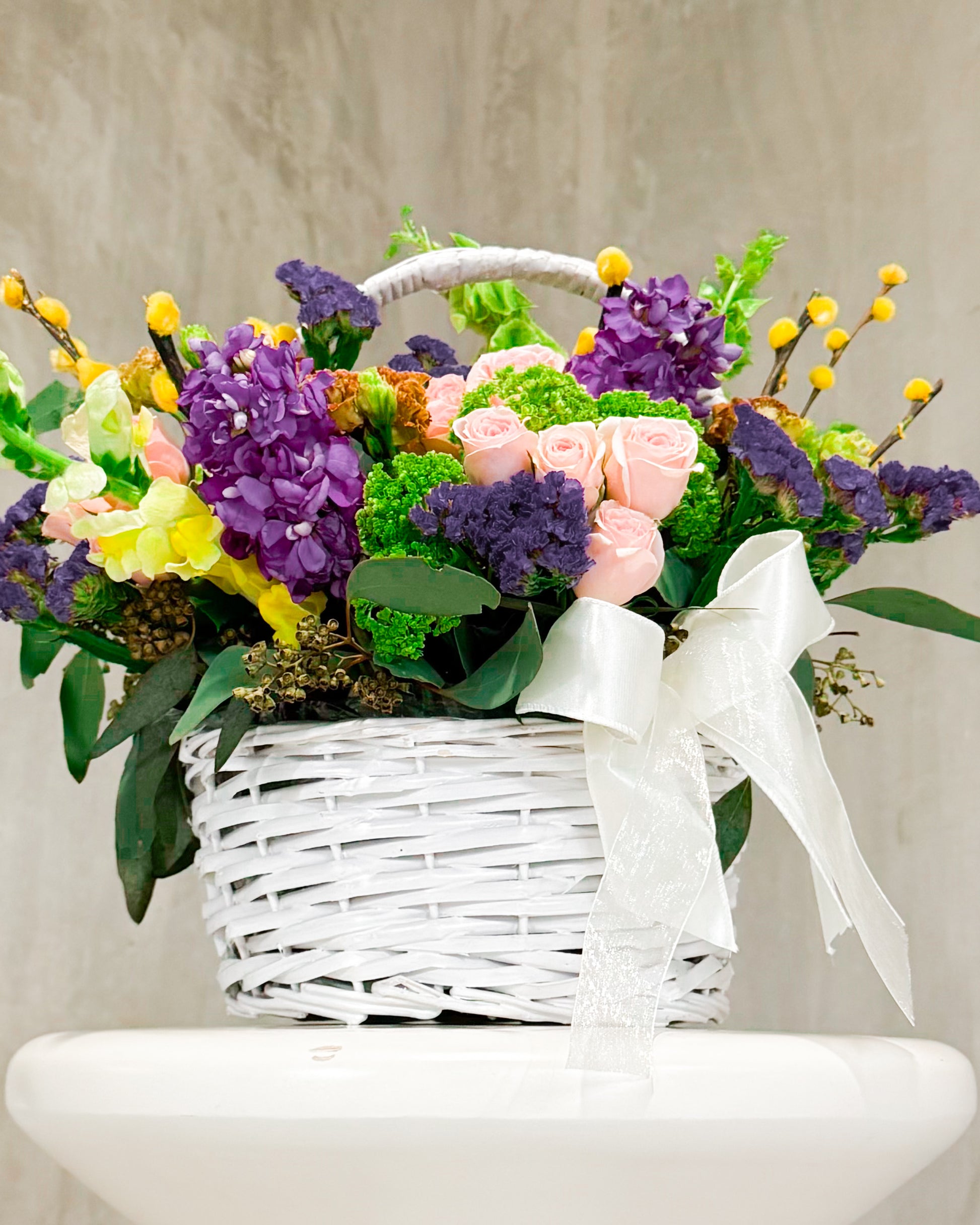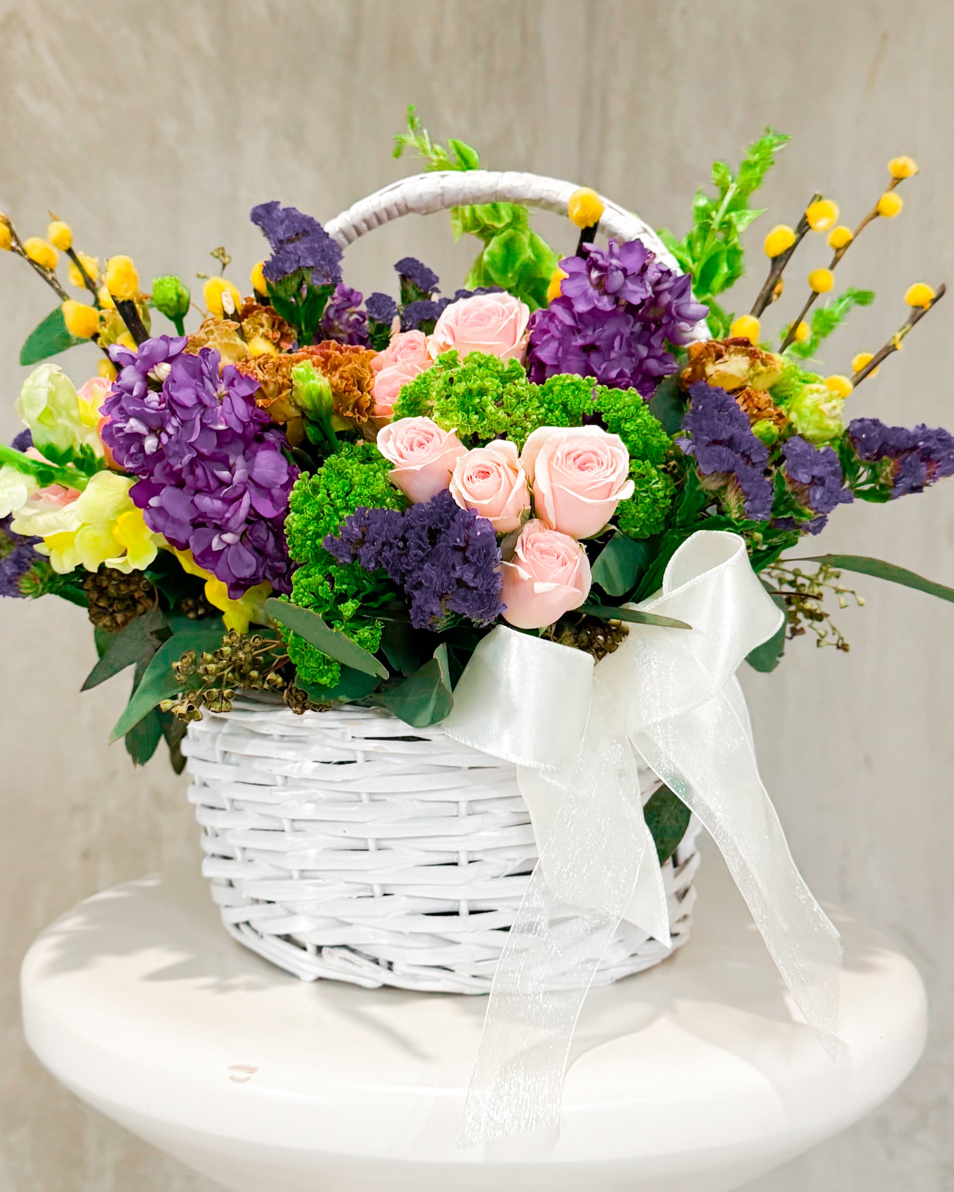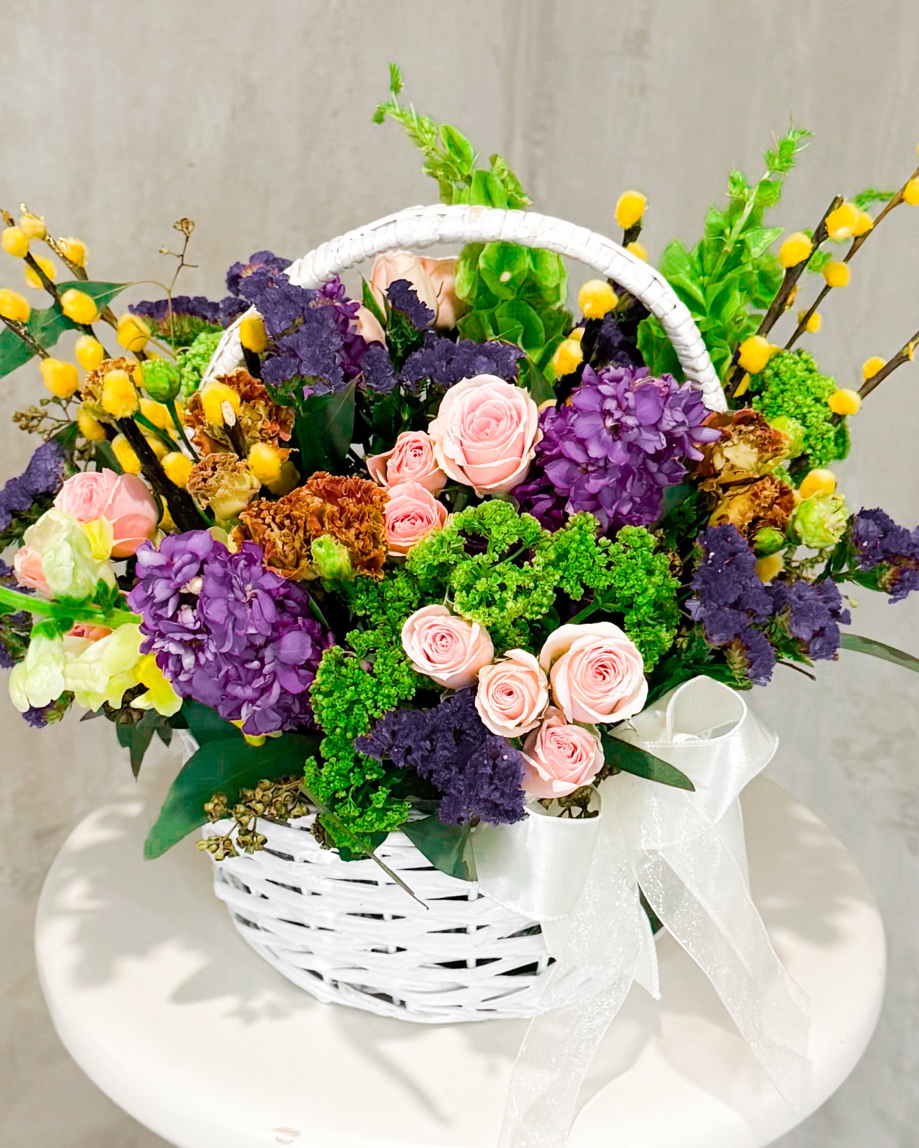 Say hello to Bounty Hampy — a full-on floral moment. This one’s bursting (literally) with bold colors, major texture, and springtime joy. It’s like nature got dressed up for a garden party and brought all her besties. With soft pink roses, juicy purples, sunshiney yellow poms, and those cool green textures, it's giving floral maximalism in the best way. Wrapped up in a crisp white basket with a sheer bow, it’s ready to turn any day into a celebration.