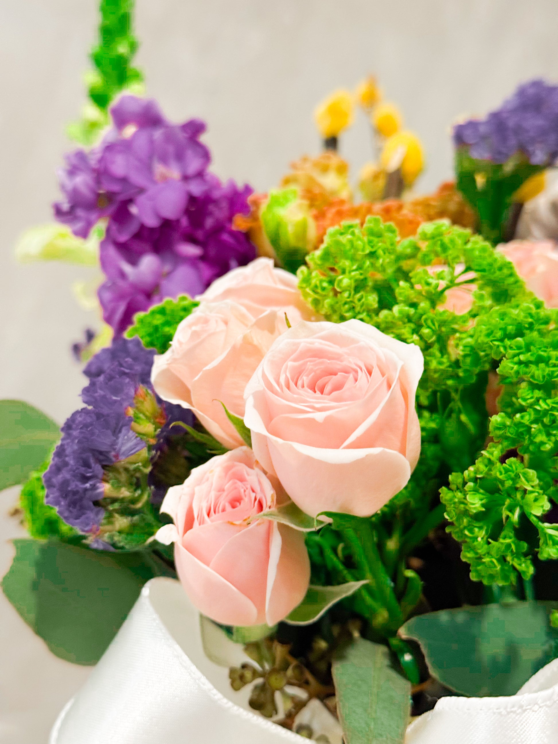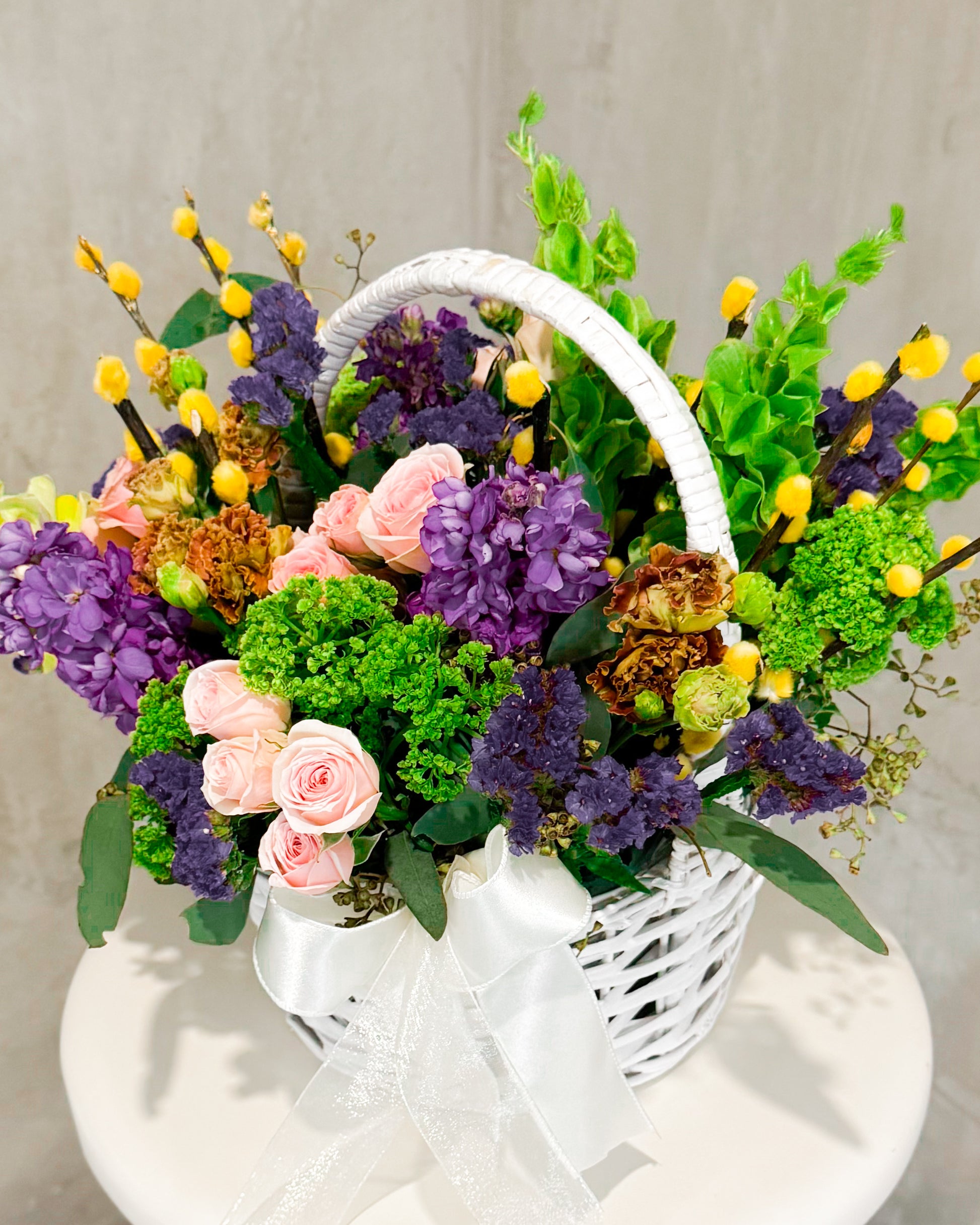 Blush Pink Spray Roses, Purple Stock, Yellow Pussy Willow, Green Viburnum, Yellow Snapdragons, Carnations (dusty orange/rust), Lavender Statice, Bells of Ireland, Eucalyptus Leaves, Waxflower (accent).