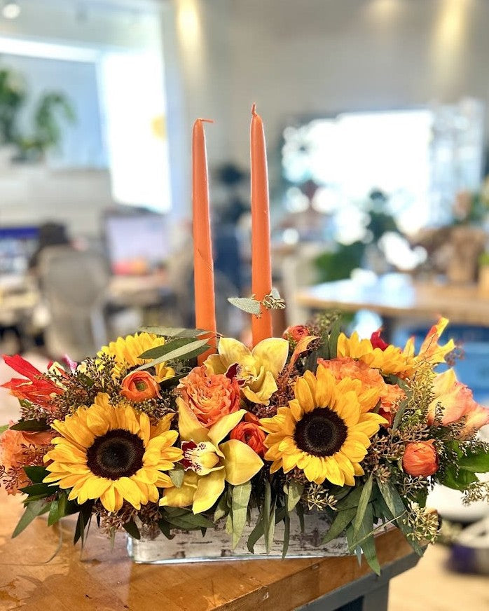 This floral centrepiece is guaranteed to create a warm and inviting atmosphere! It features radiant sunflowers, delicate yellow orchids, vibrant orange roses, and charming ranunculus, all accented by lush greenery and rustic elements. And it's finished with two elegant orange candles! It's perfect for cosy dinners or festive celebrations.
