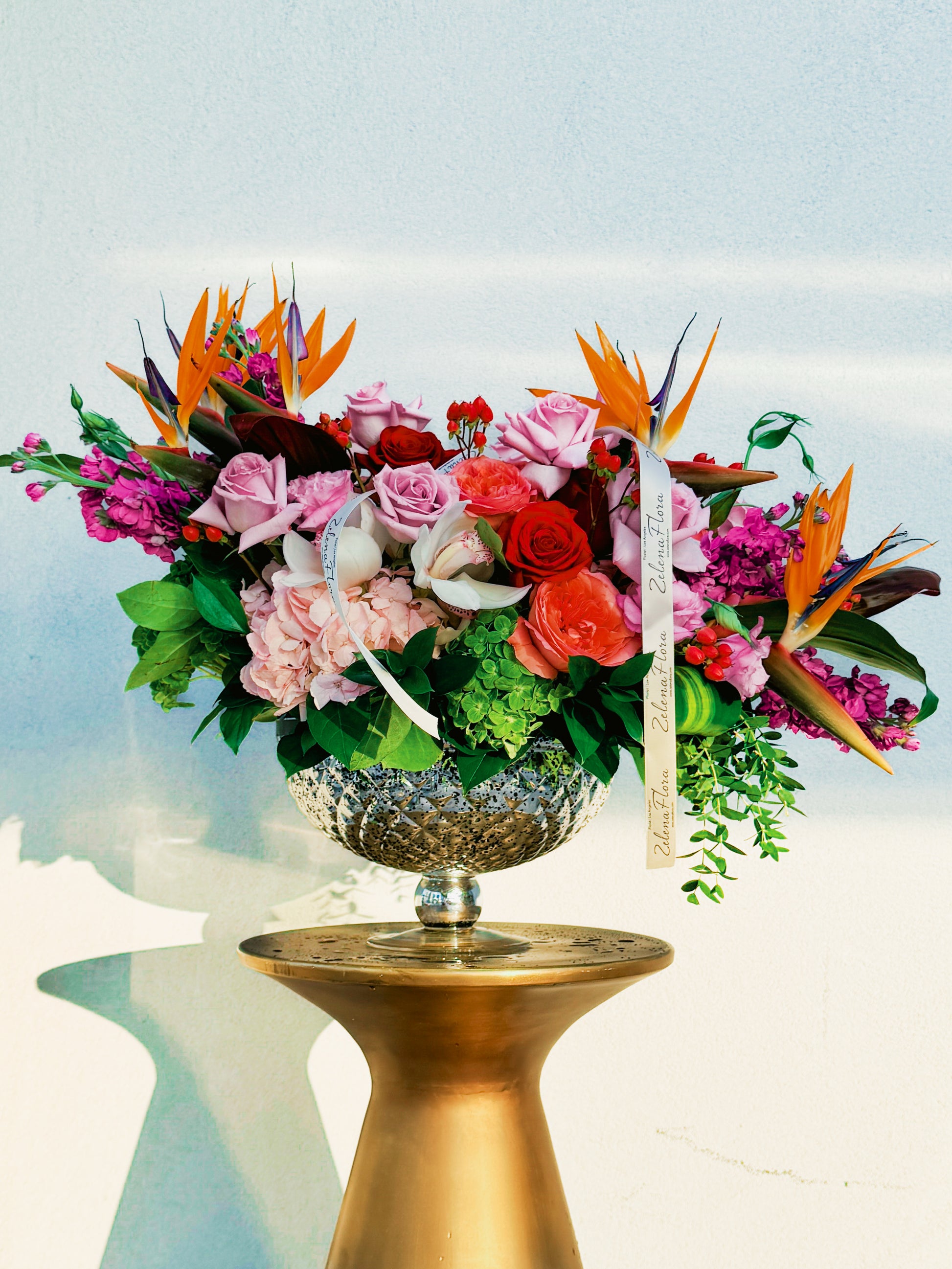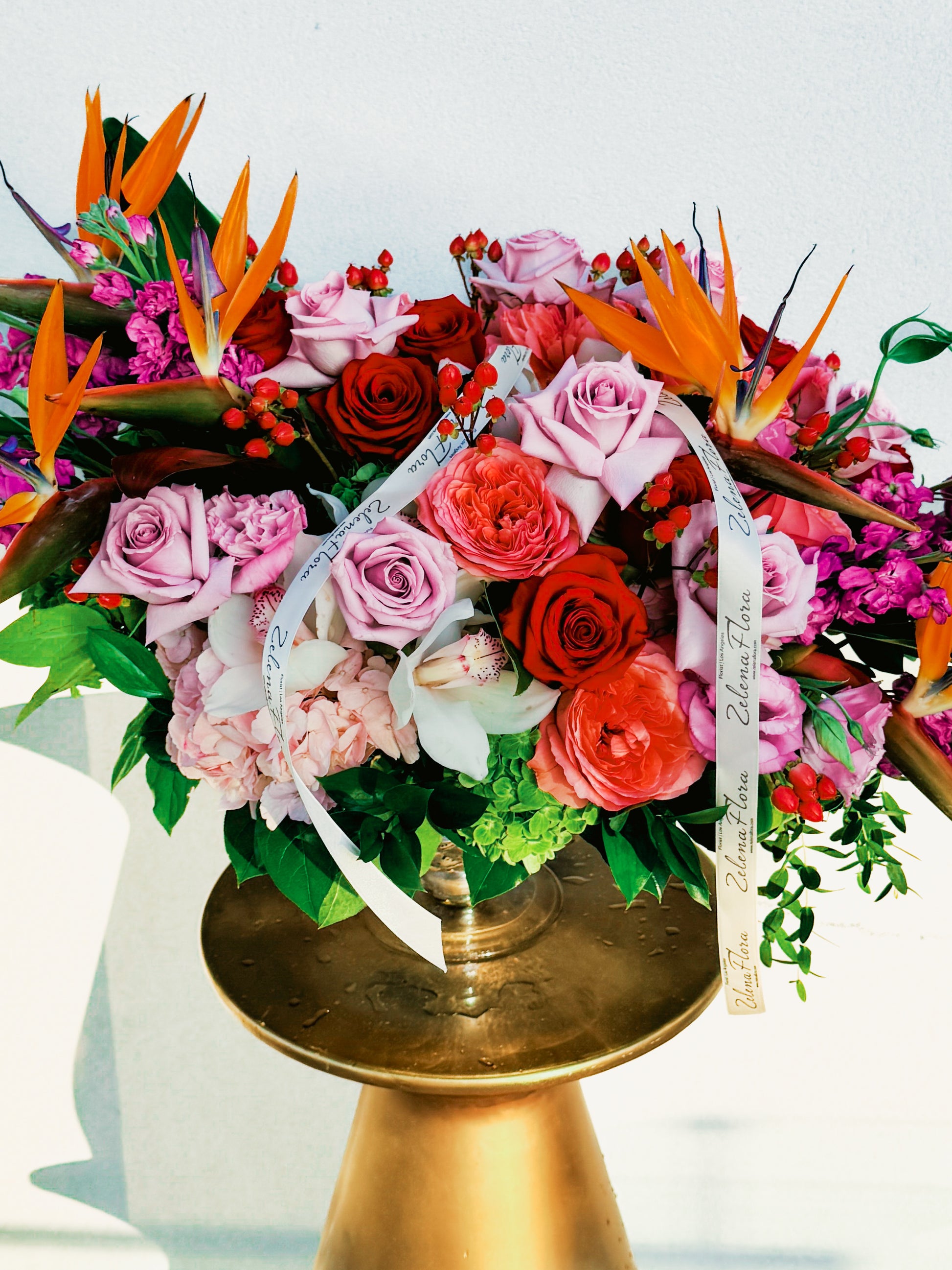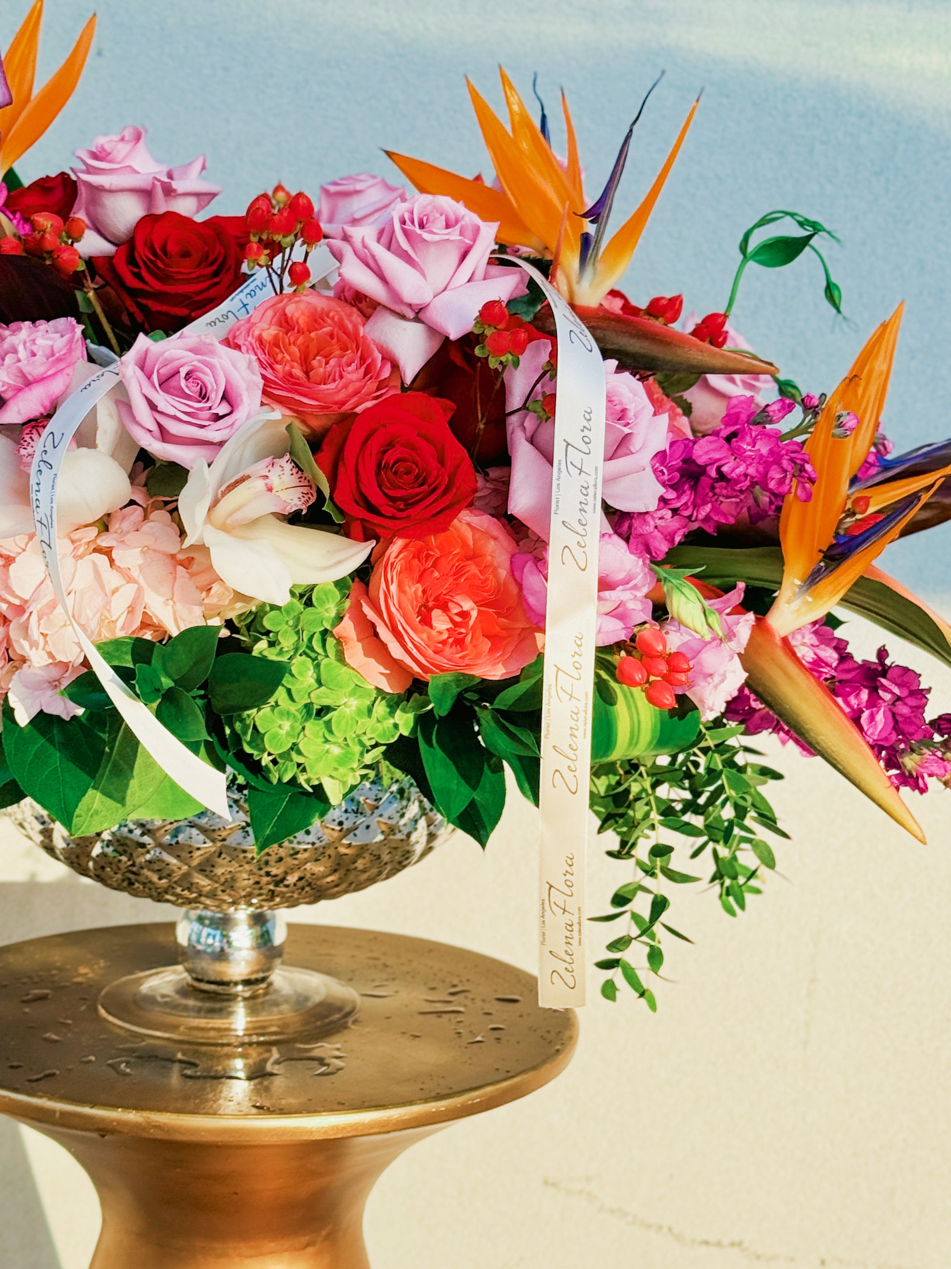 Big, lush, and totally regal. Crowned Cloud is Zelenaflora’s fall showpiece: a bold mix of garden roses, hydrangea, orchids, and six tropical Bird of Paradise “crowns” shooting up like fire. This is the centerpiece that stops the dinner party and makes everyone grab their phone for a photo.
