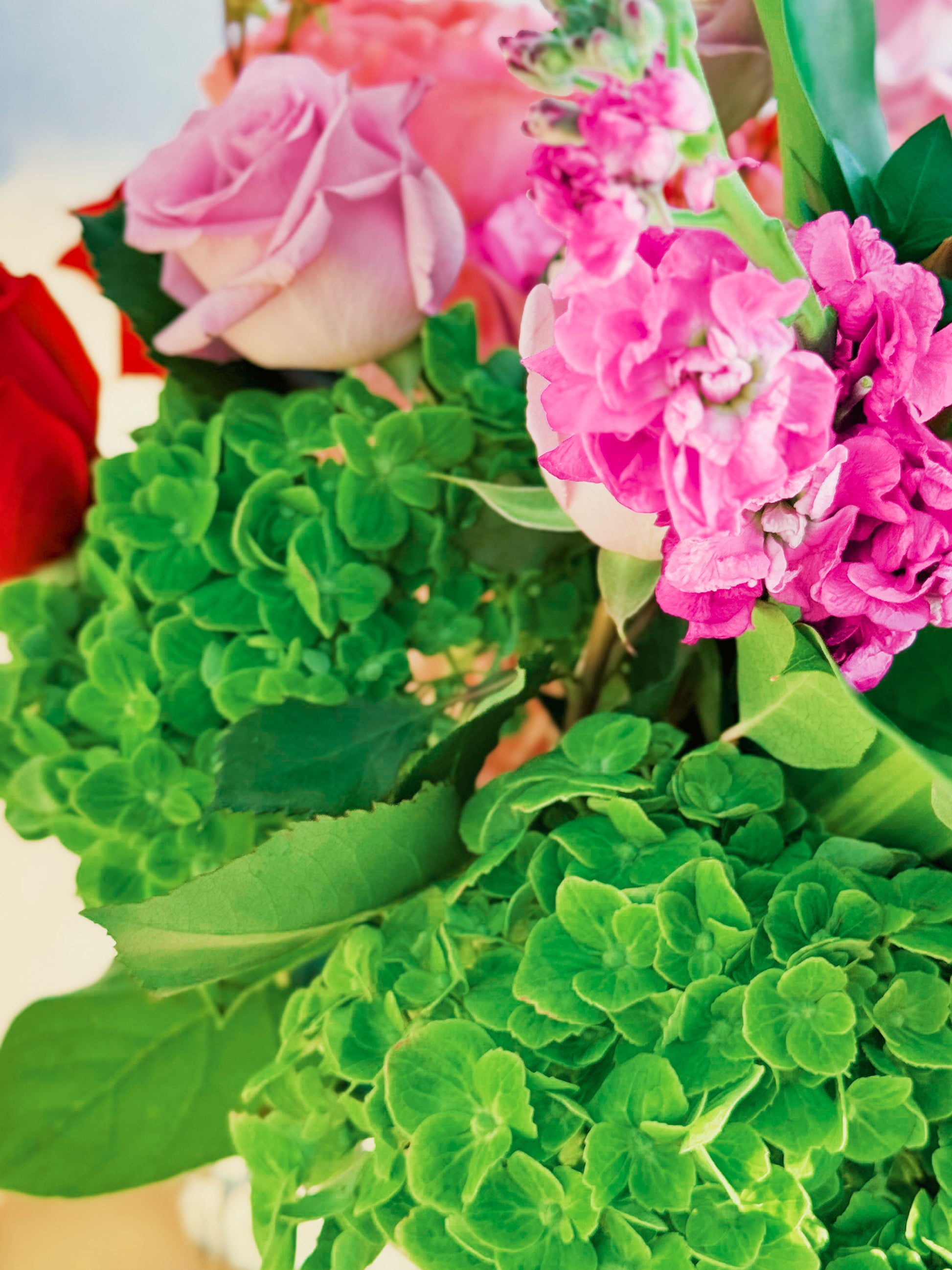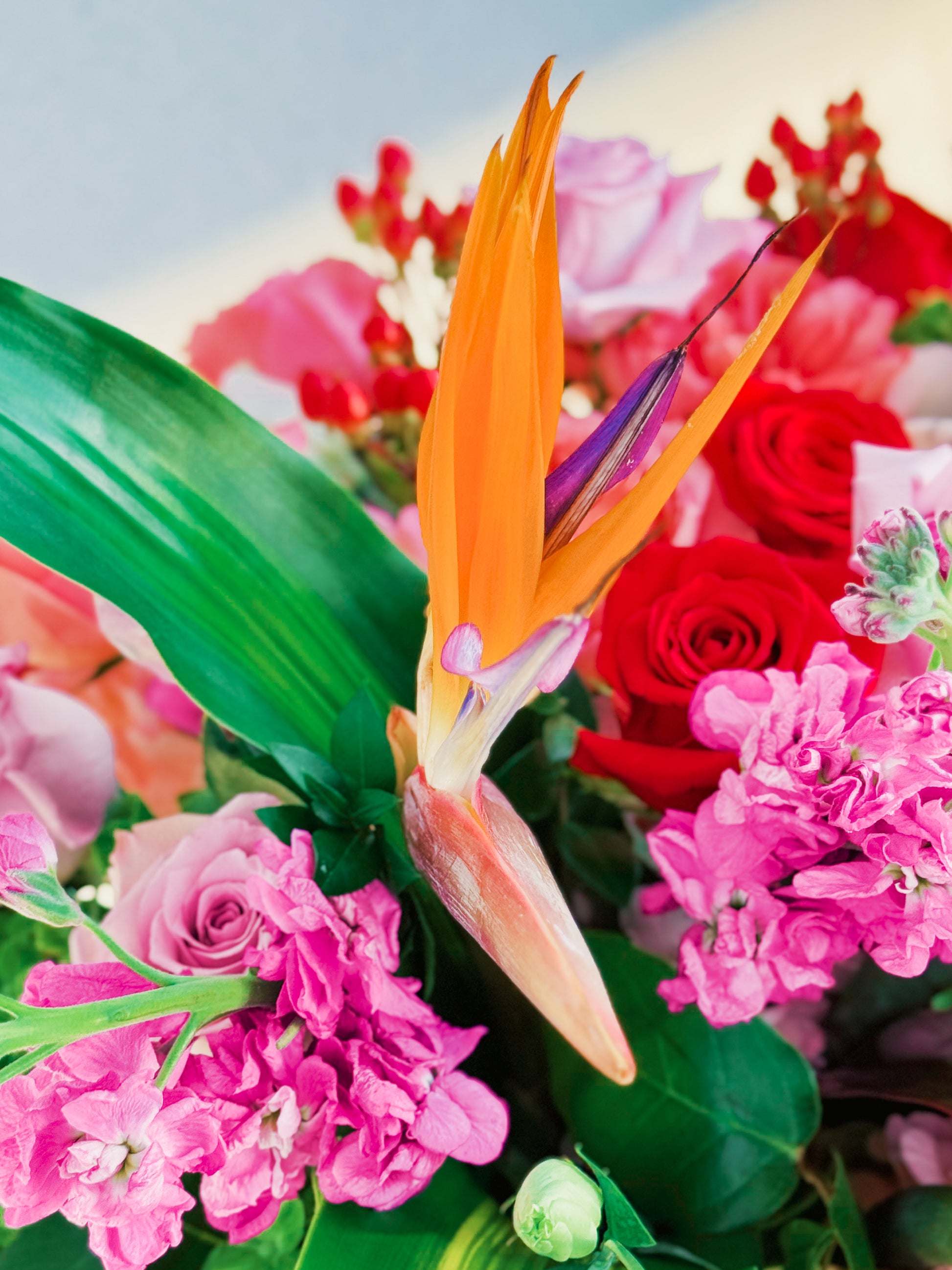 Garden Roses, Light Purple Roses, Red Roses, Pink Hydrangea, Green Hydrangea, Bird of Paradise, Stock, Cymbidium Orchids, Hypericum, Eucalyptus, Decorative Greenery (salal, ruscus, seasonal trailing greens).