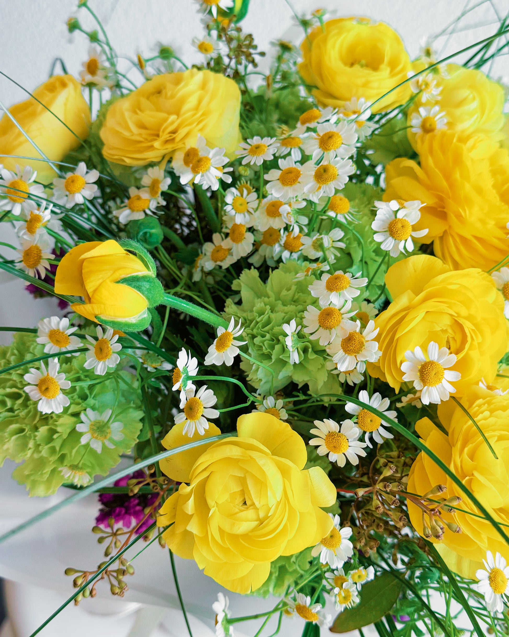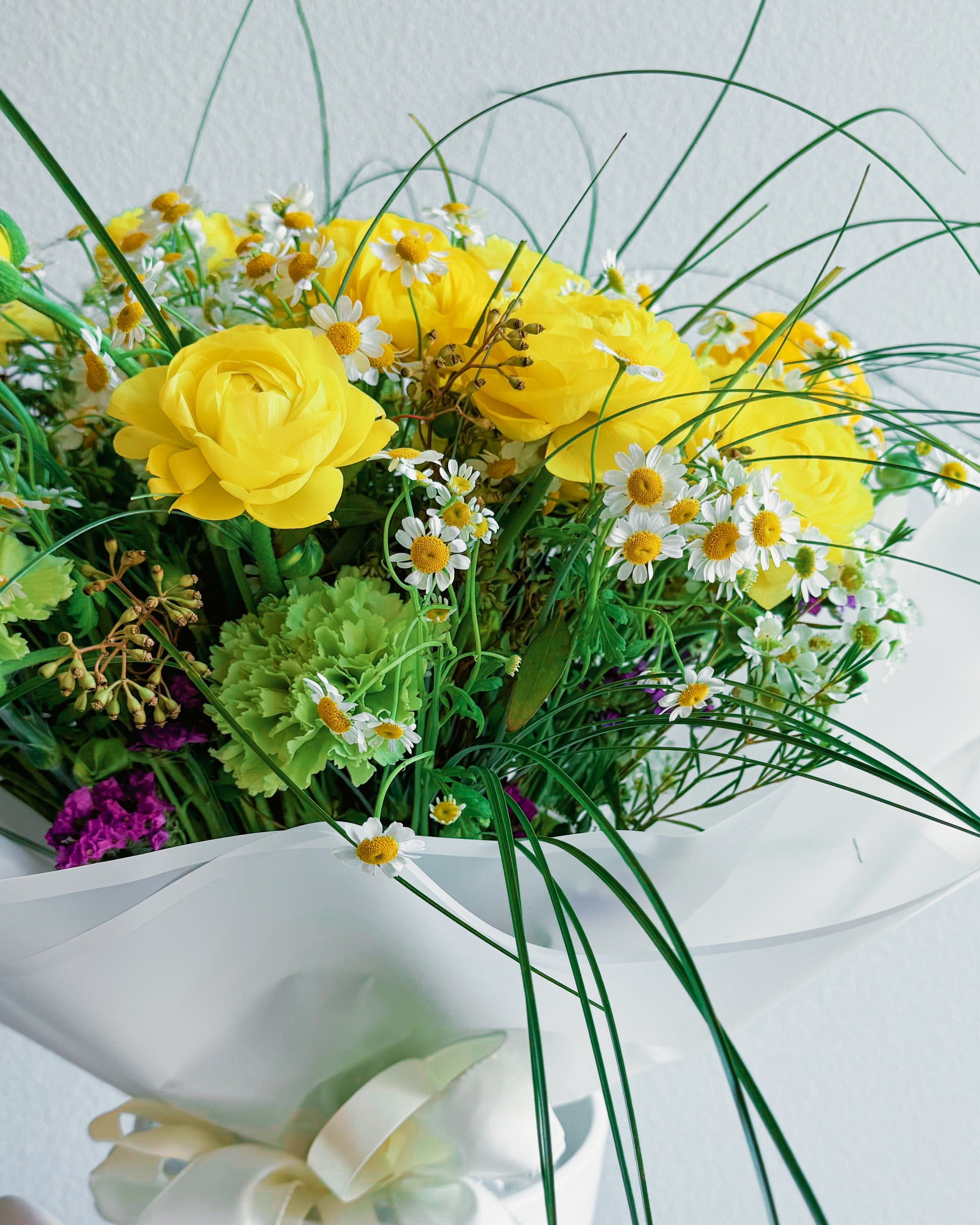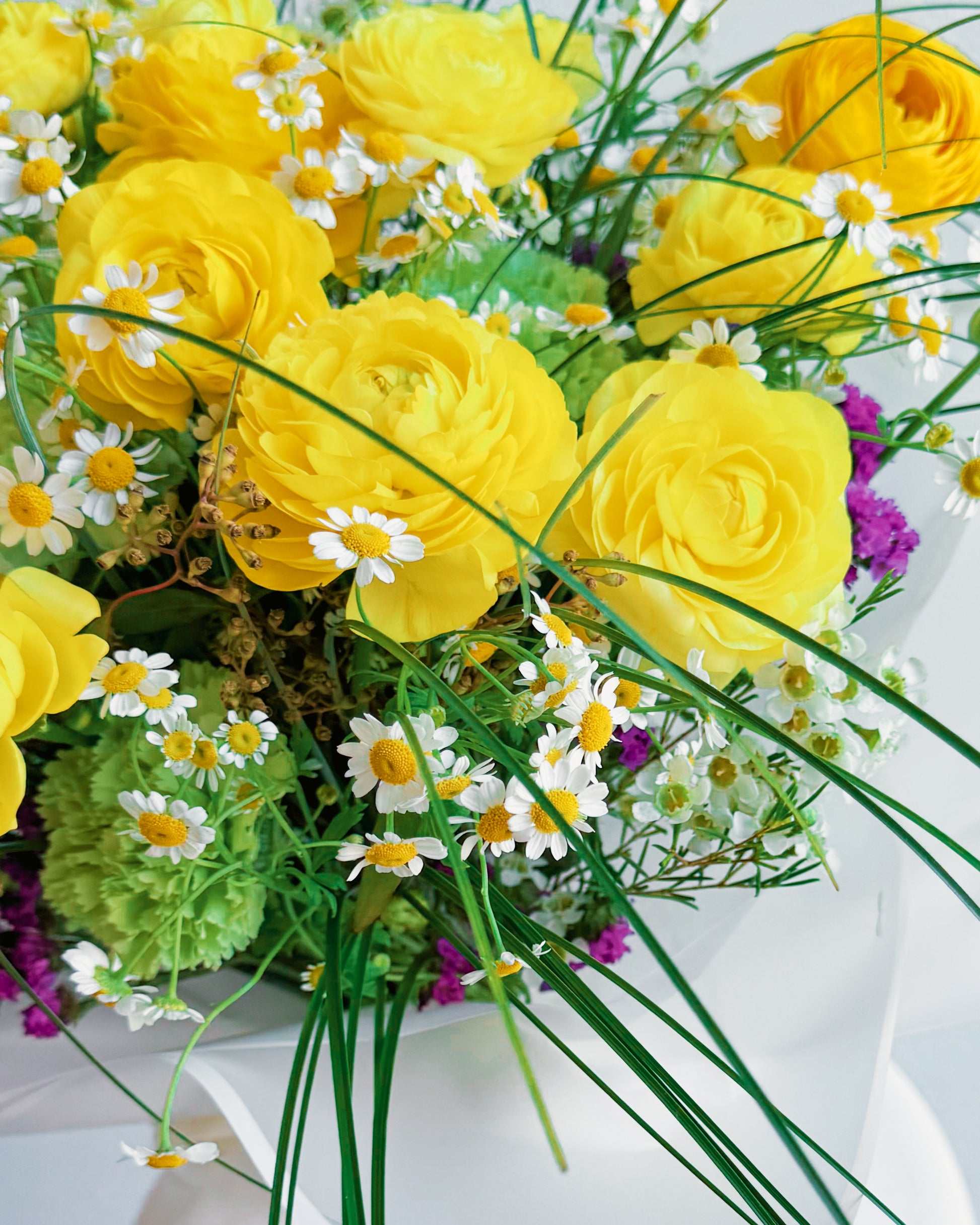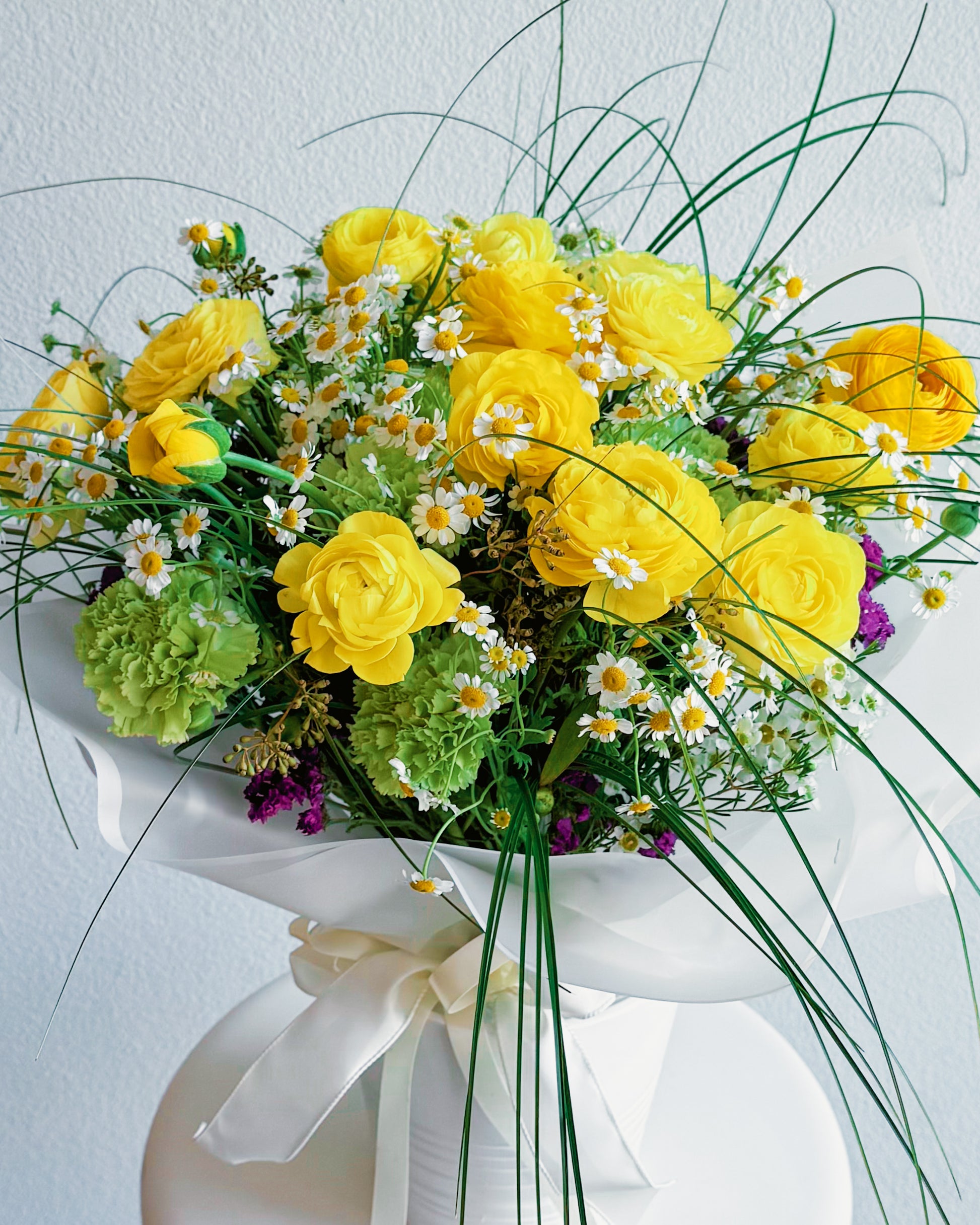 Yellow ranunculus, Chamomile daisies, Green carnations, Statice (purple filler flowers), Bear grass loops, Seasonal greens, White wrapping paper with a satin ribbon.