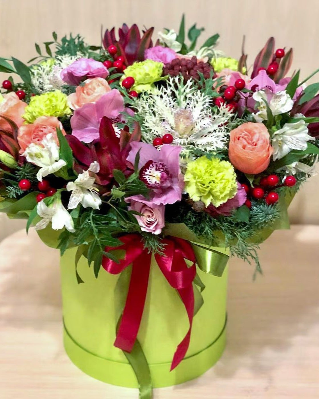 Roses, carnations, orchids, red berries, and greenery, arranged in a light green box with a red ribbon.
