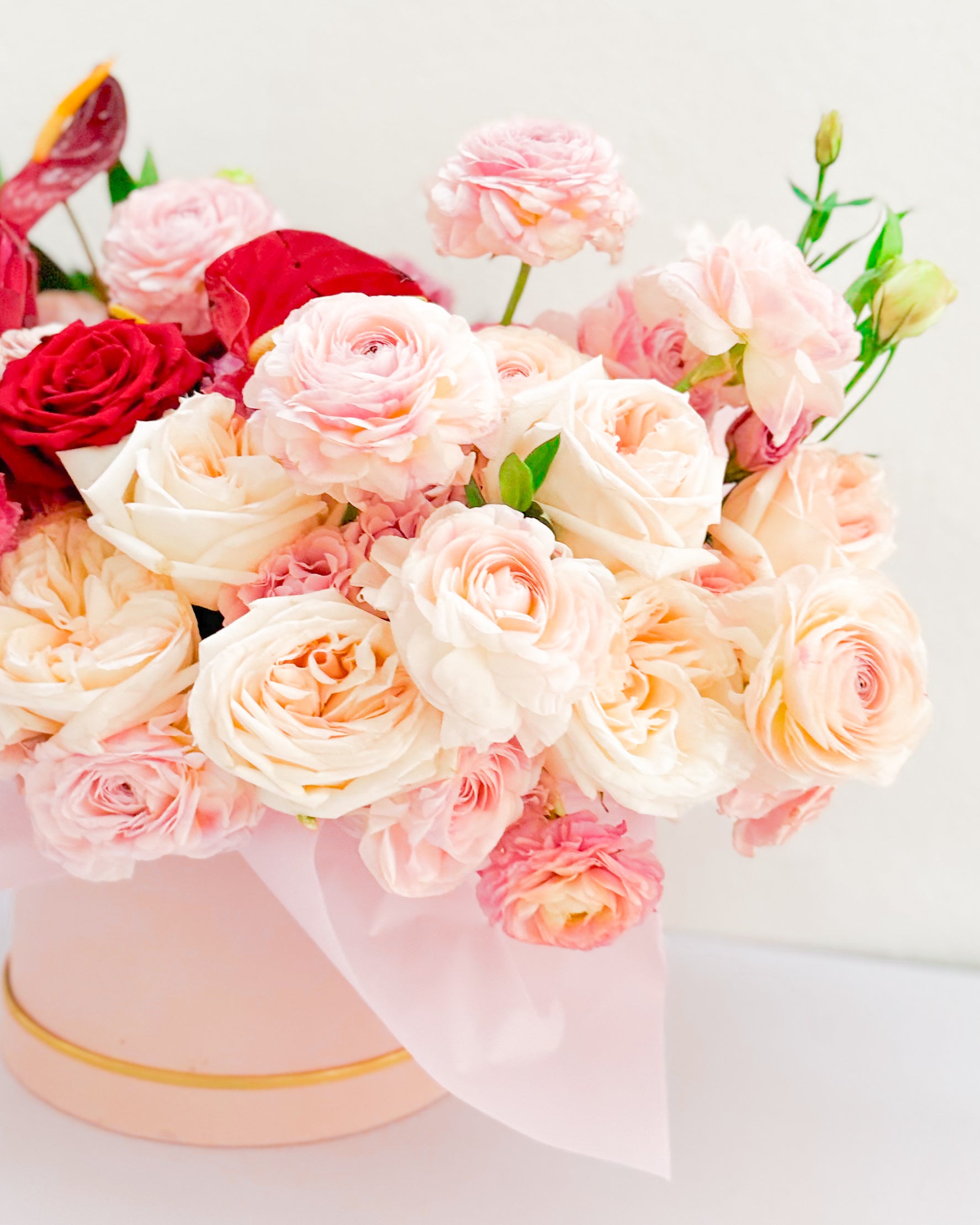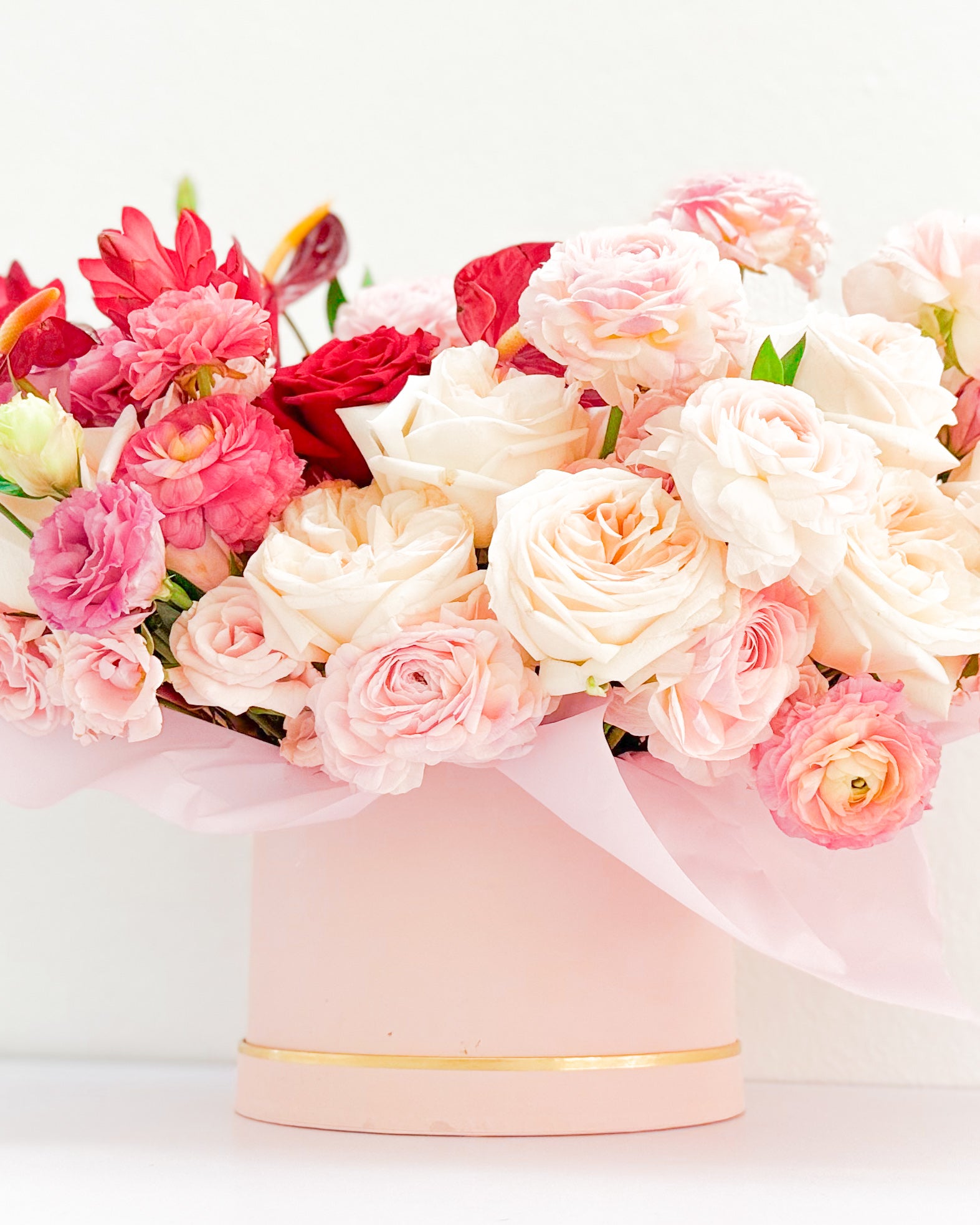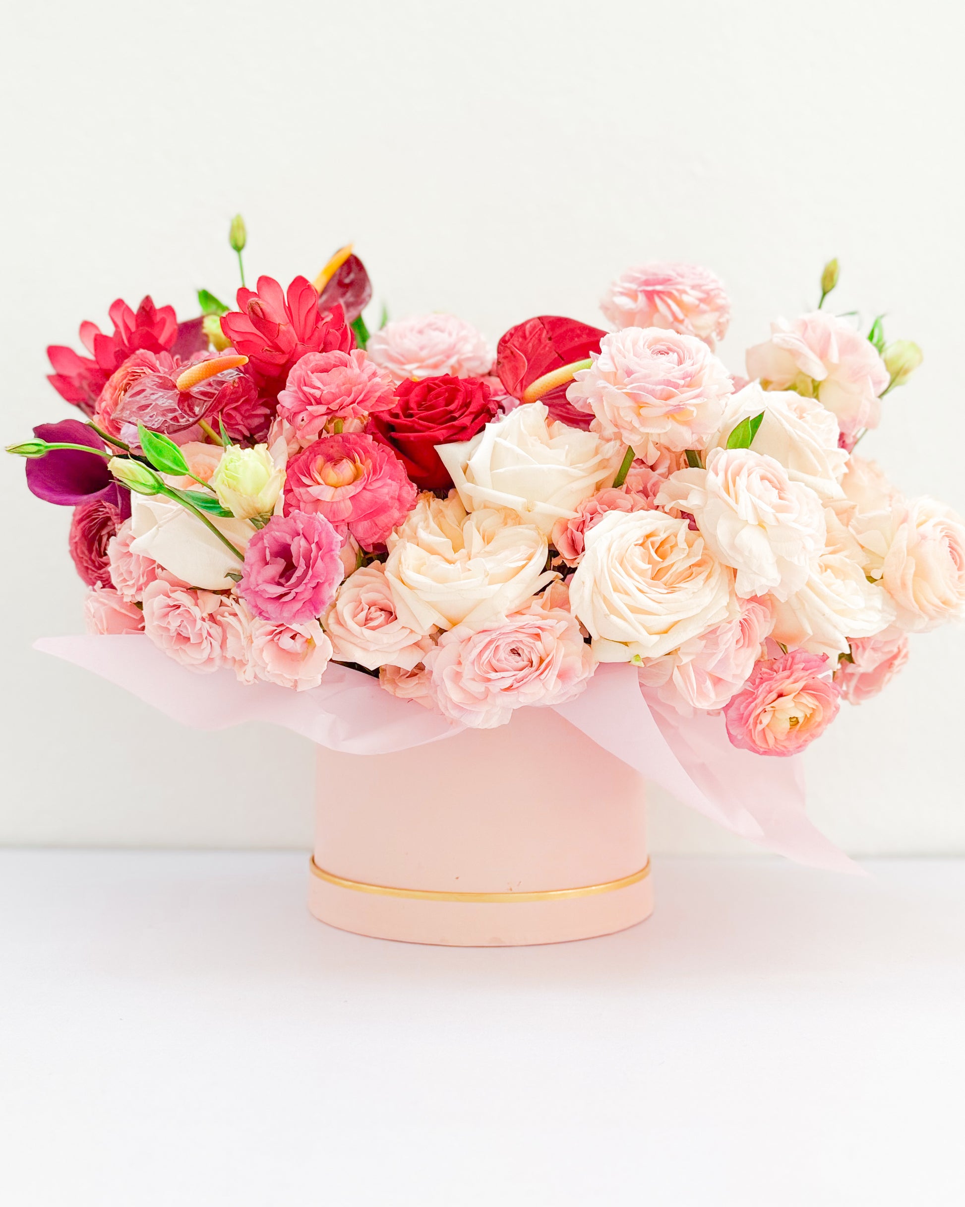 Fresh florals, Luxury hatbox, Sheer wrapping paper, Satin ribbon.
