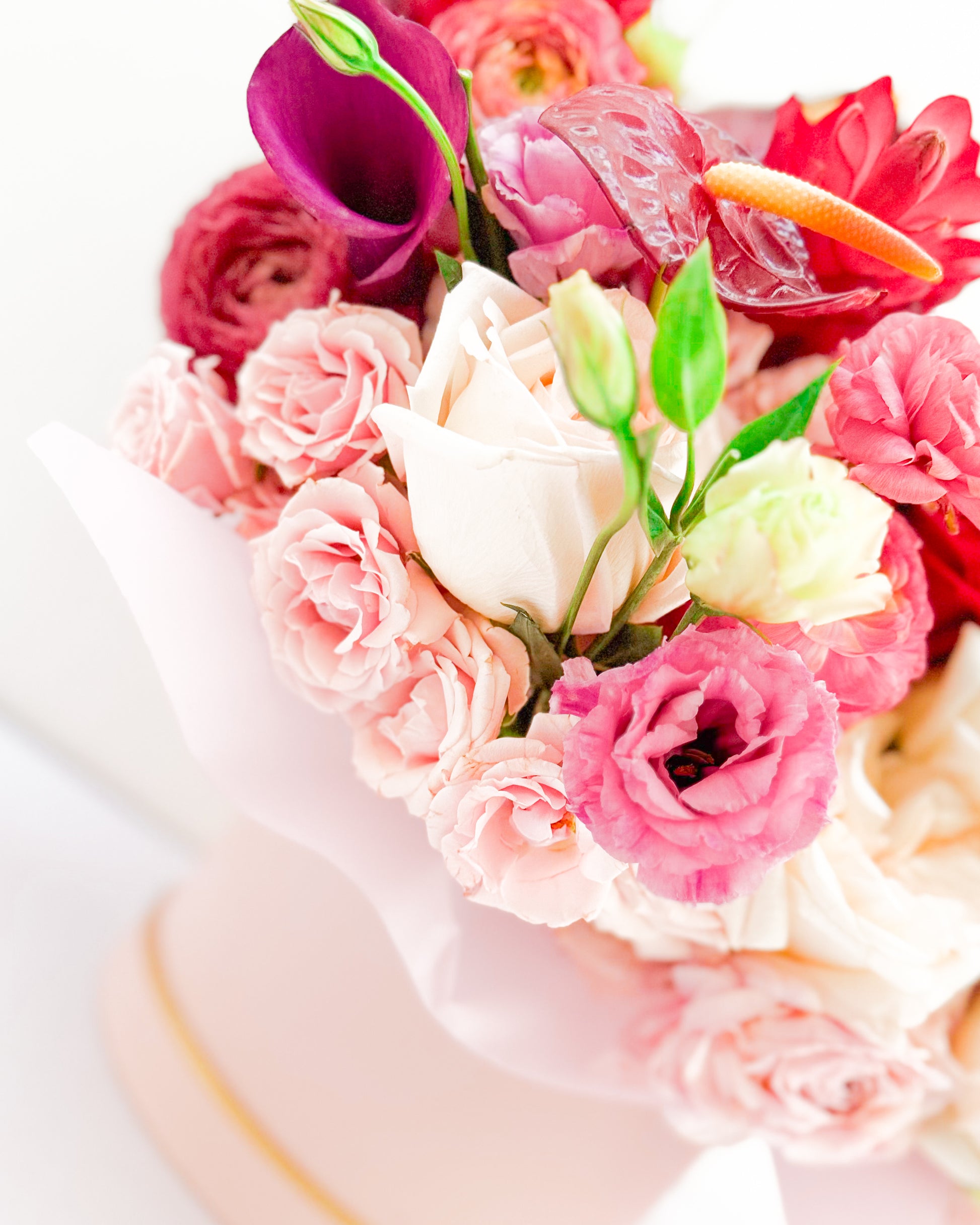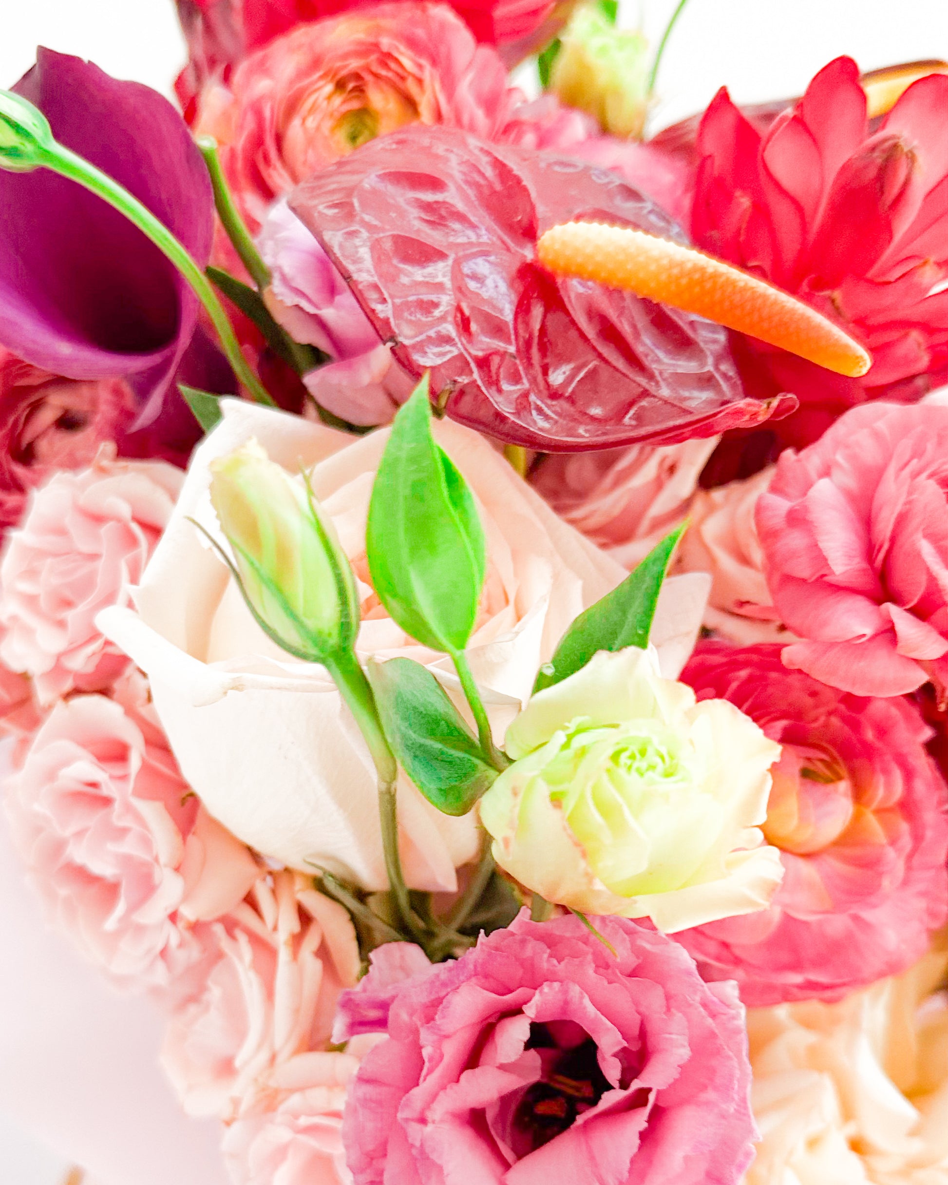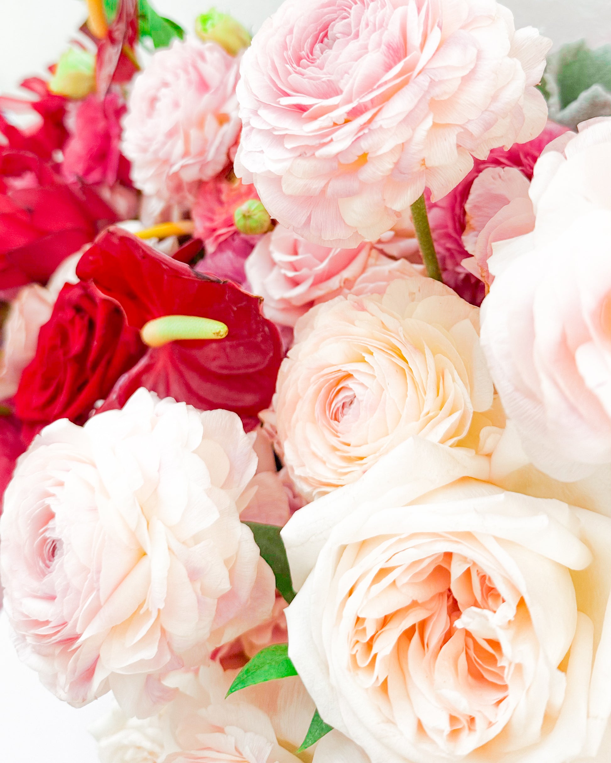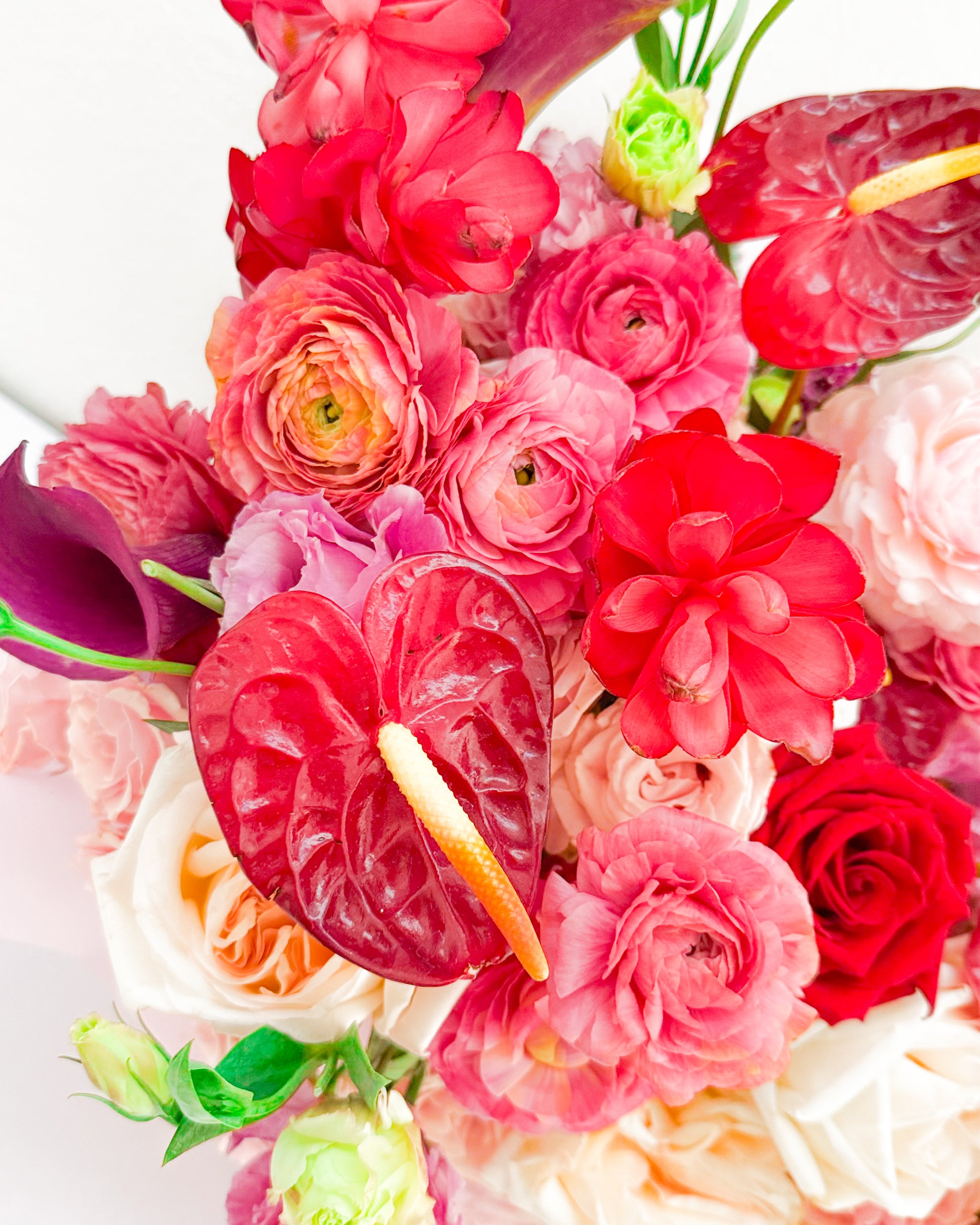 Flowers: Garden roses, ranunculus, anthuriums, lisianthus.