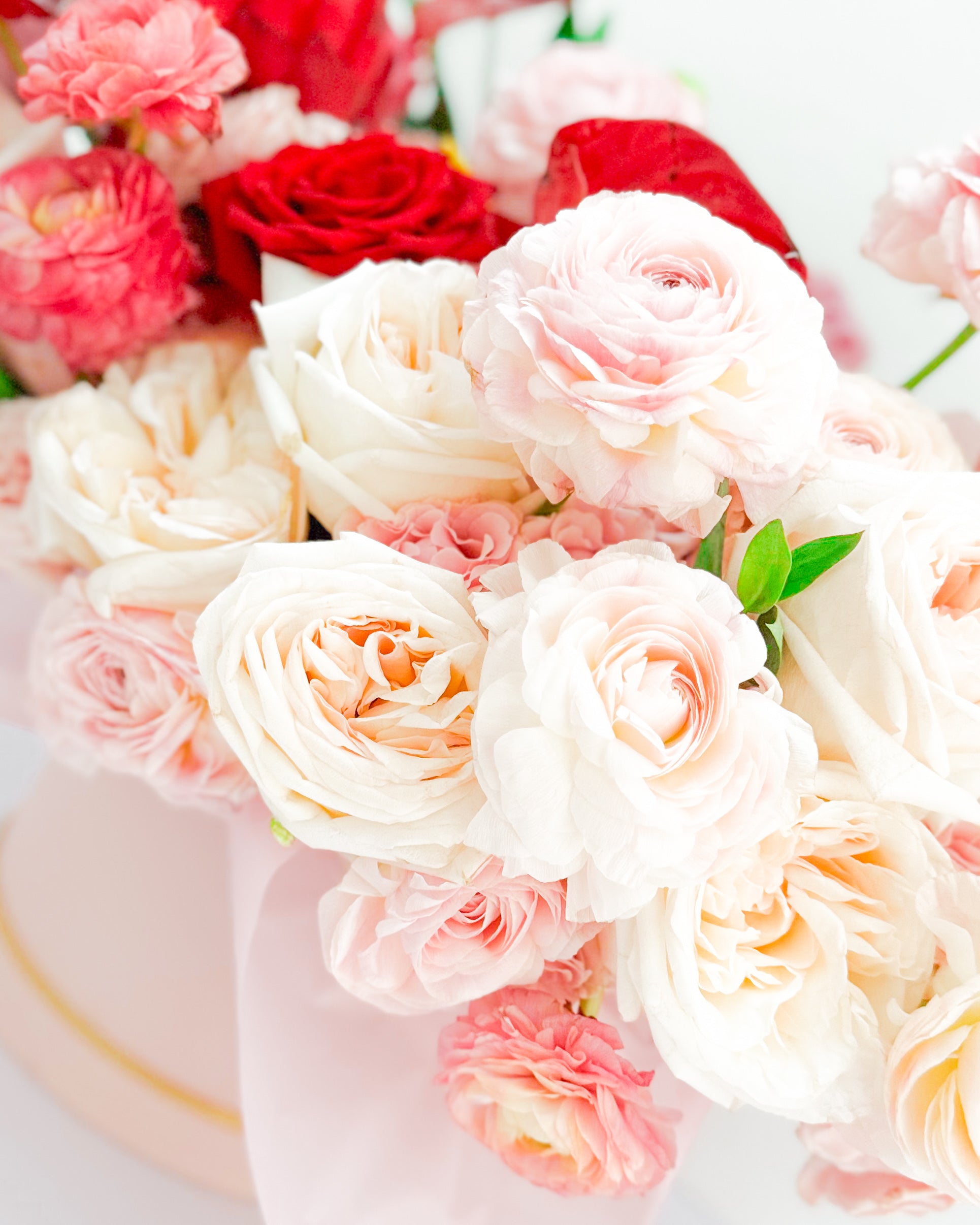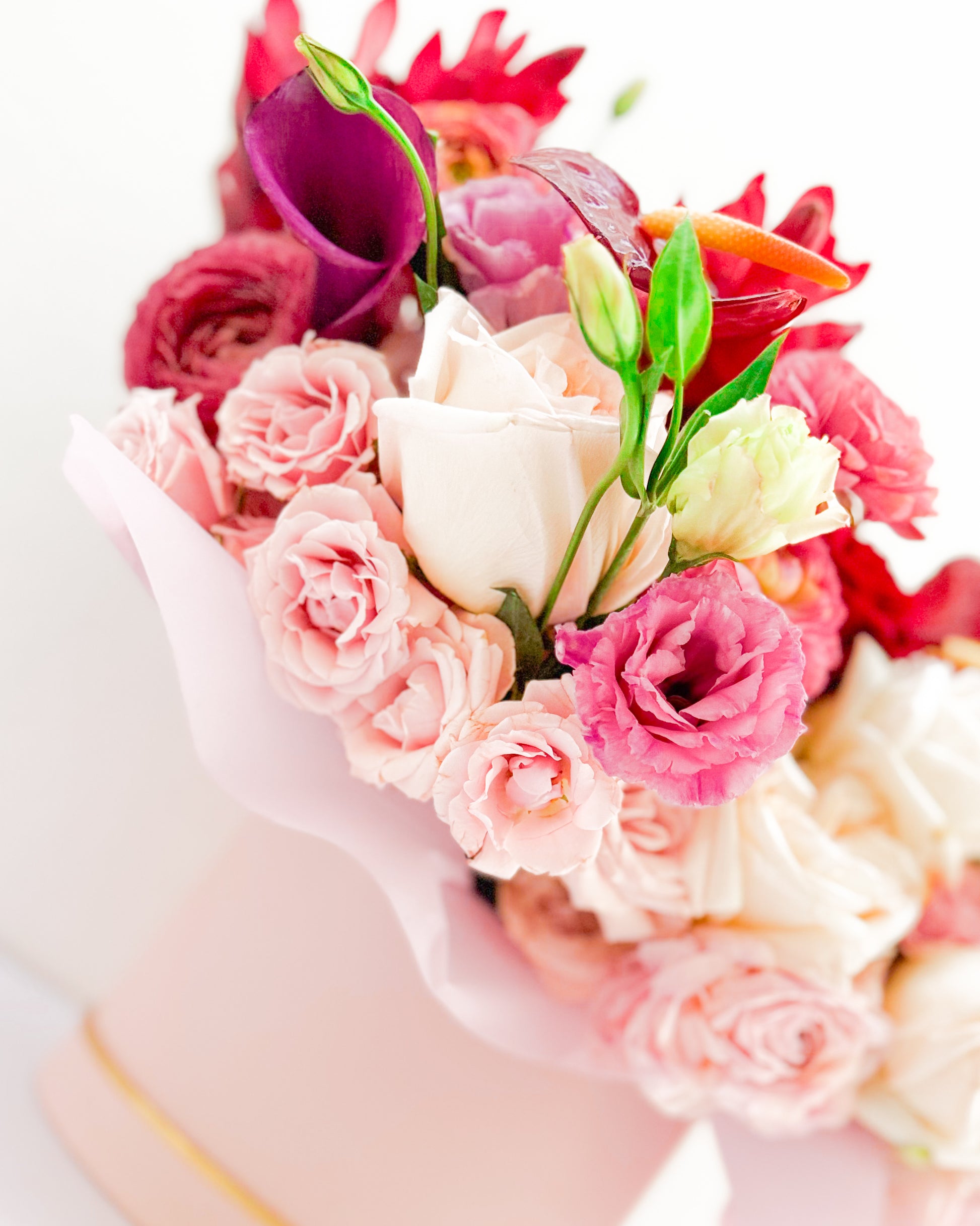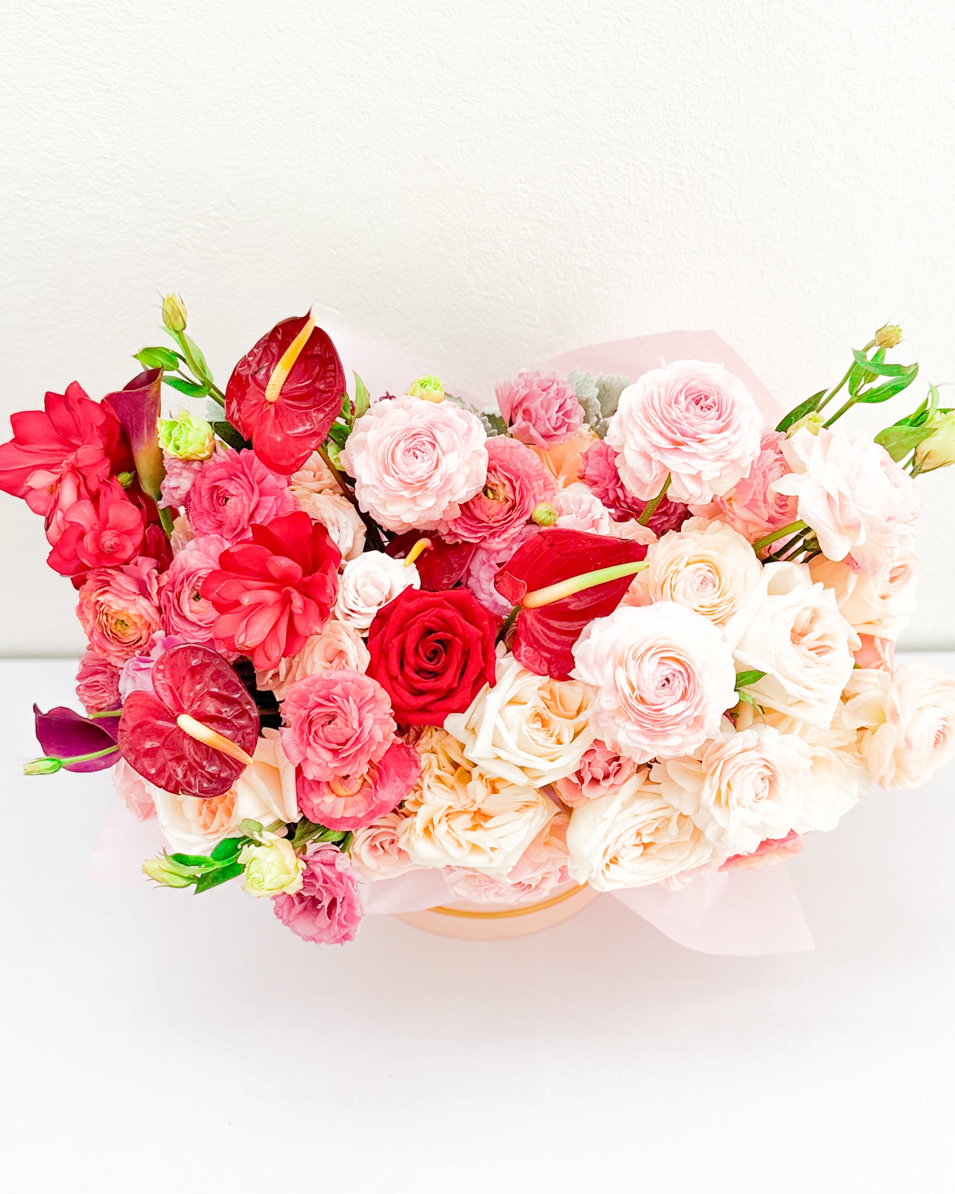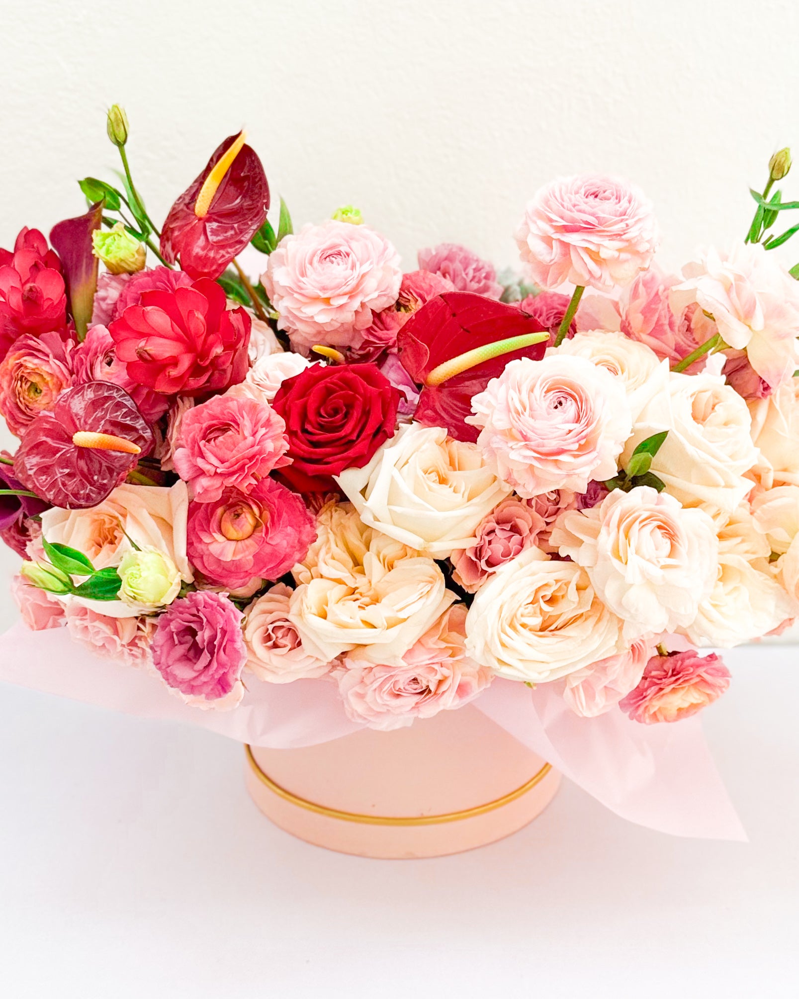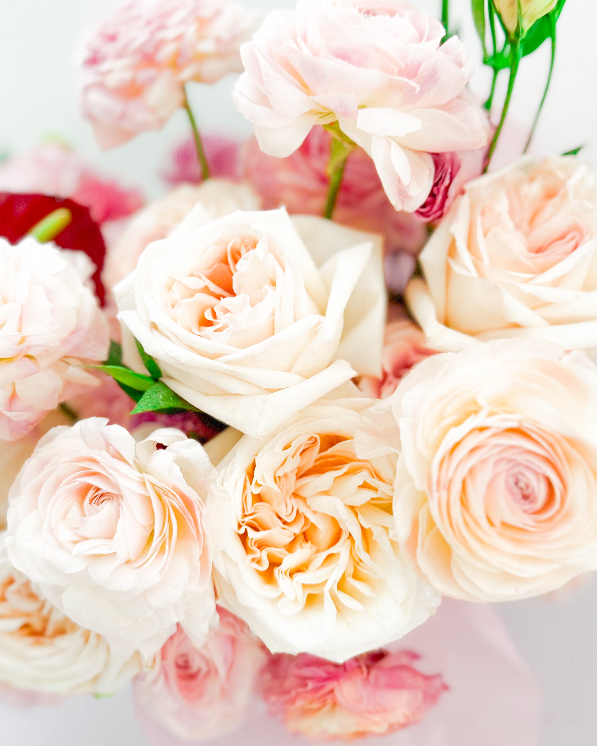 Flowers: Garden roses, ranunculus, anthuriums, lisianthus.