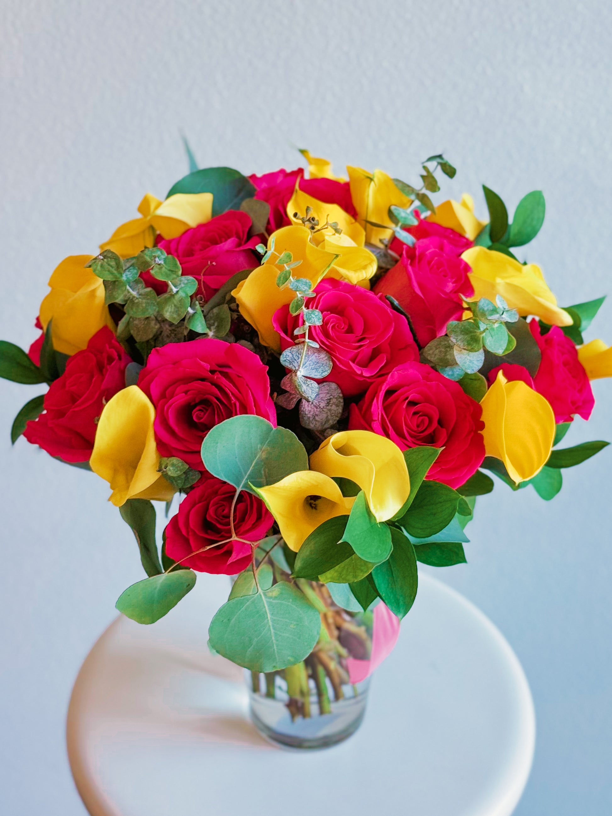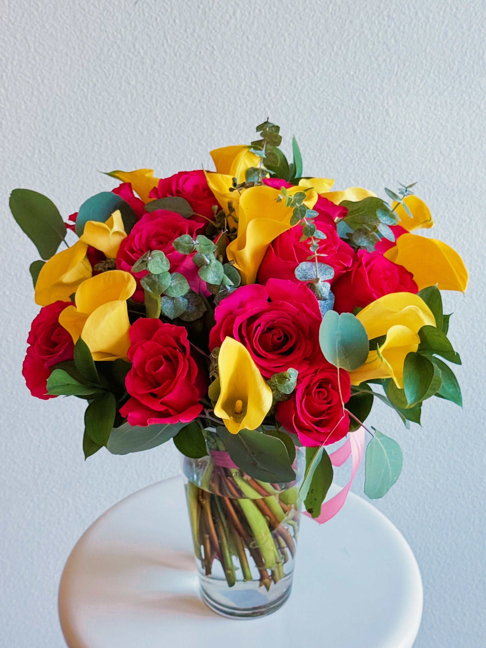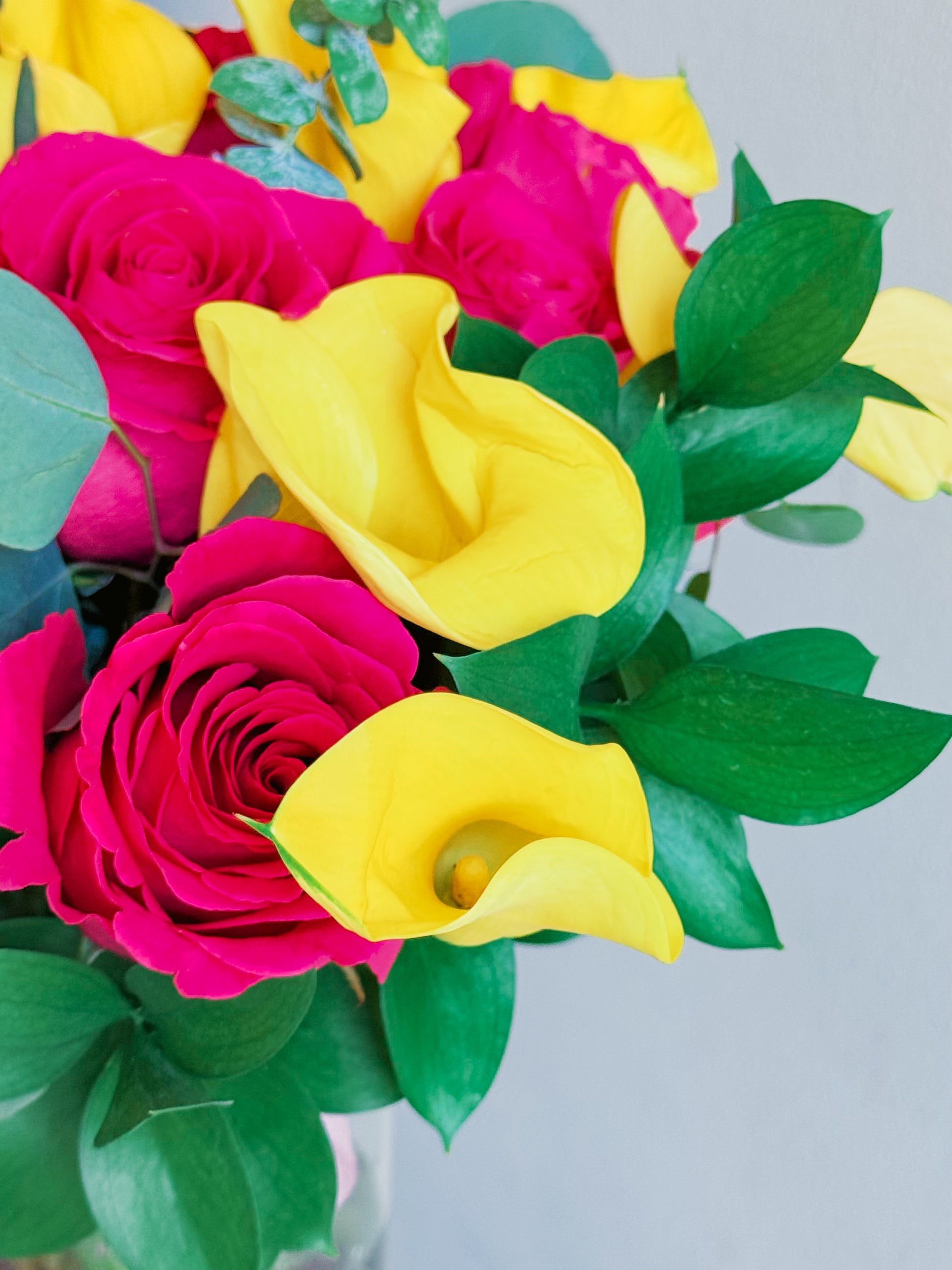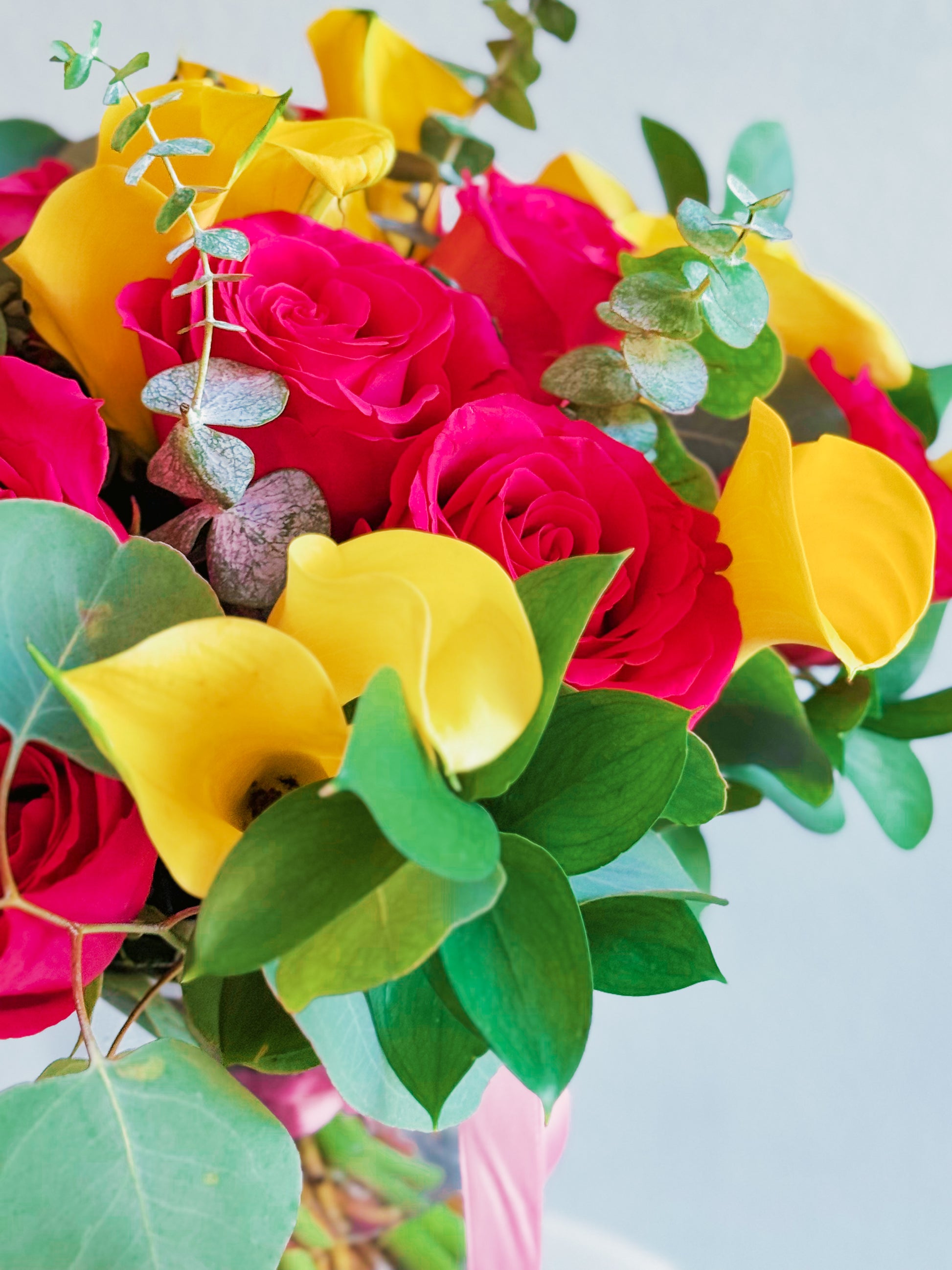 Hot pink roses, Yellow calla lilies, Eucalyptus (seeded or silver dollar), Mixed tropical greenery (optional accent).
