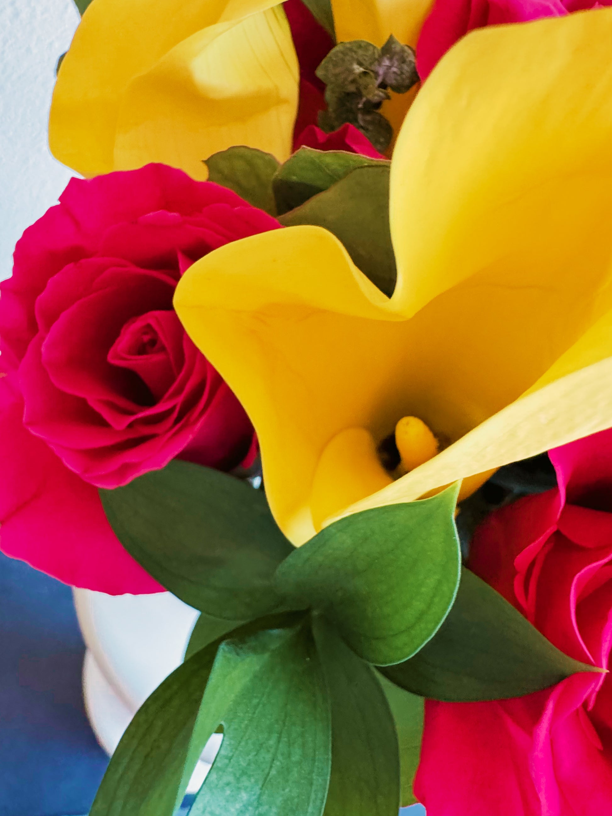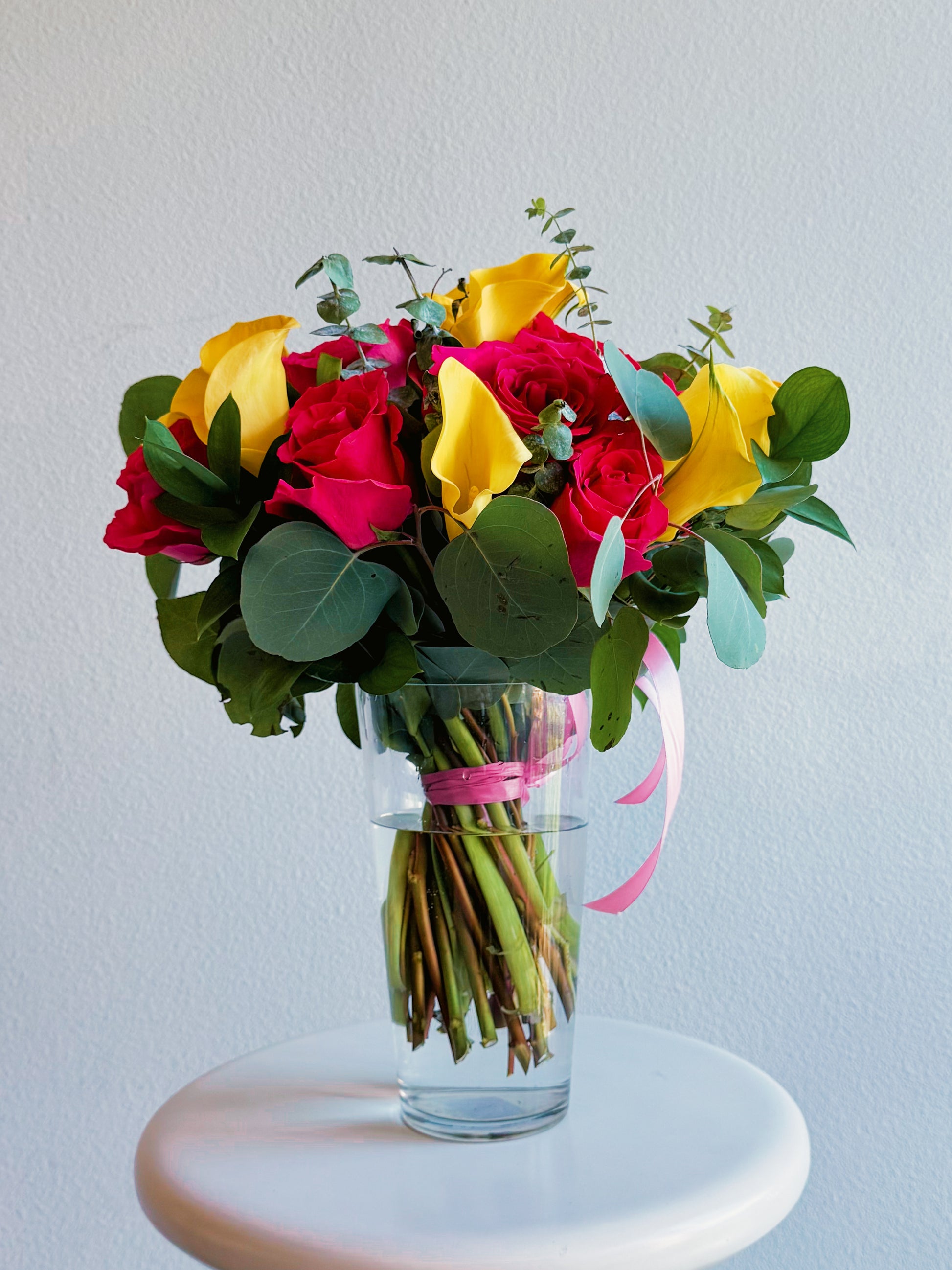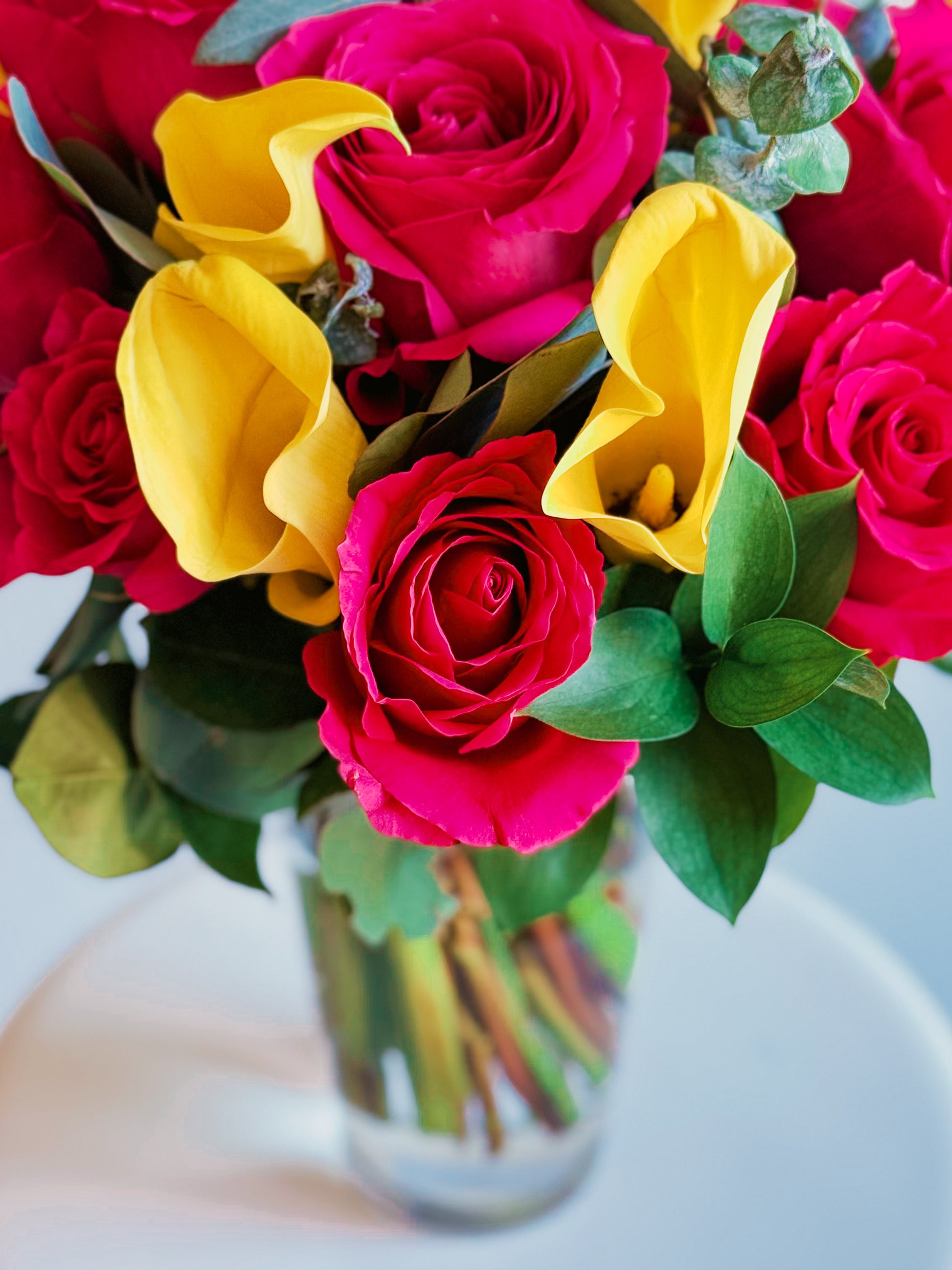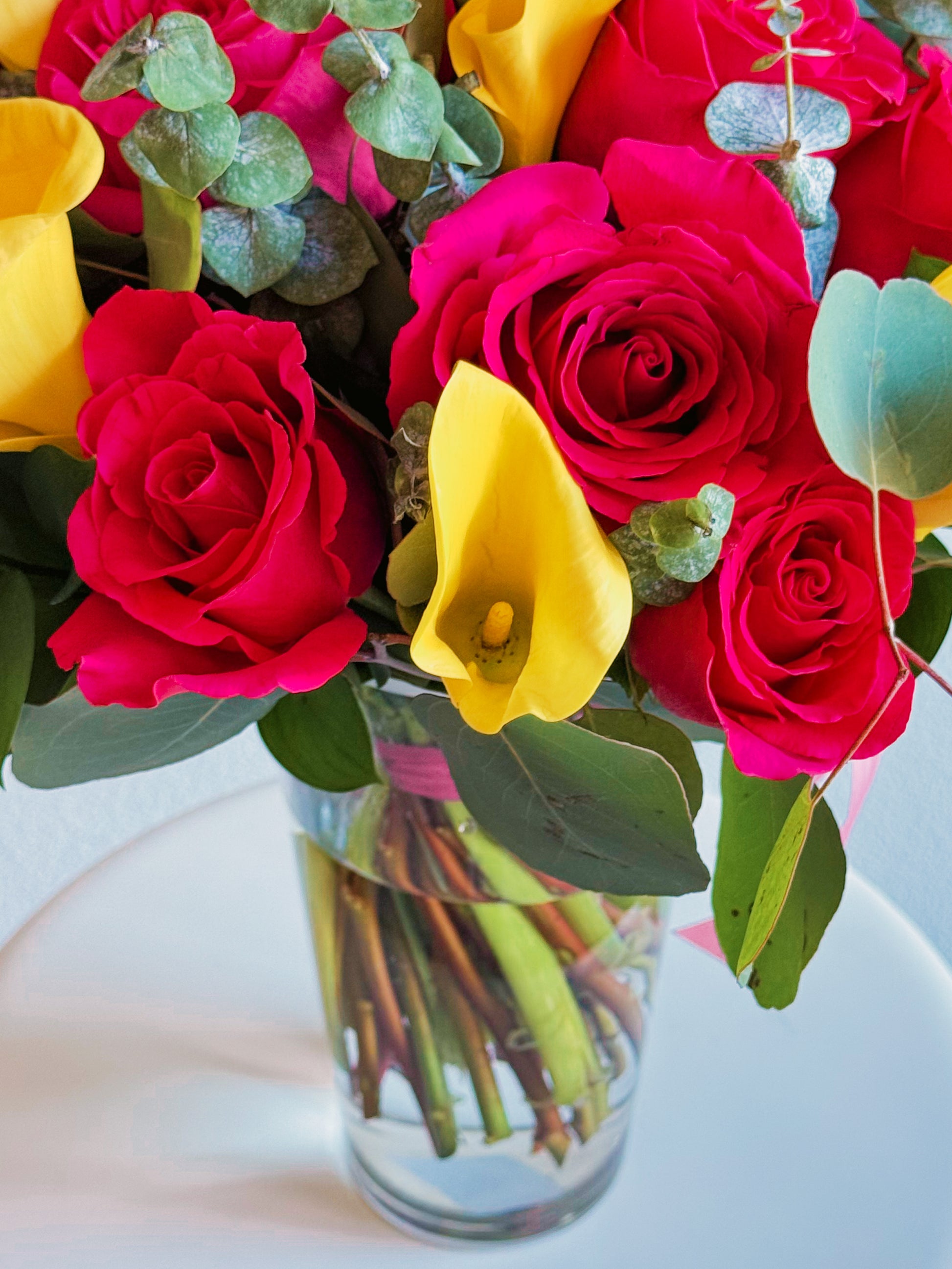 Hot pink roses, Yellow calla lilies, Eucalyptus (seeded or silver dollar), Mixed tropical greenery (optional accent).