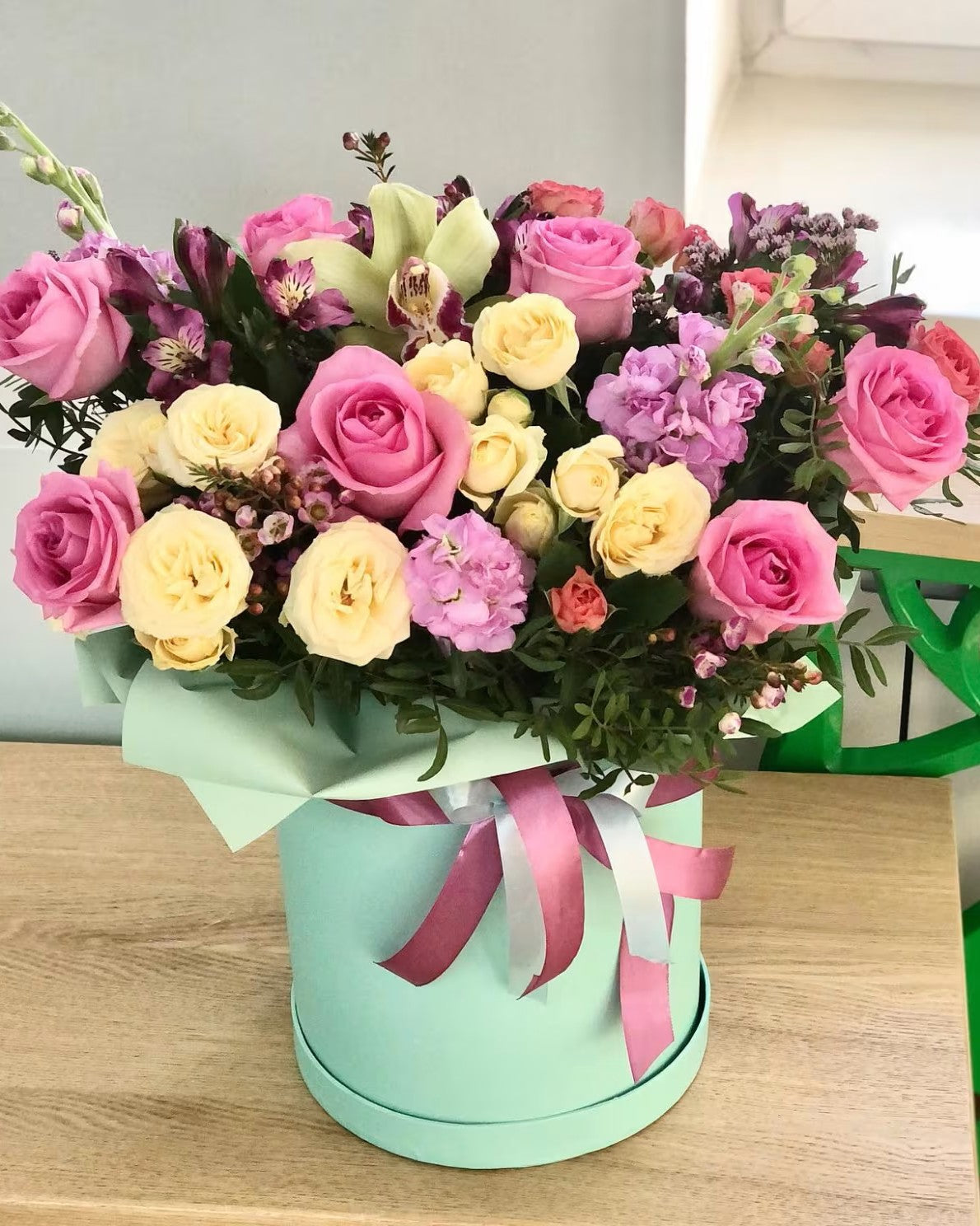 This is a beautiful and original box with flowers that can be used as a gift or interior decoration. It consists of pink and yellow roses, mothiola rosea, orchids, limonium, and greenery.