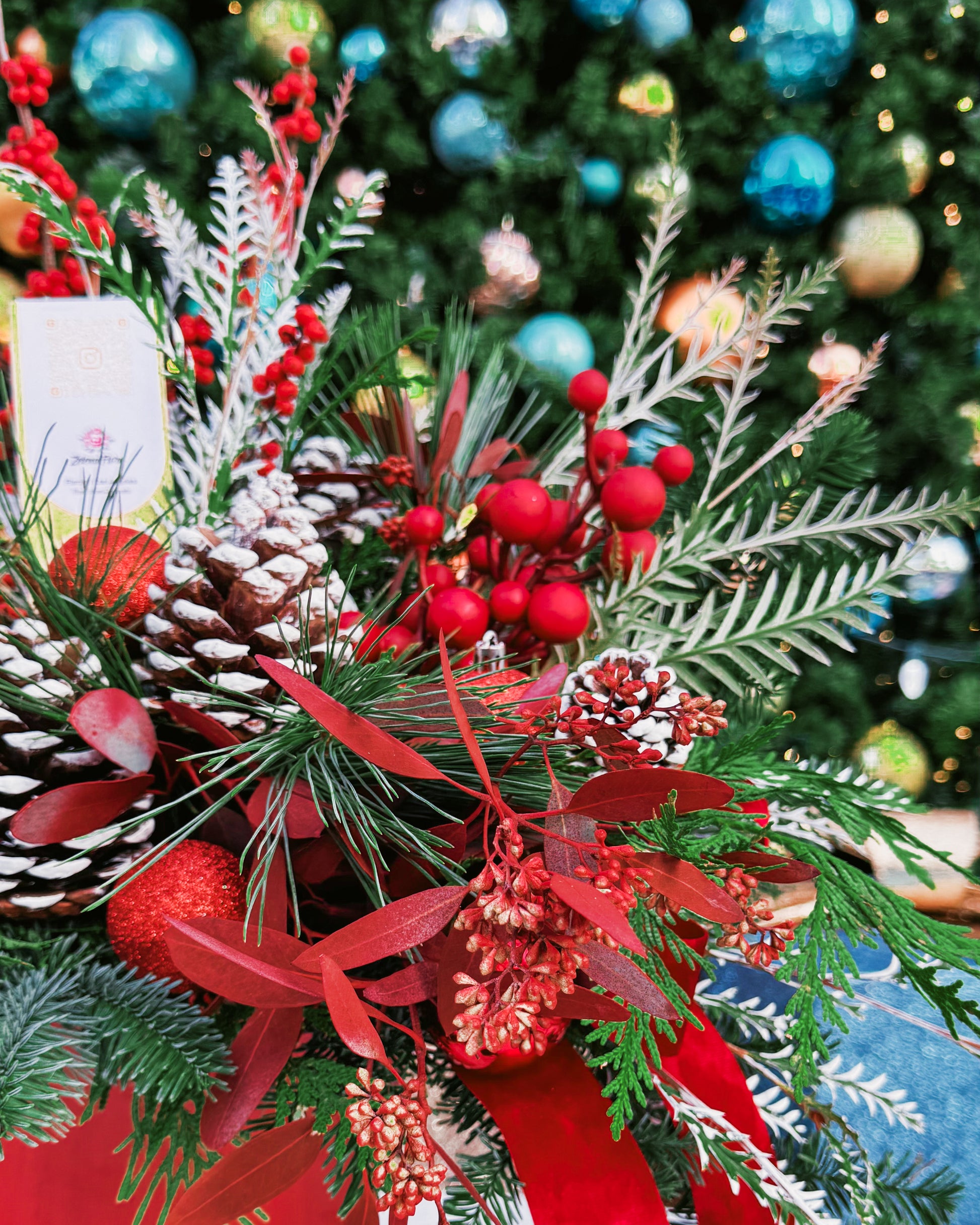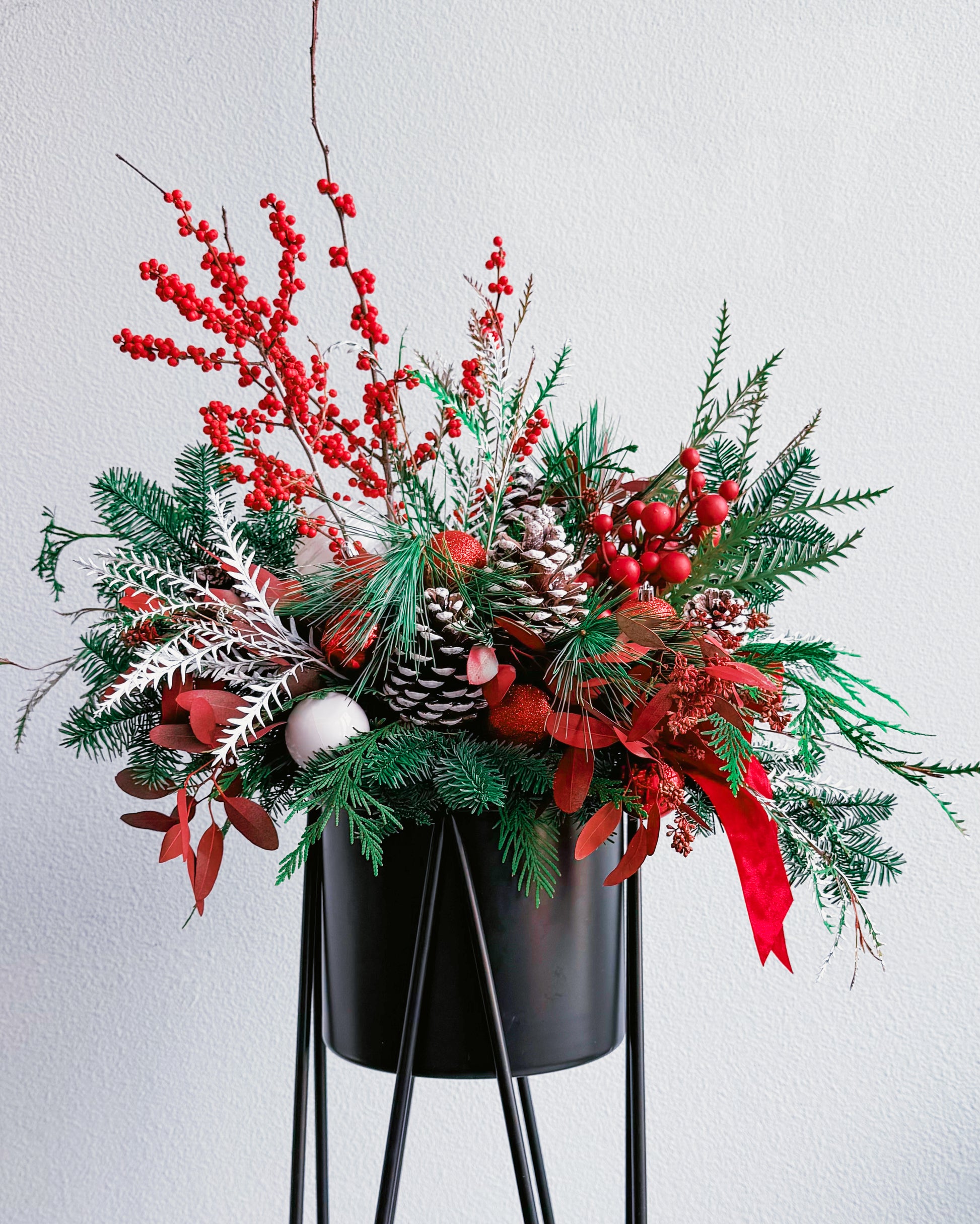 The bouquet showcases a modern holiday style, blending traditional Christmas colors with contemporary design elements, making it a statement piece for any winter setting.
