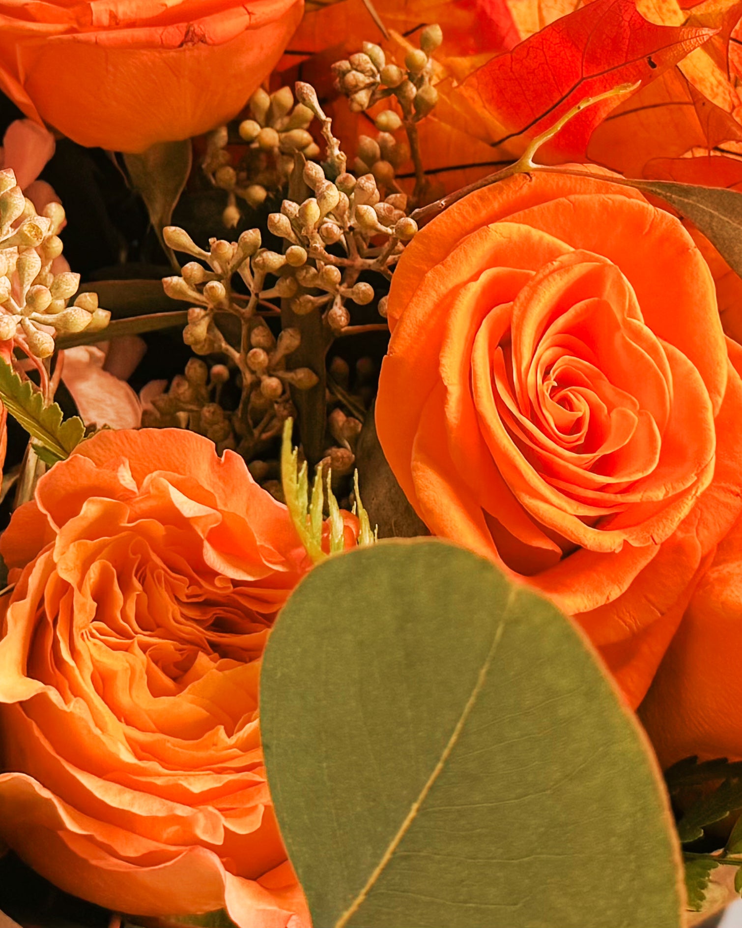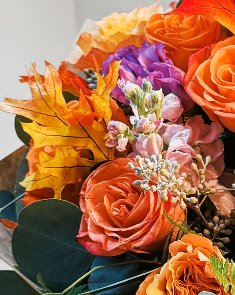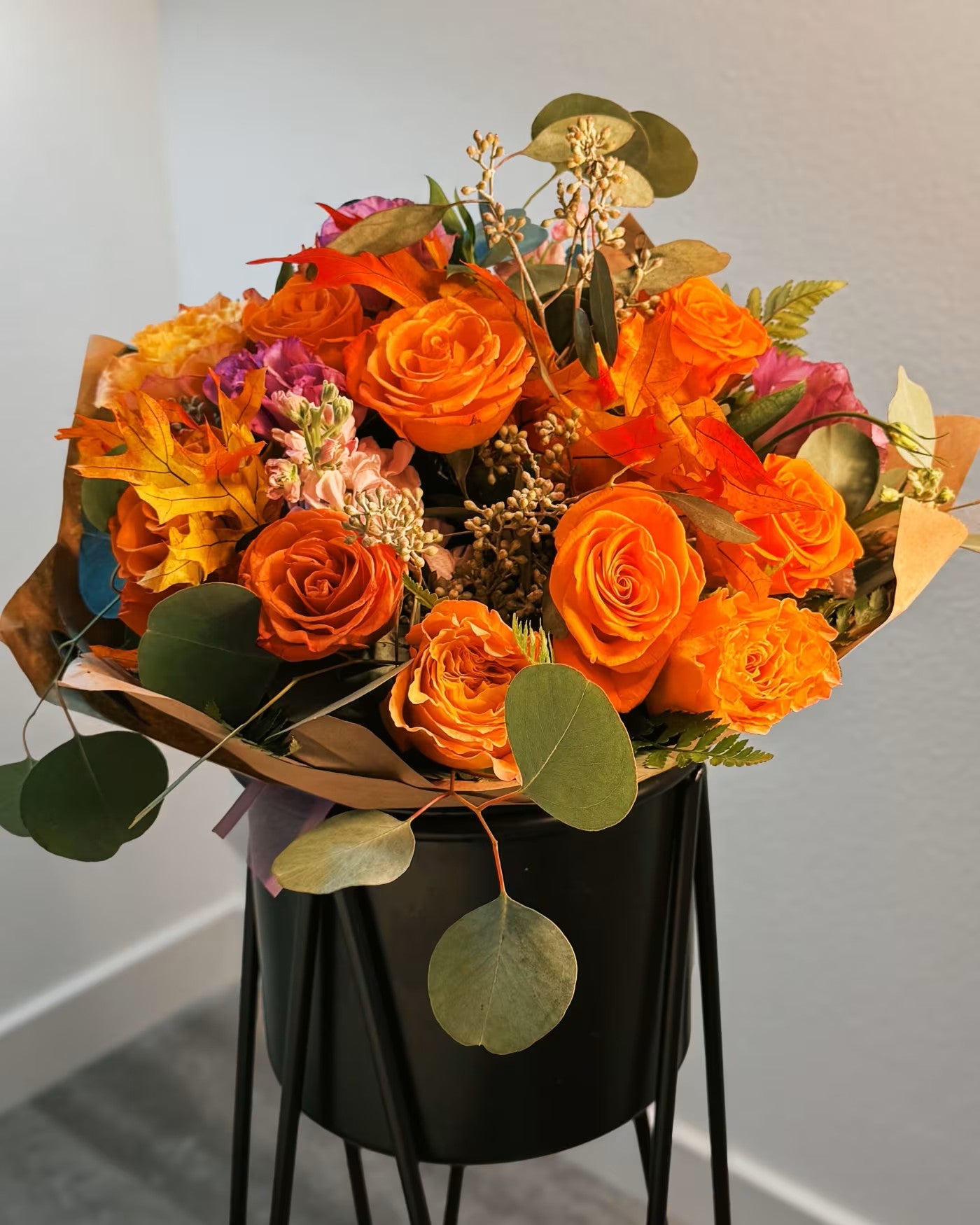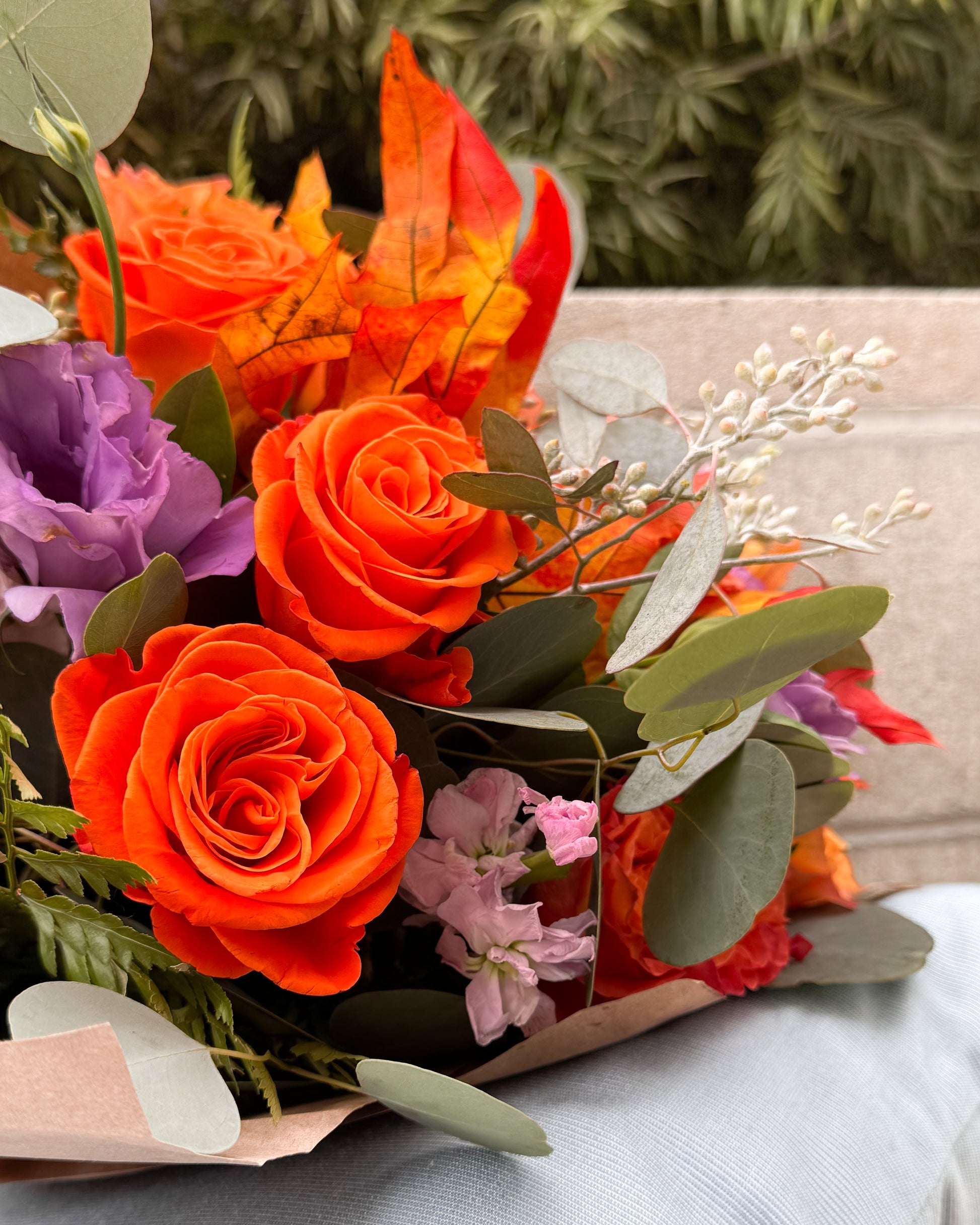 This fiery bouquet captures the essence of autumn with its vibrant orange roses, golden chrysanthemums, and touches of delicate peach stock. Accented with preserved fall leaves, eucalyptus, and rustic wrapping paper, it evokes a cozy, warm ambiance that celebrates the beauty of the season.