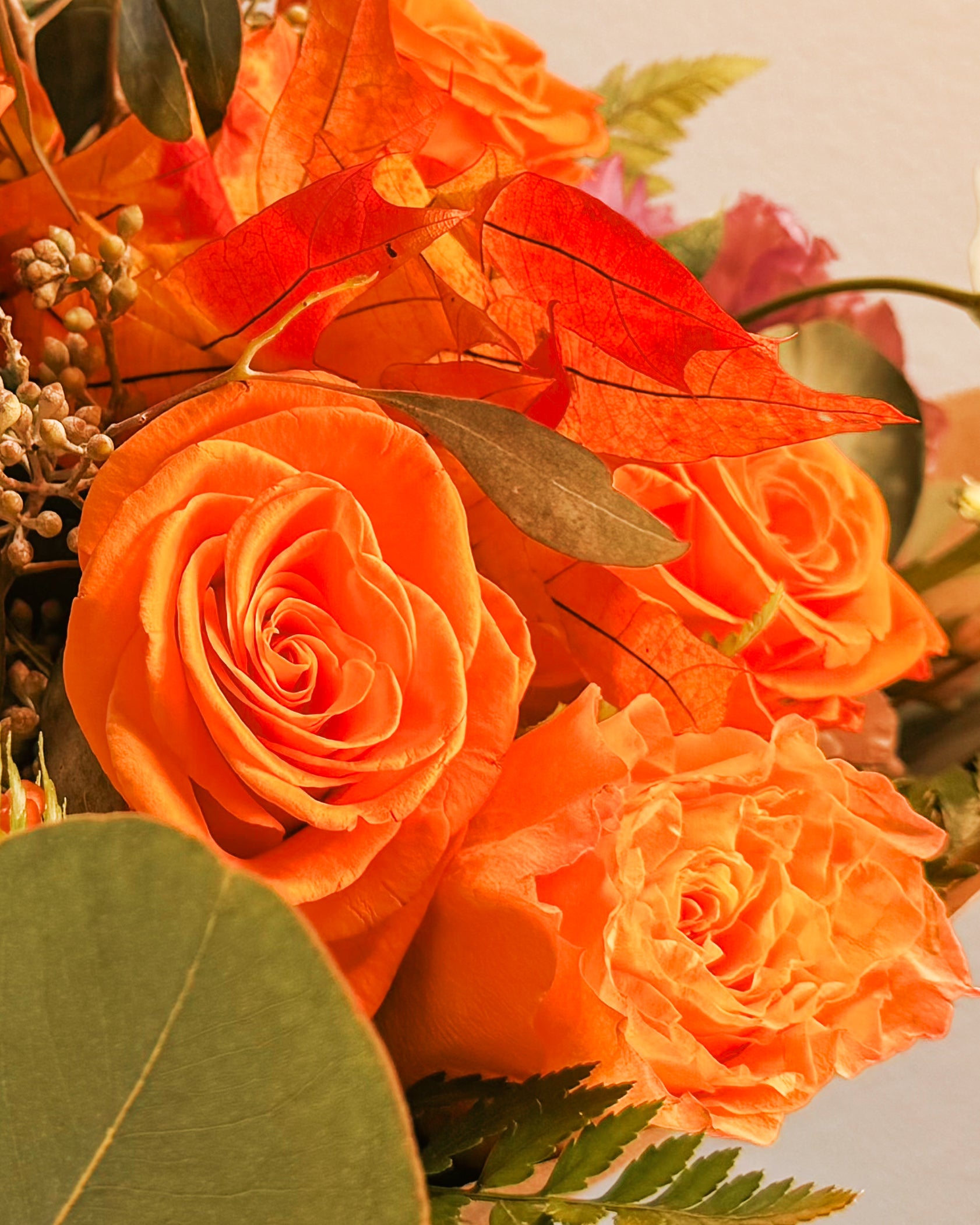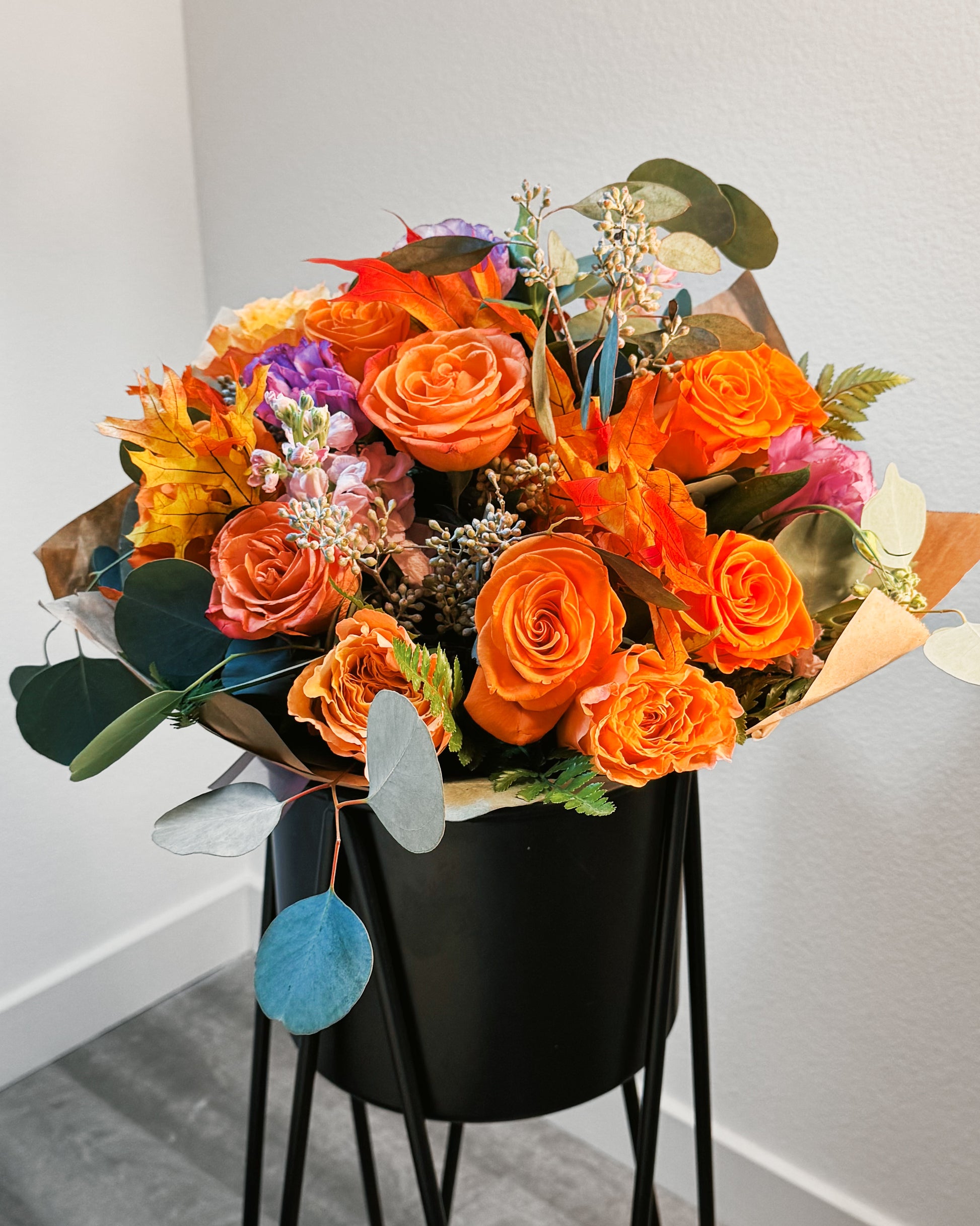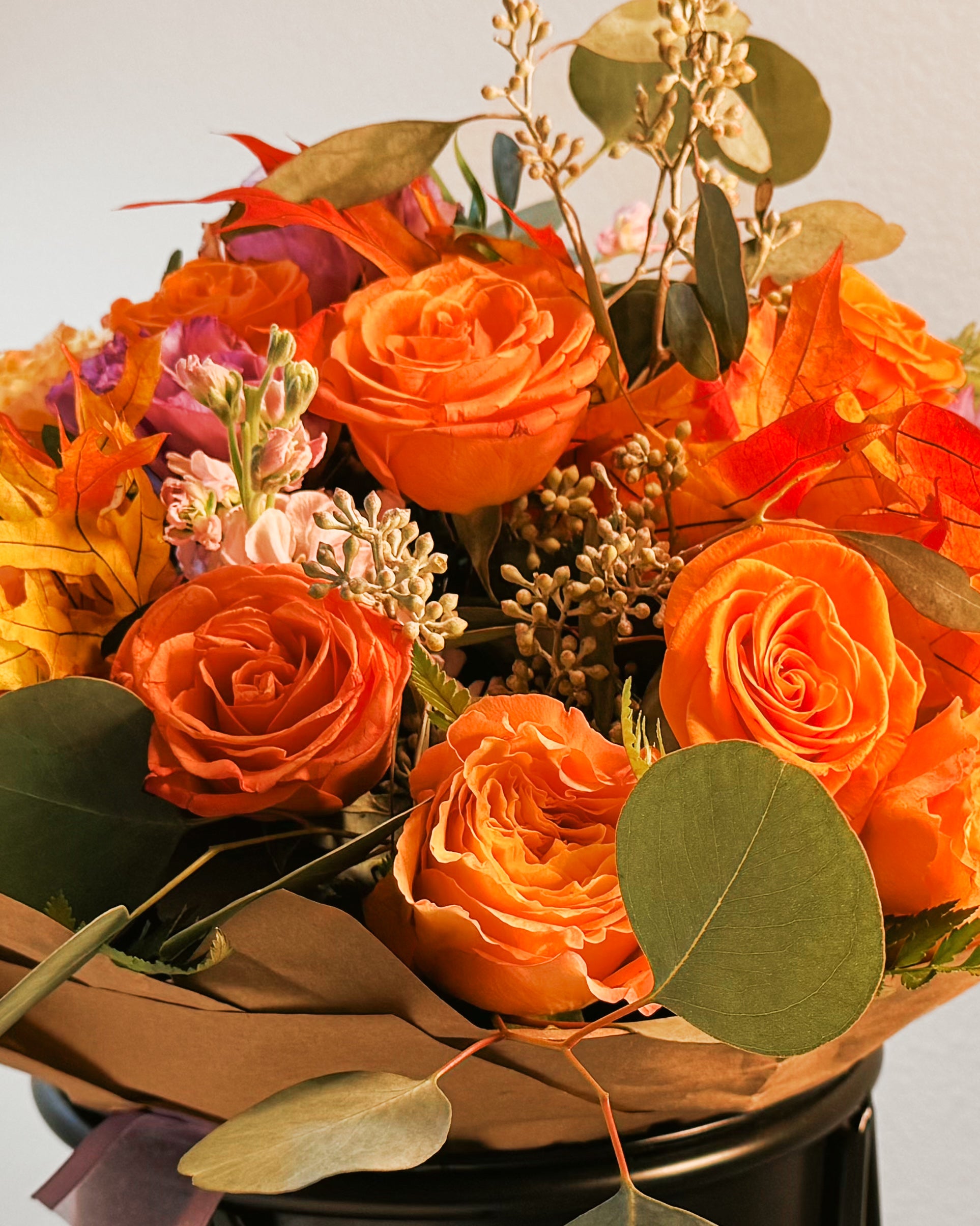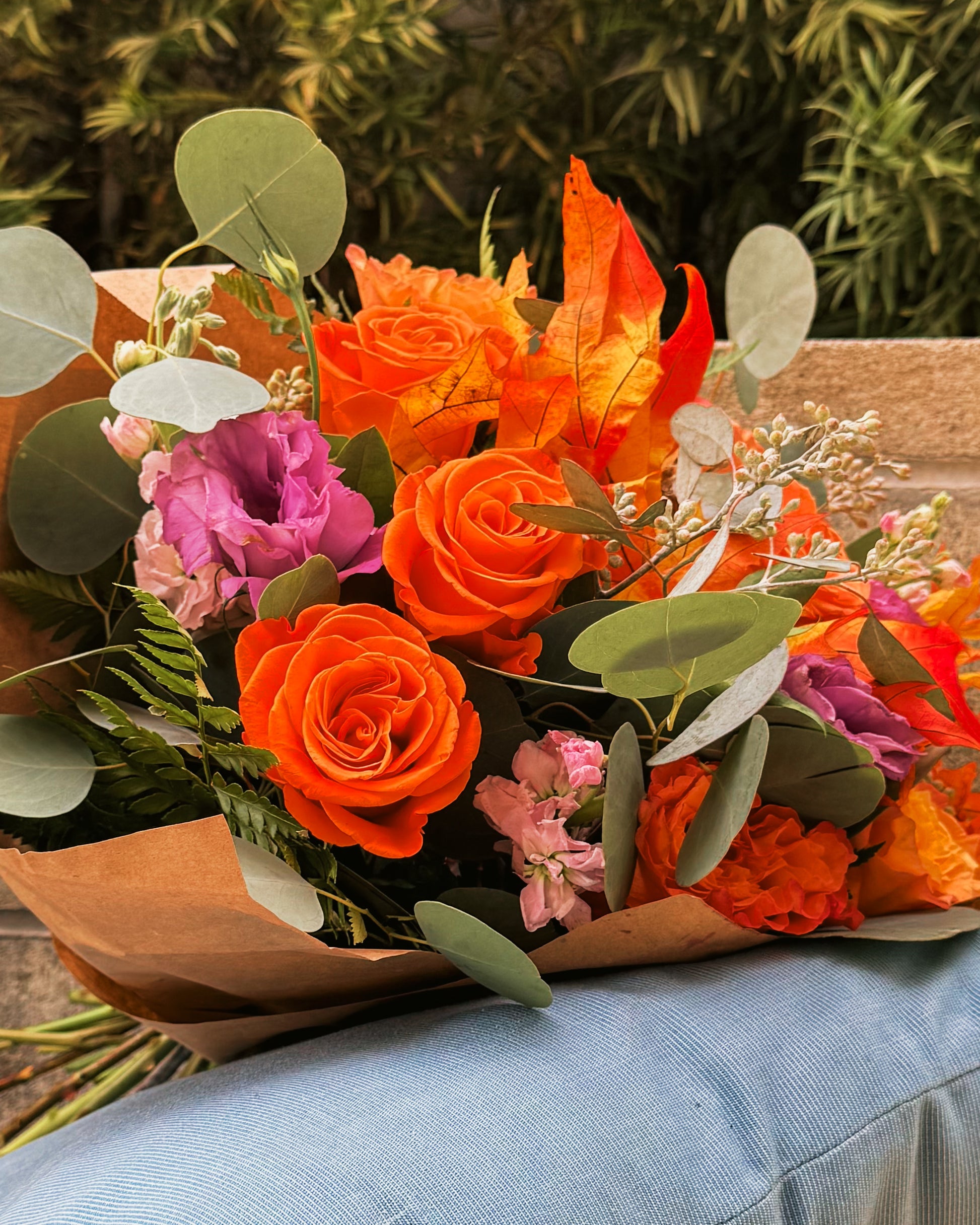 This fiery bouquet captures the essence of autumn with its vibrant orange roses, golden chrysanthemums, and touches of delicate peach stock. Accented with preserved fall leaves, eucalyptus, and rustic wrapping paper, it evokes a cozy, warm ambiance that celebrates the beauty of the season.