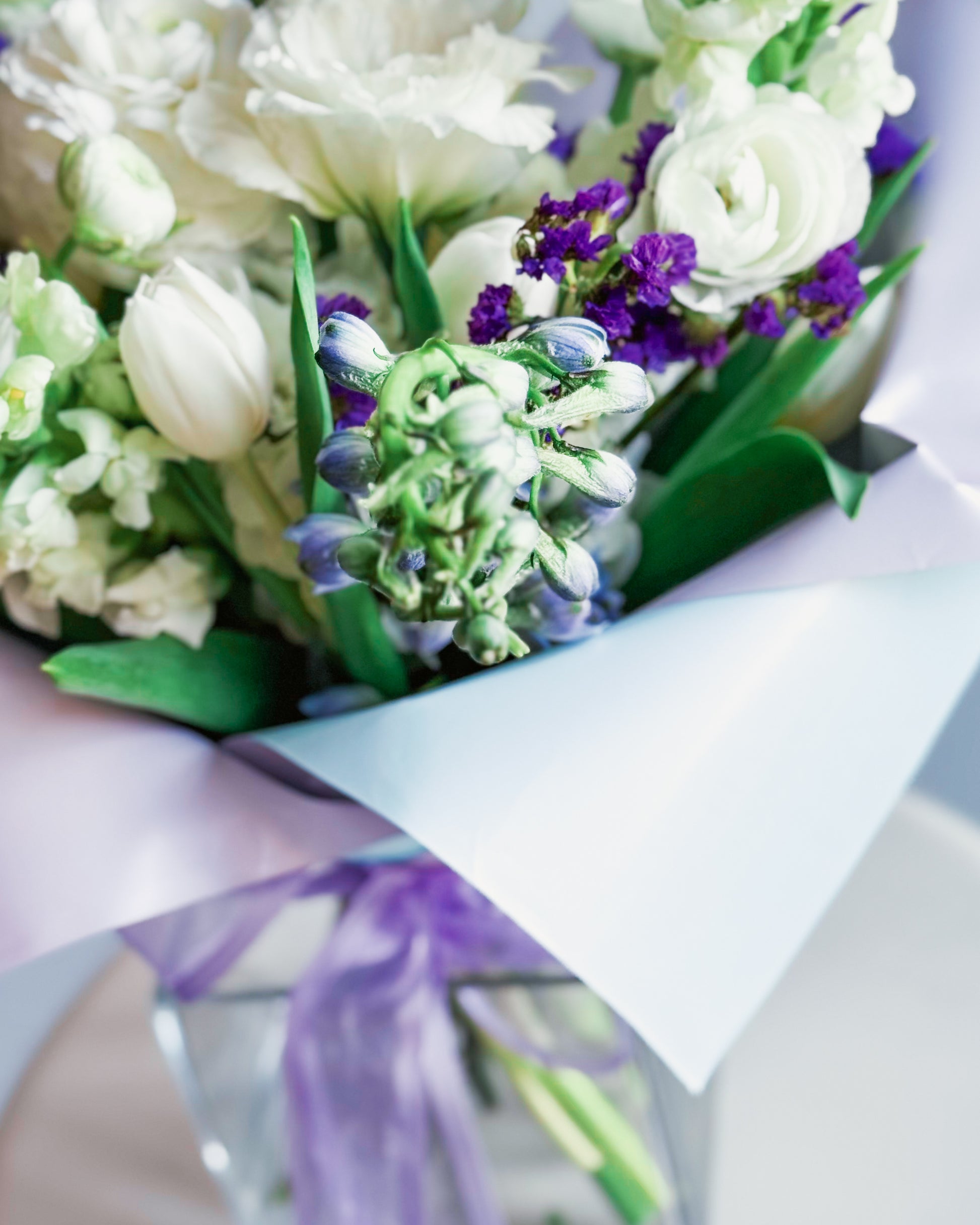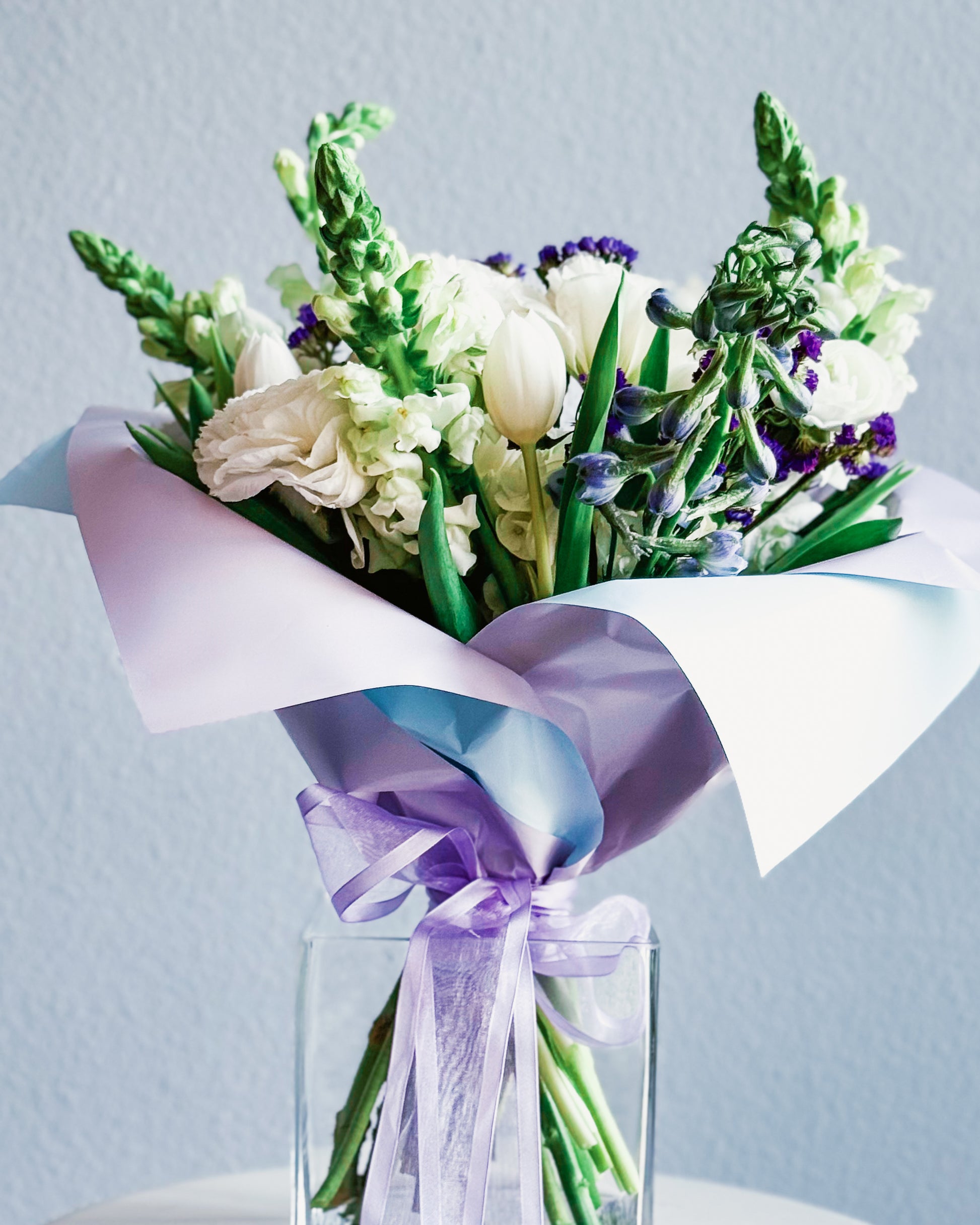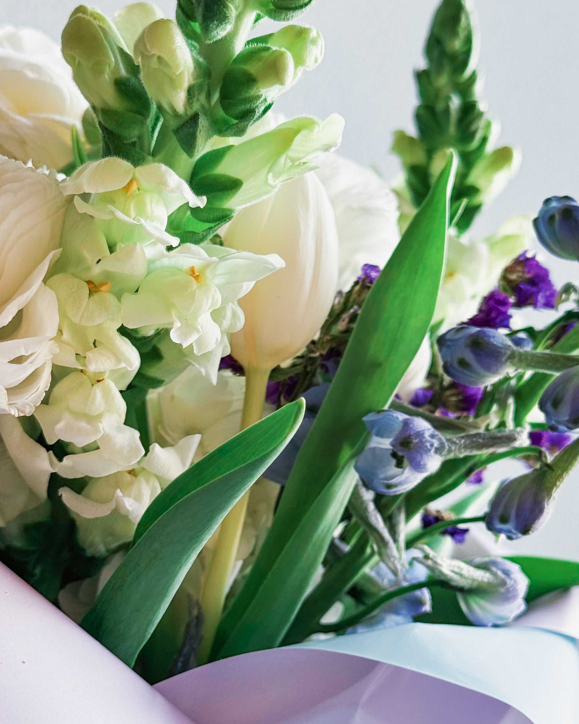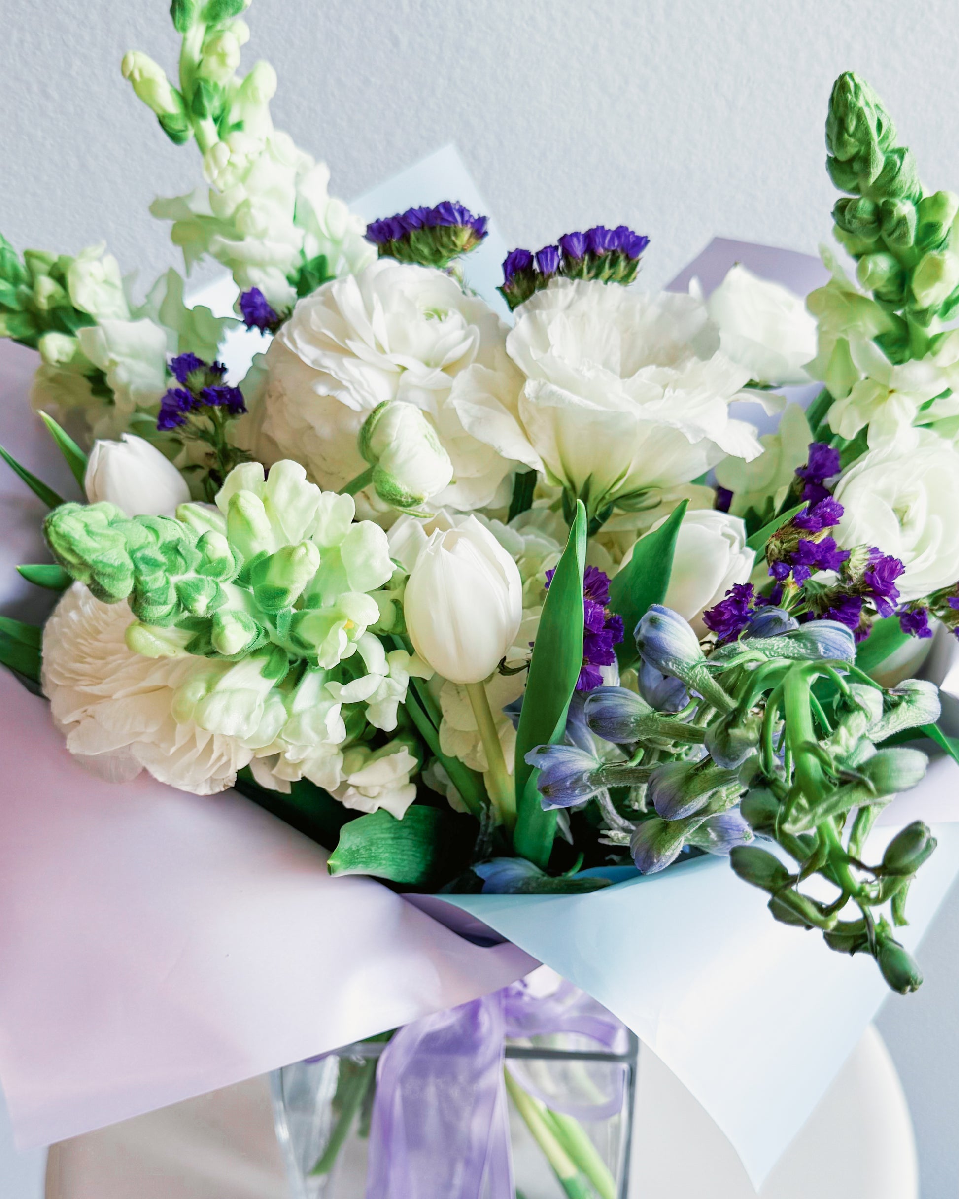 White snapdragons, White ranunculus, White lisianthus, White tulips, Purple statice, Light blue delphinium, Seasonal greens, Pastel pink and lavender wrap, Soft sheer lavender ribbon.