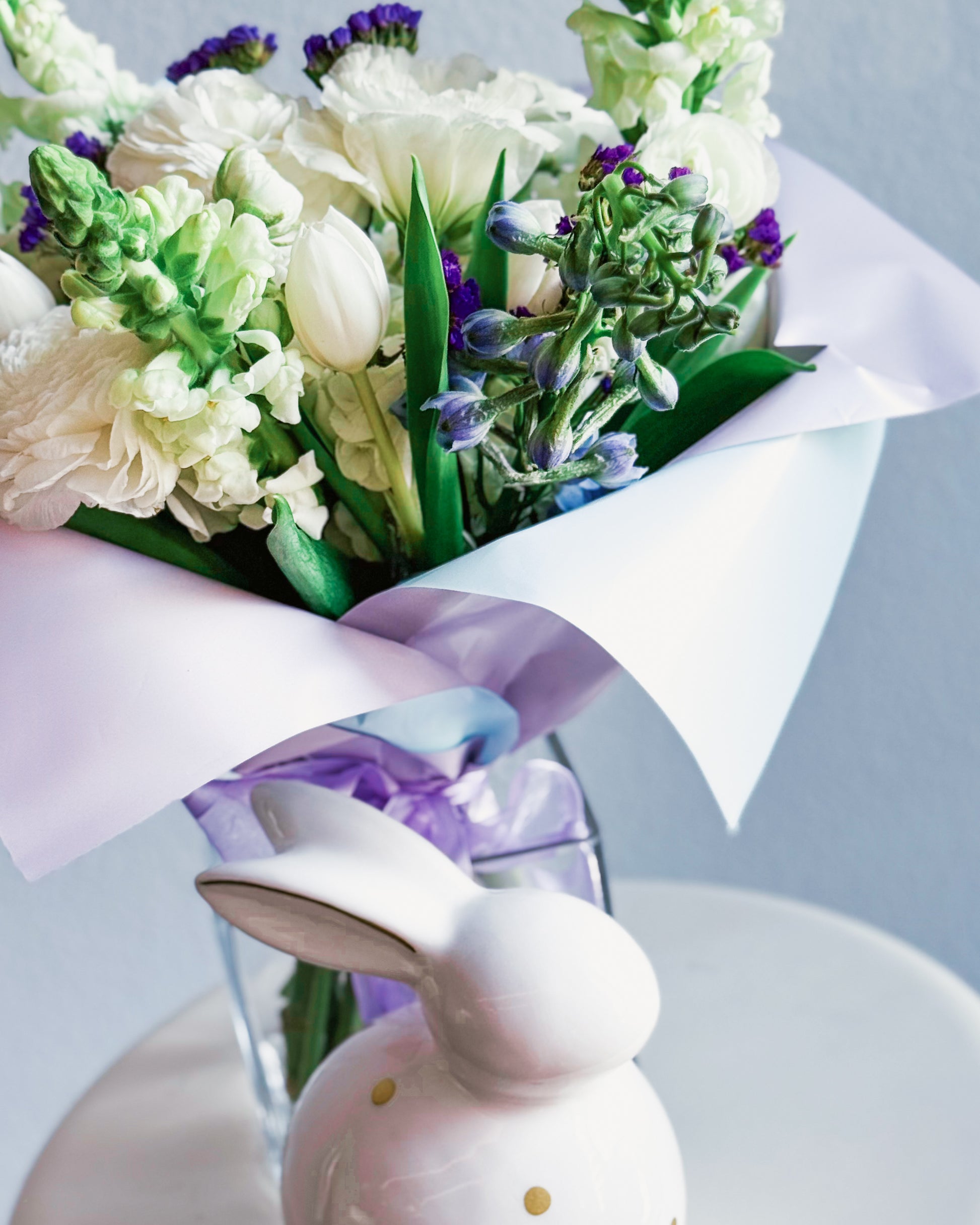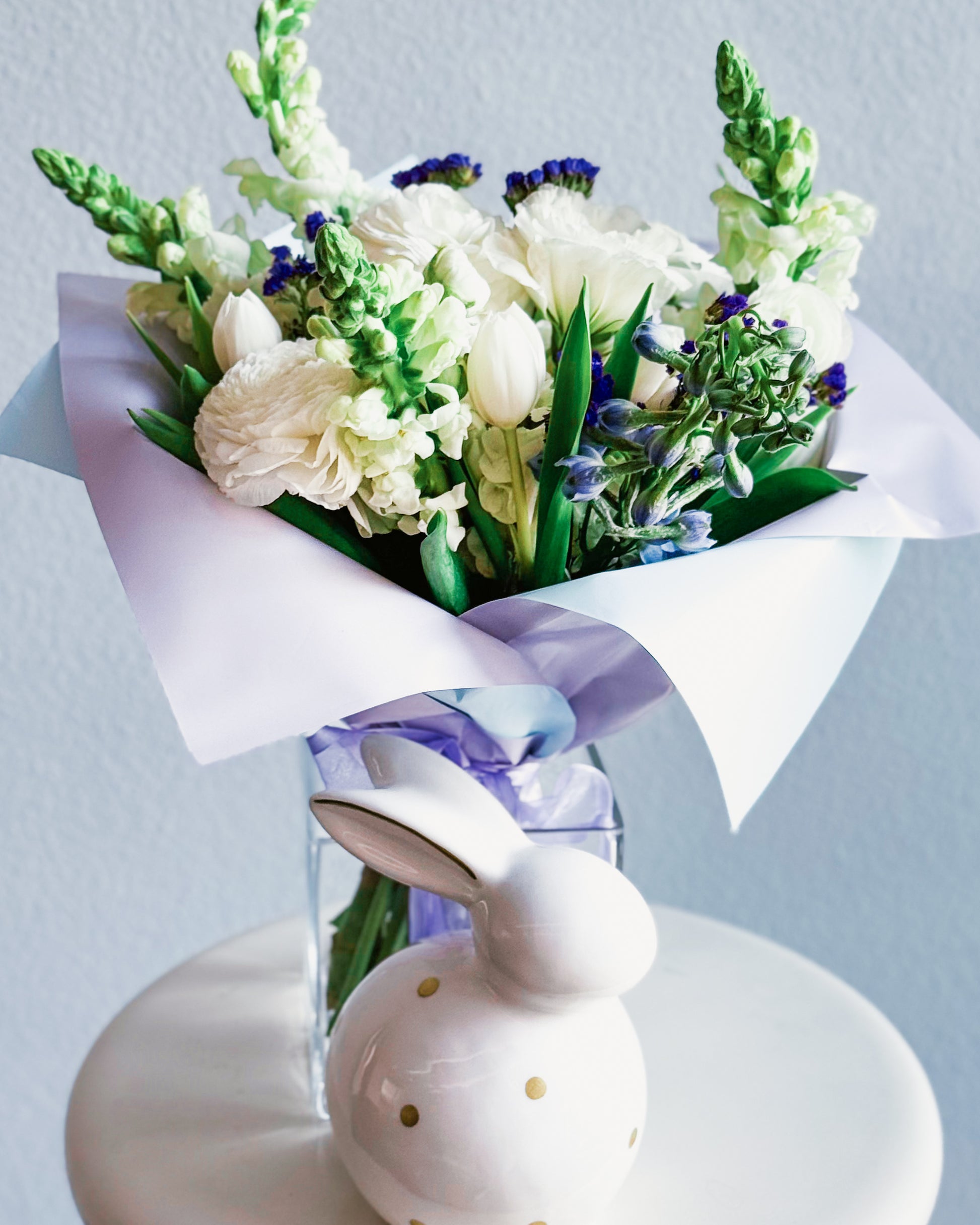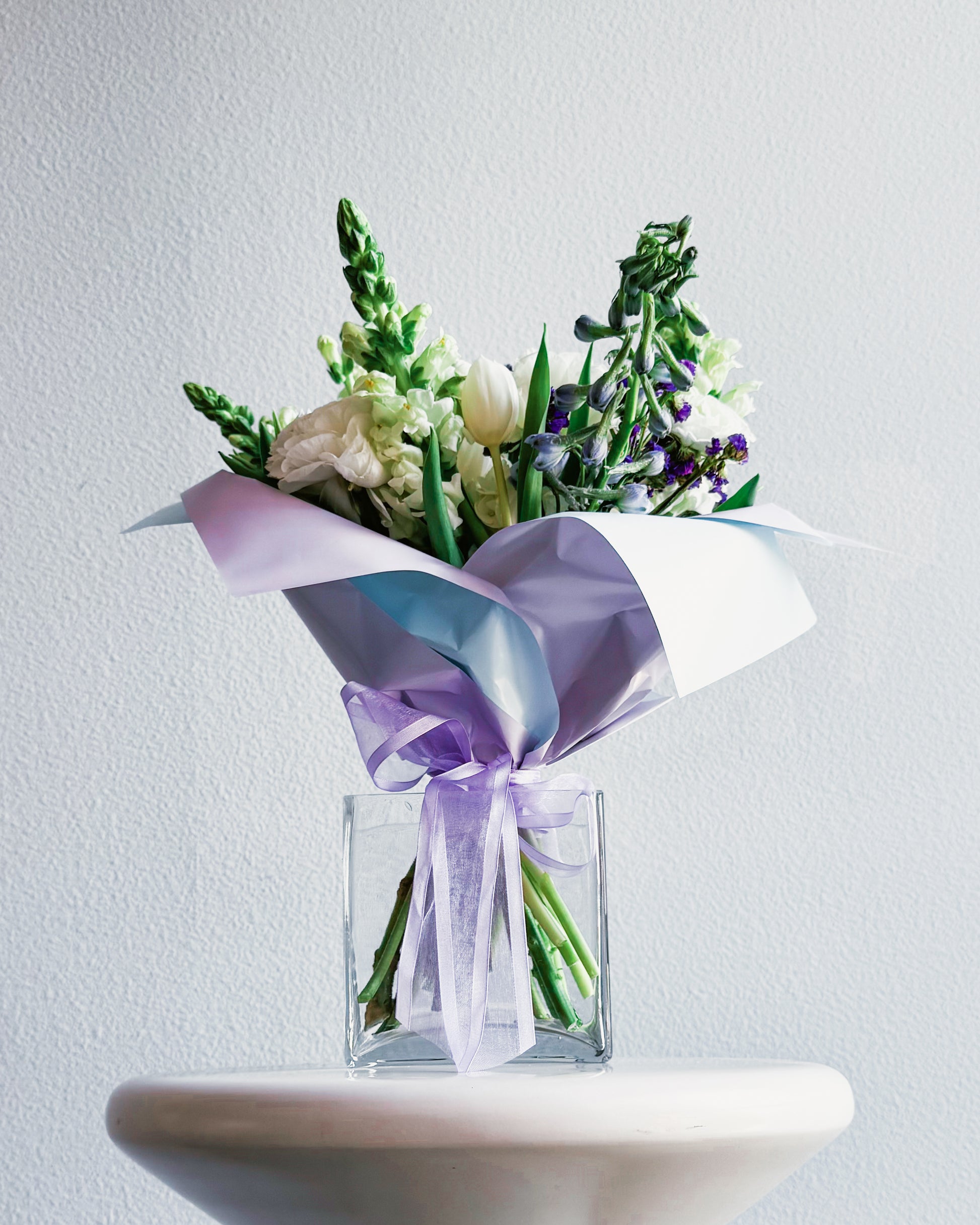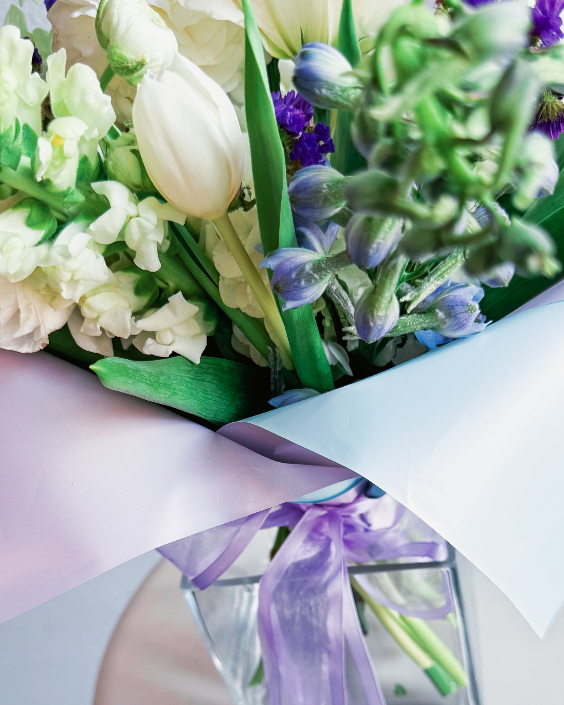 White snapdragons, White ranunculus, White lisianthus, White tulips, Purple statice, Light blue delphinium, Seasonal greens, Pastel pink and lavender wrap, Soft sheer lavender ribbon.