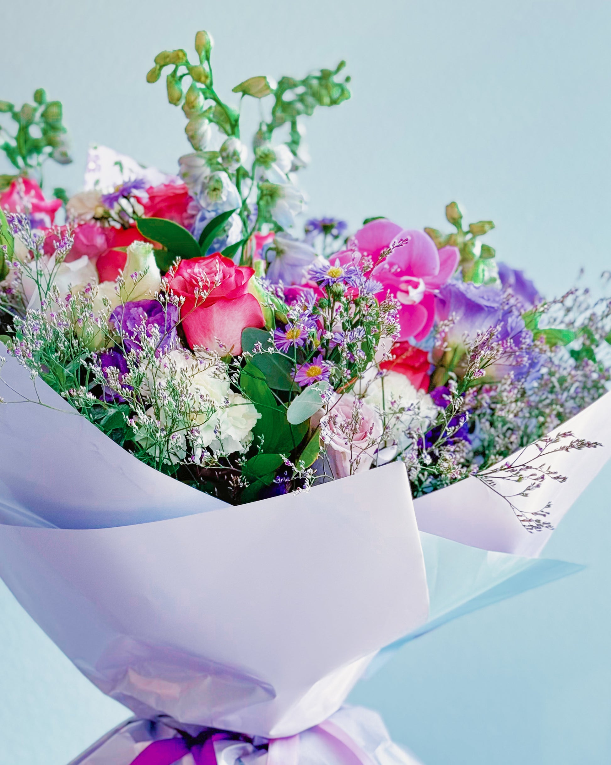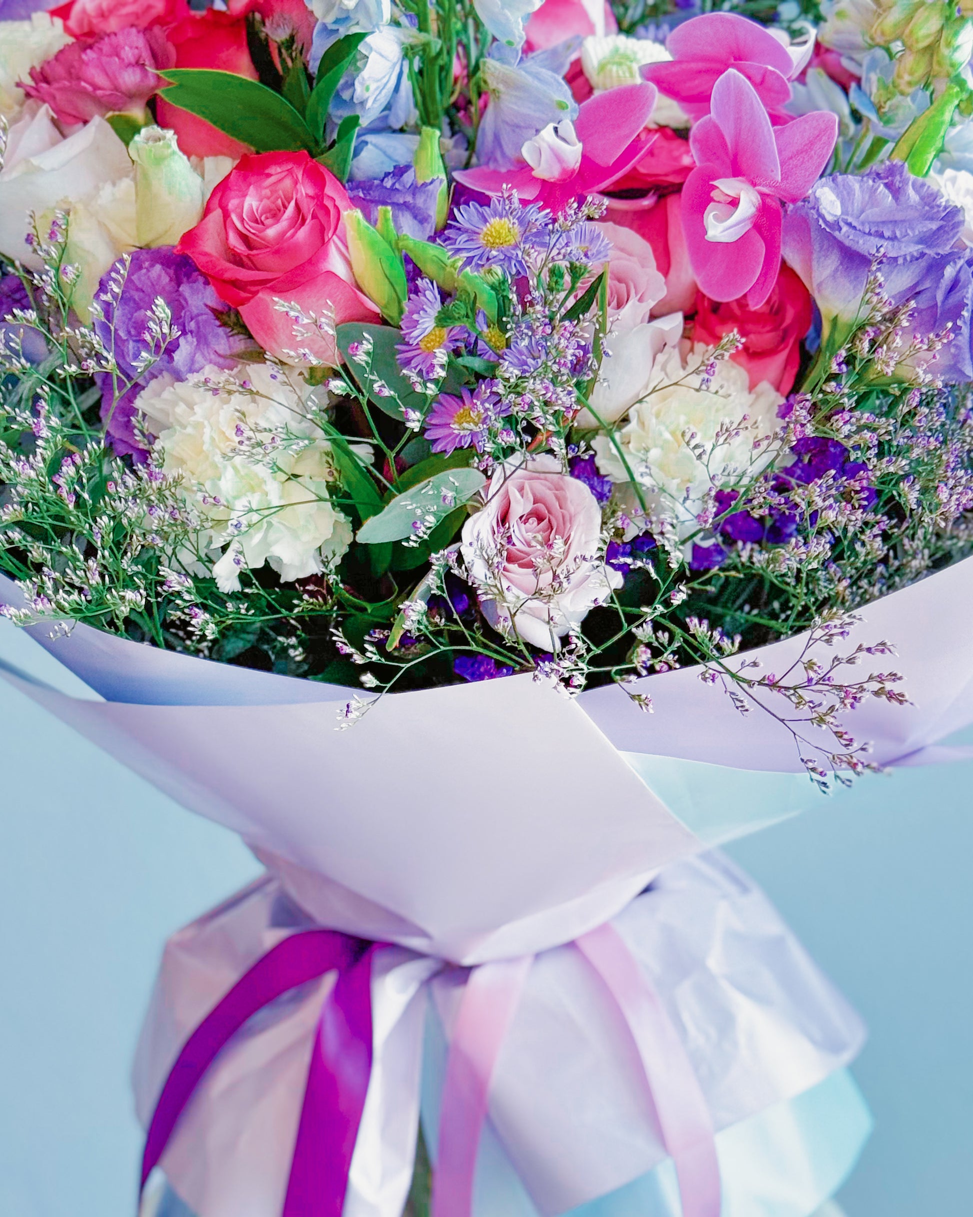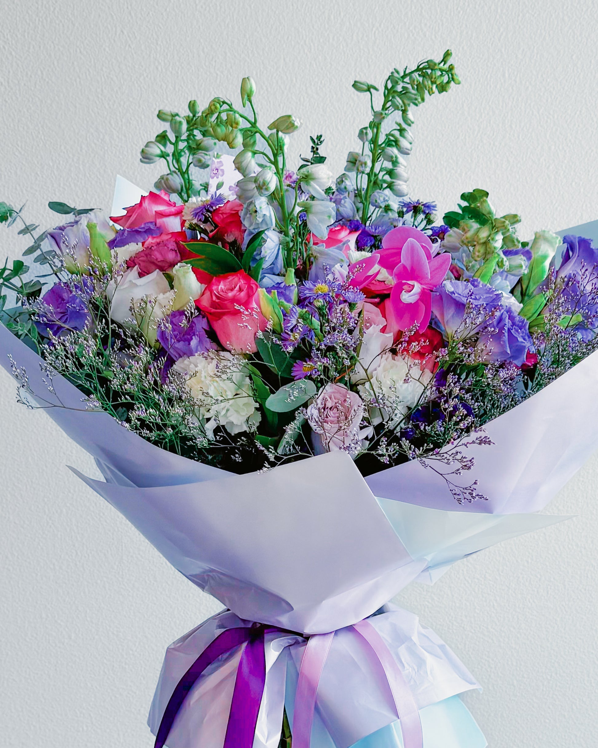 Roses (pink, blush, and lilac tones), Orchids (hot pink), Carnations (cream and blush), Delphinium (blue and white), Statice (lavender/purple), Asters (purple with yellow centers), Eustoma/Lisianthus (light purple), Baby’s breath or limonium filler, Eucalyptus or assorted greenery.