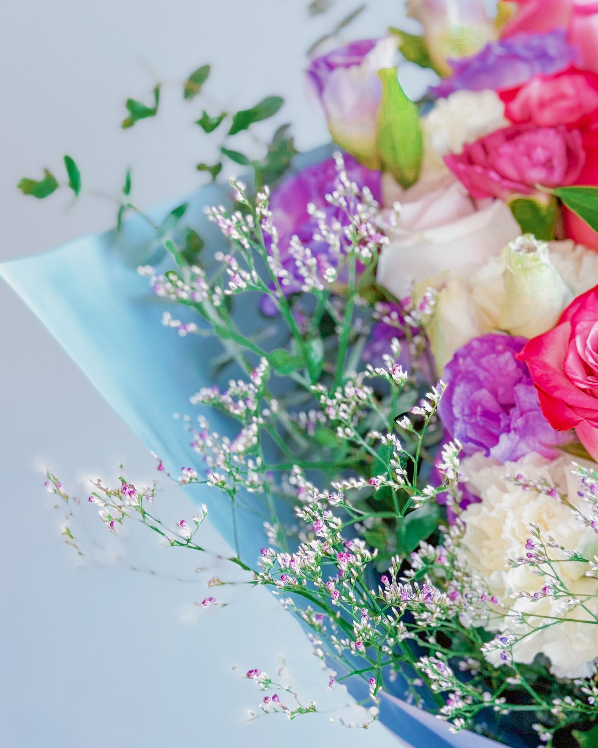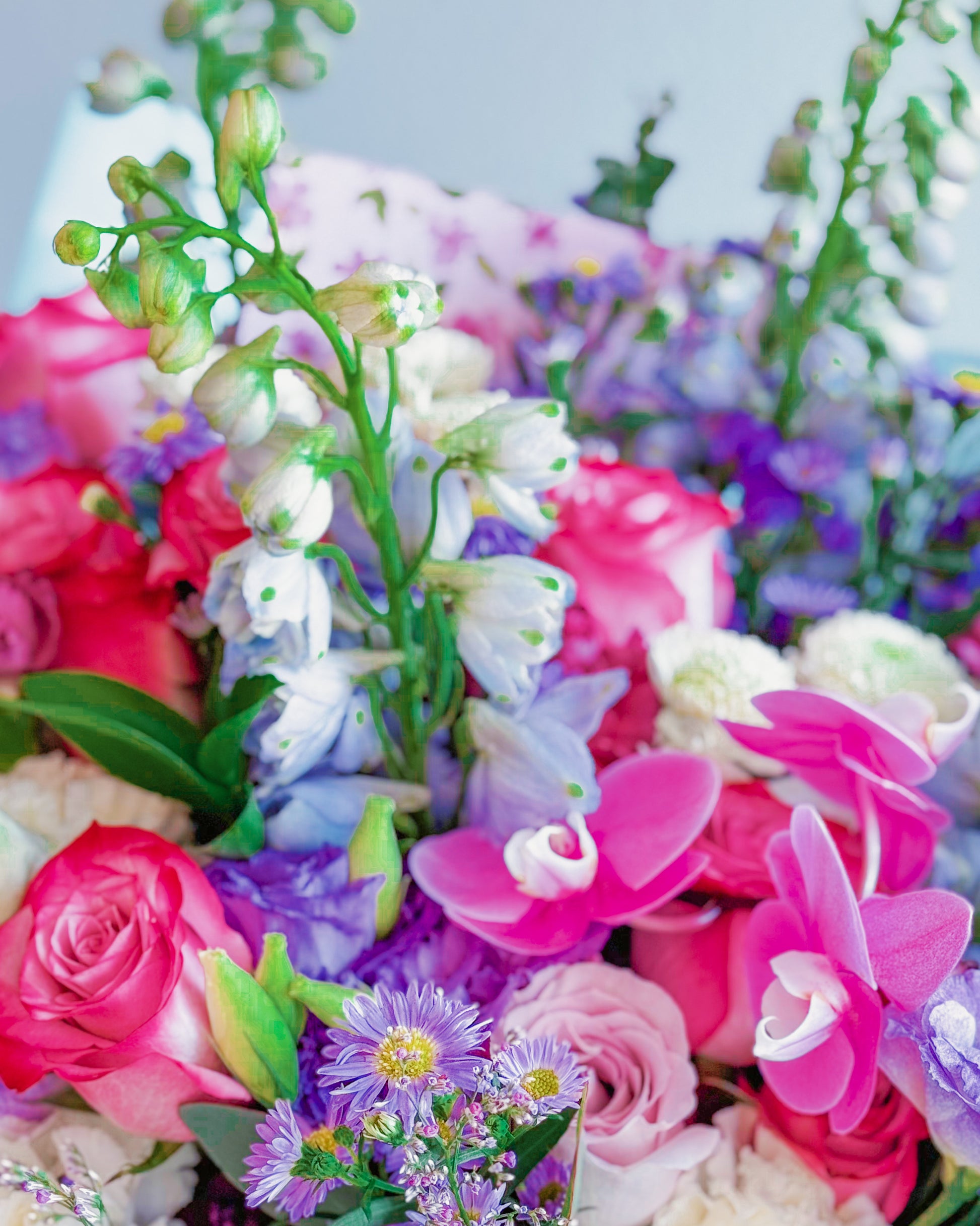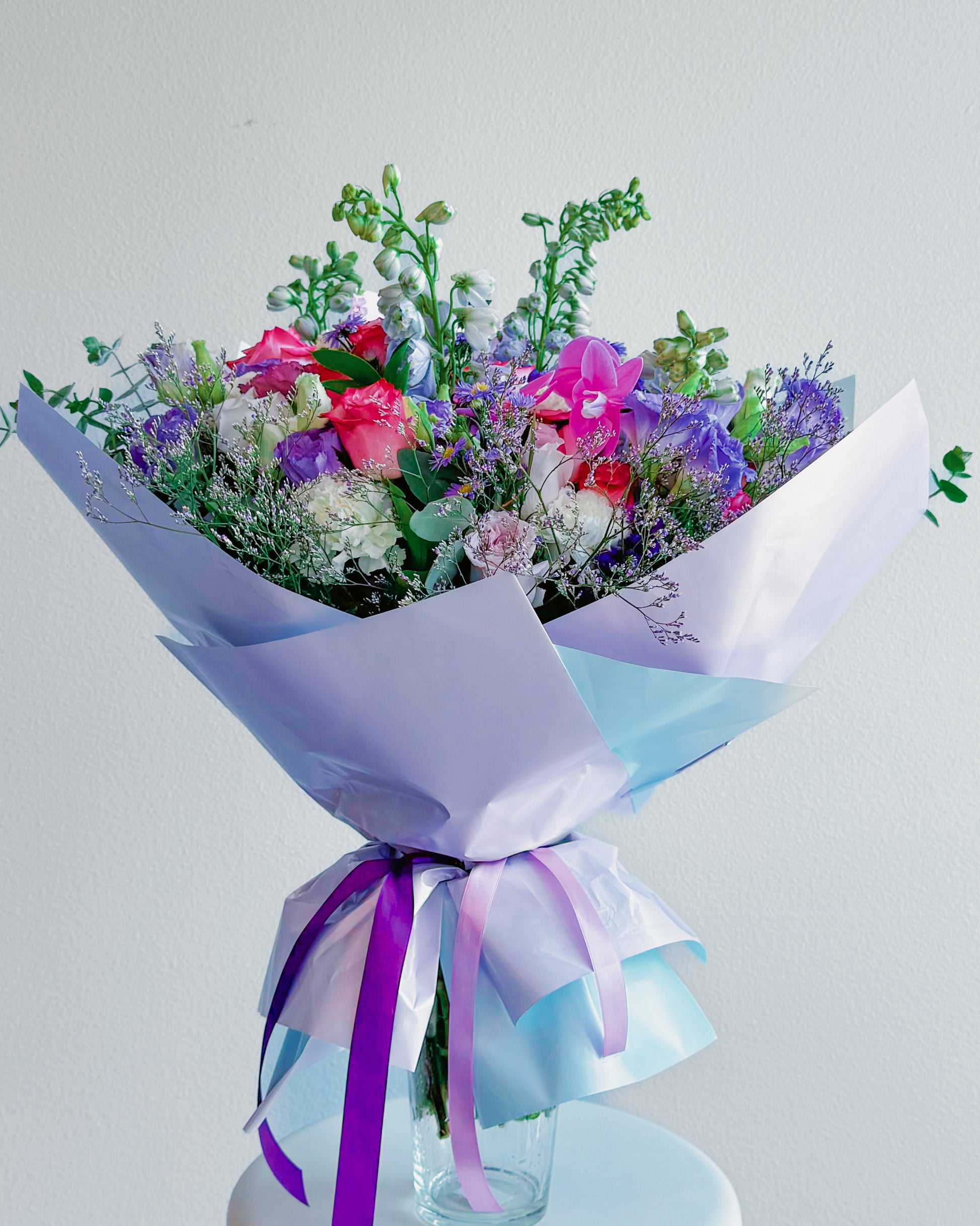 Roses (pink, blush, and lilac tones), Orchids (hot pink), Carnations (cream and blush), Delphinium (blue and white), Statice (lavender/purple), Asters (purple with yellow centers), Eustoma/Lisianthus (light purple), Baby’s breath or limonium filler, Eucalyptus or assorted greenery.