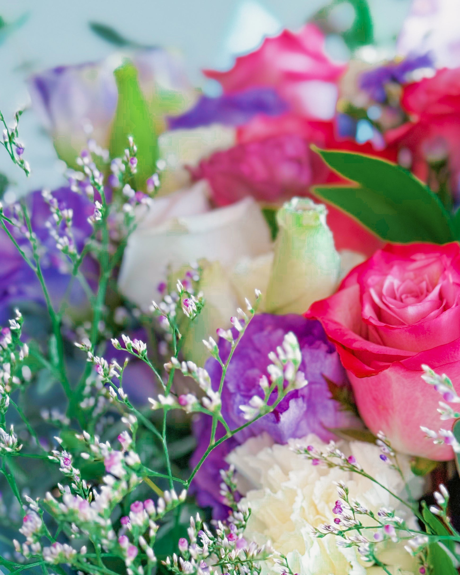 Lilac, Blush pink, Bright fuchsia, Creamy ivory, Lavender purple, Soft rose, Hints of green (foliage), Touches of sky blue