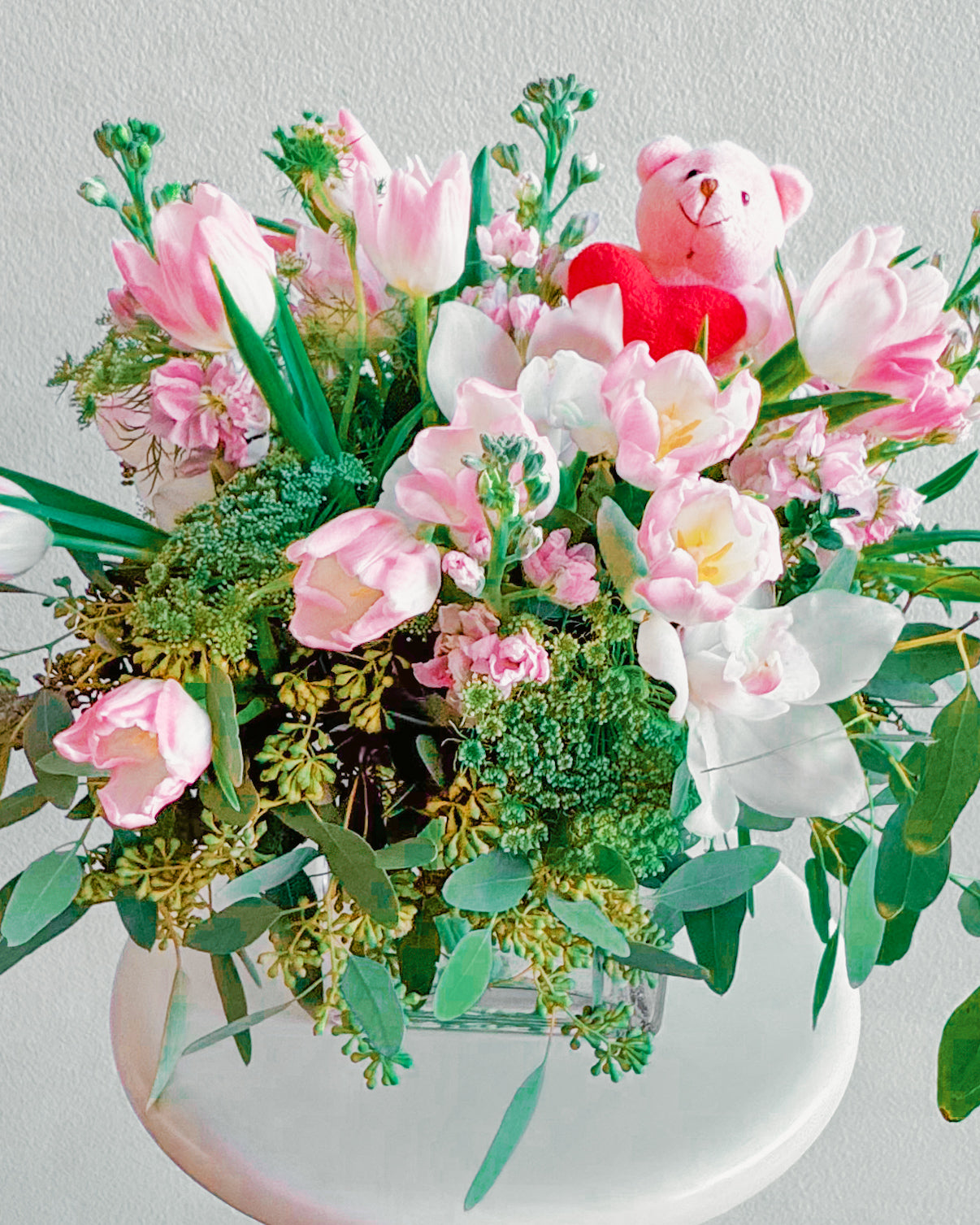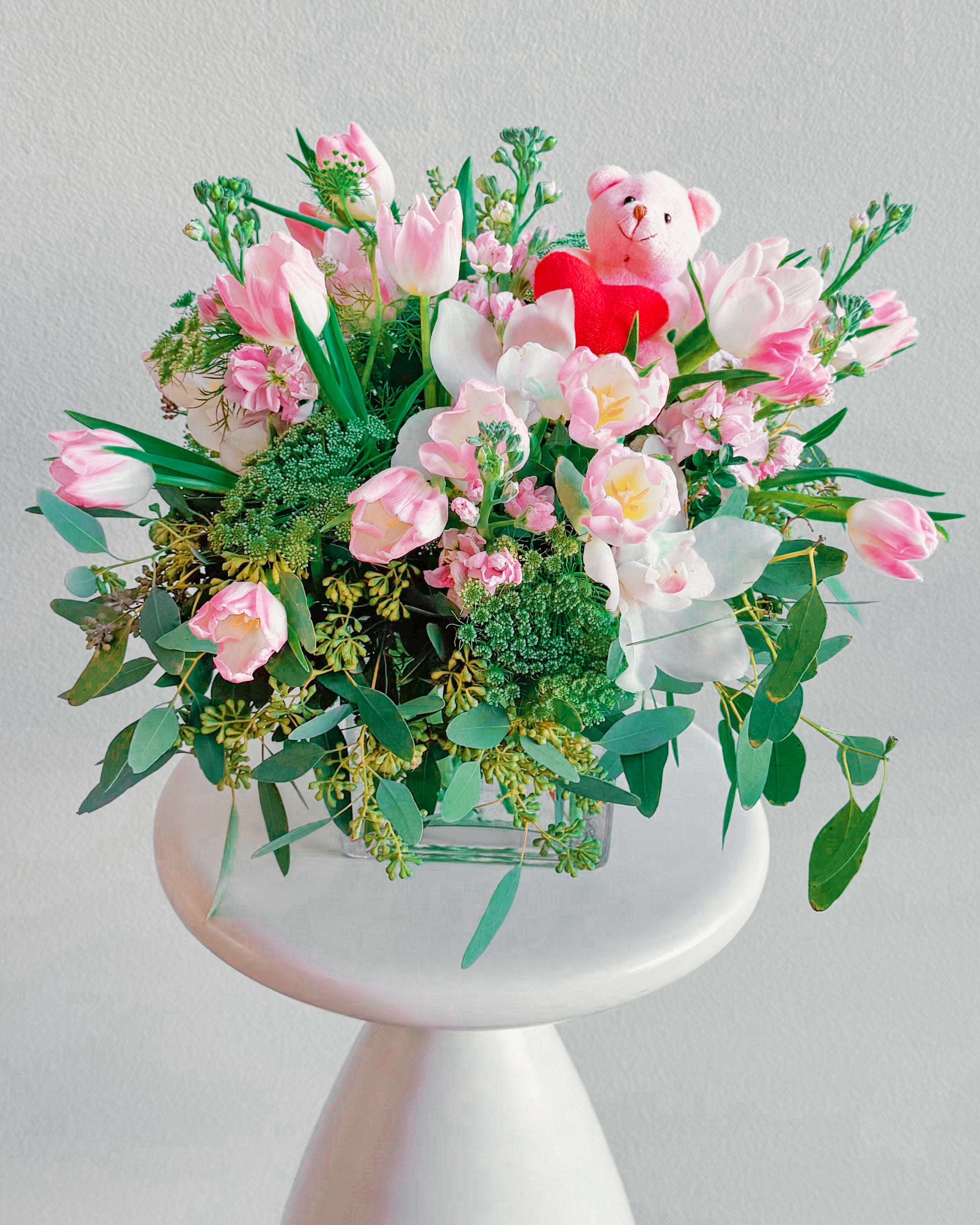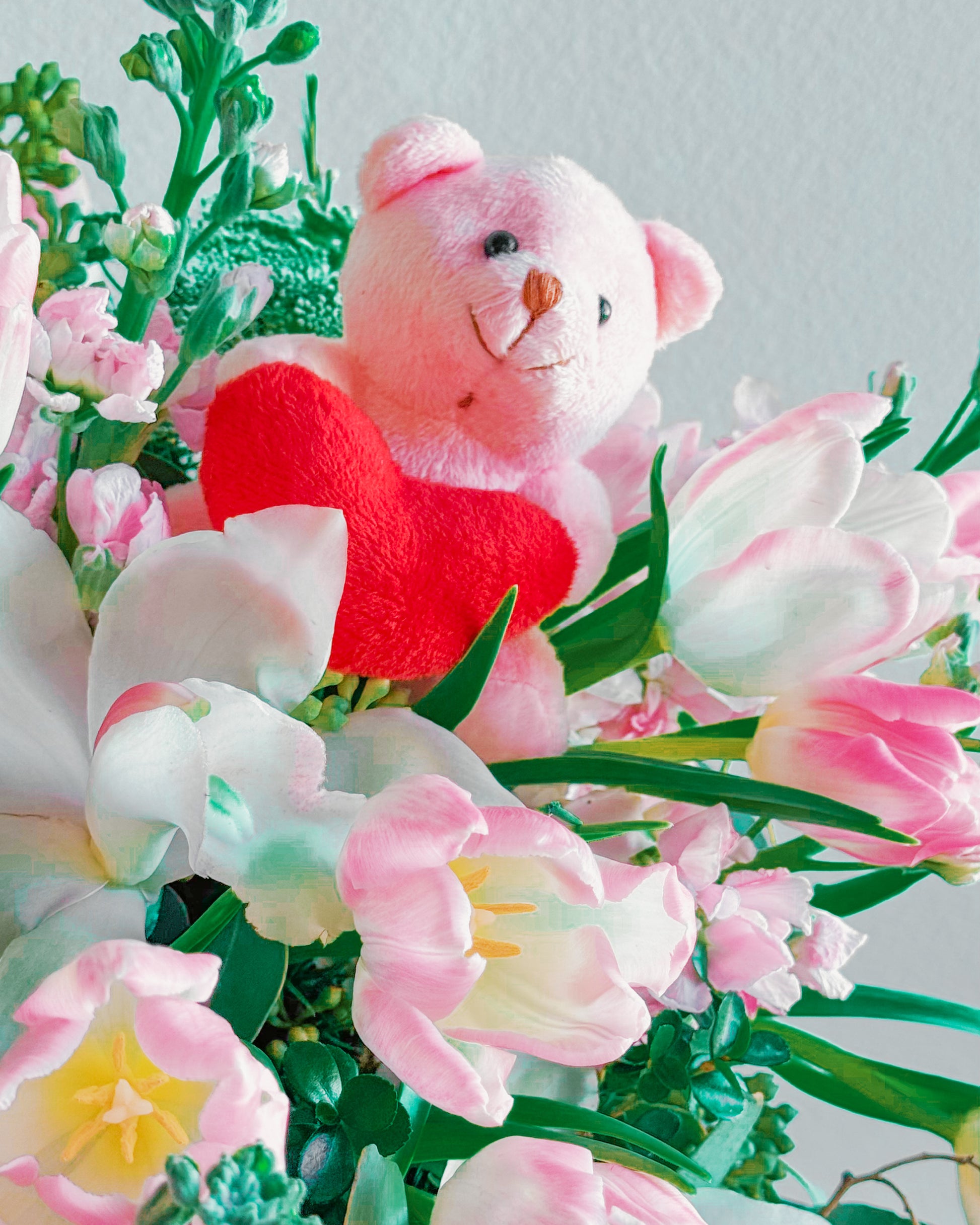 This bouquet is pure sweetness! A mix of soft pink tulips, delicate white orchids, and lush greenery, all topped off with the cutest little teddy bear holding a heart. It’s got that dreamy, romantic vibe perfect for Valentine’s Day, anniversaries, or just to show someone you’re thinking about them. The soft pastel colors and playful touch make it feel both classy and adorable.