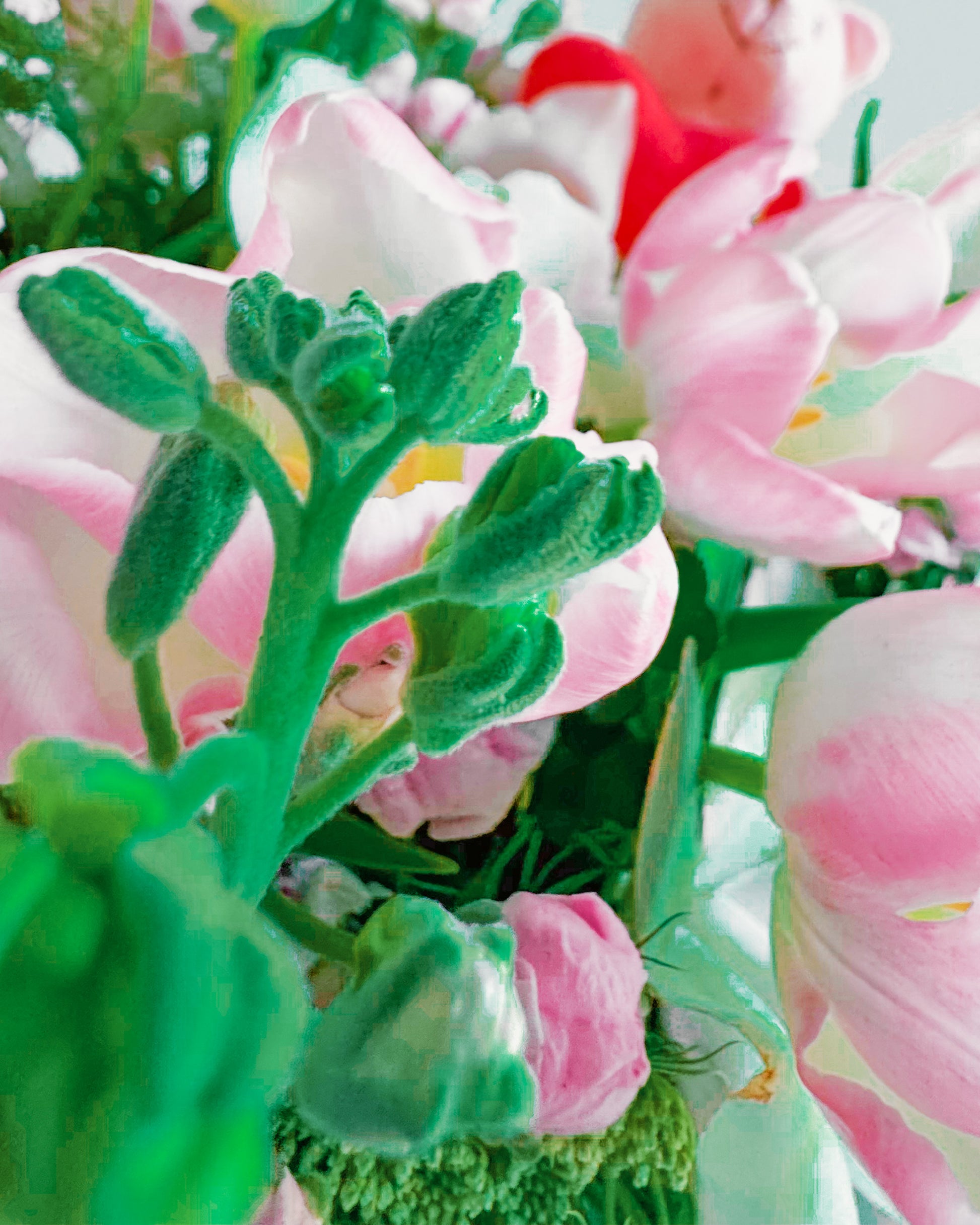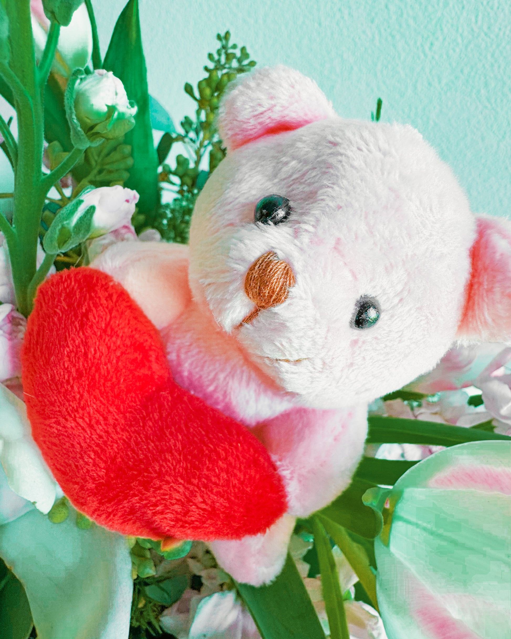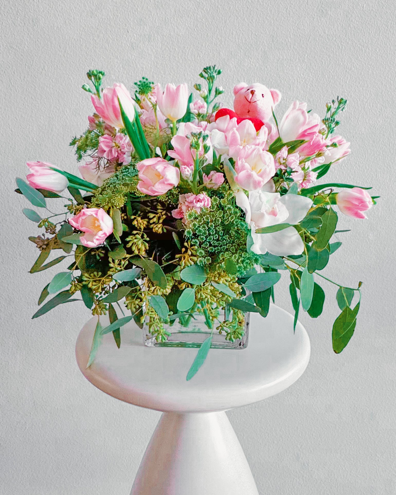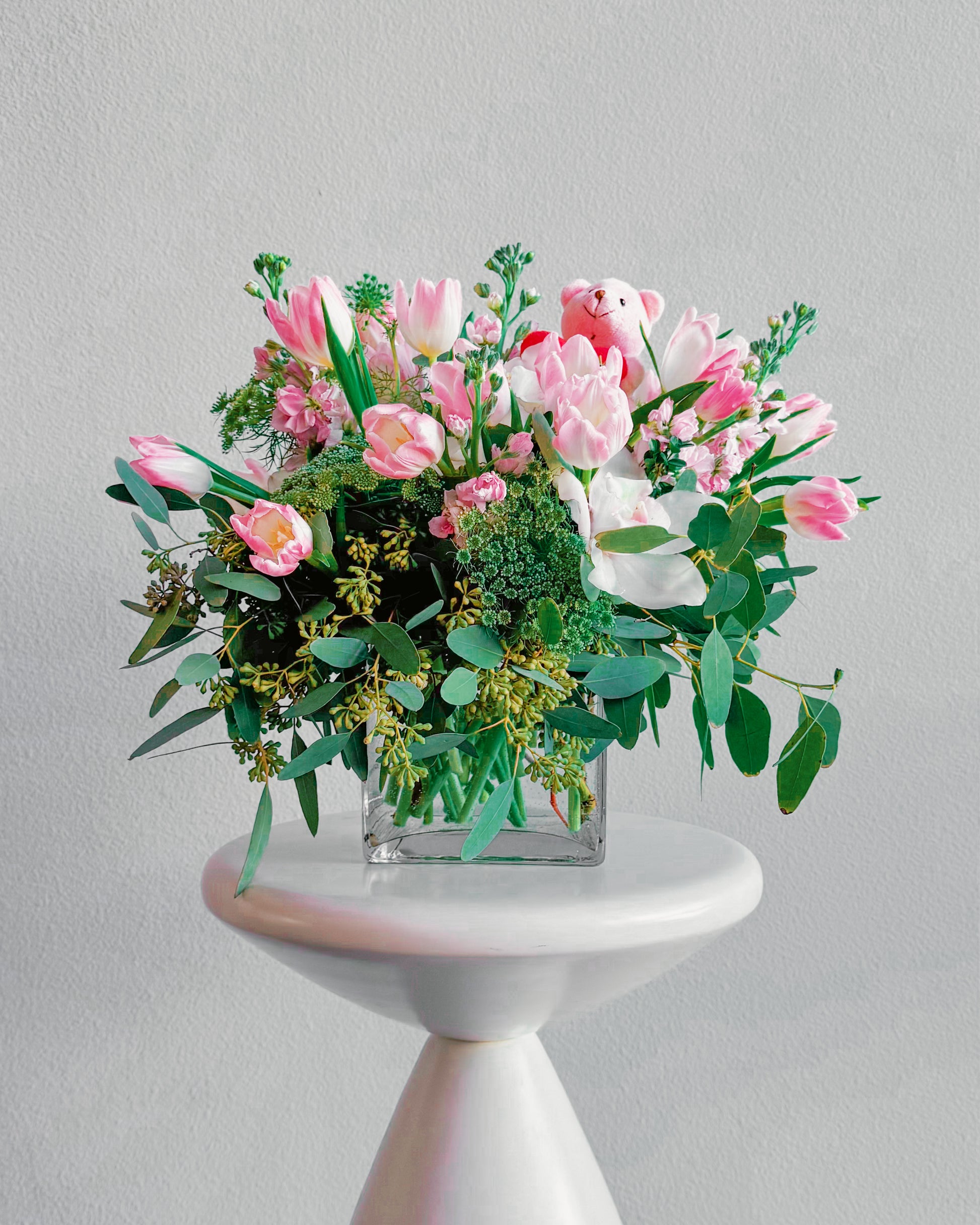 This bouquet is pure sweetness! A mix of soft pink tulips, delicate white orchids, and lush greenery, all topped off with the cutest little teddy bear holding a heart. It’s got that dreamy, romantic vibe perfect for Valentine’s Day, anniversaries, or just to show someone you’re thinking about them. The soft pastel colors and playful touch make it feel both classy and adorable.