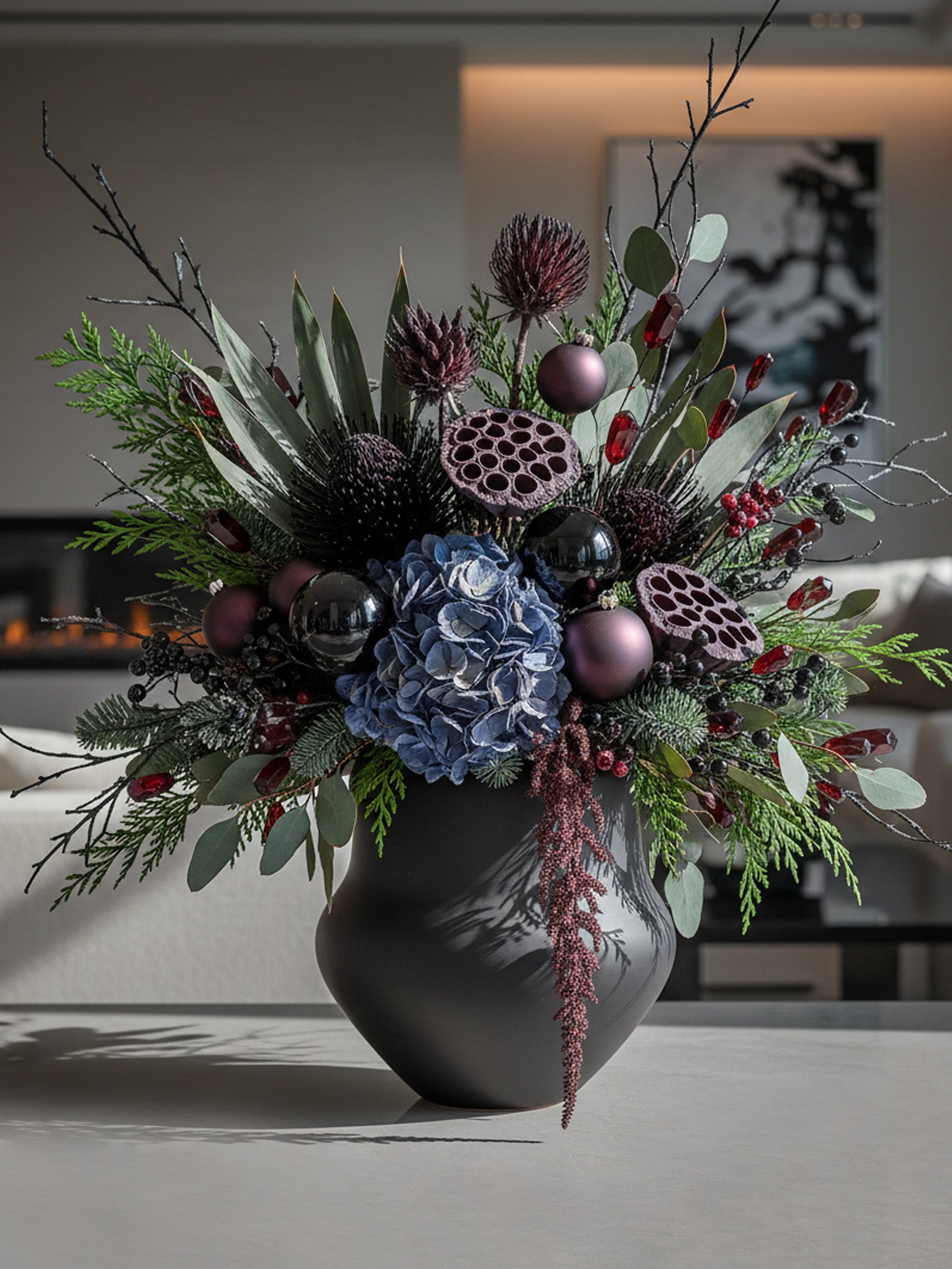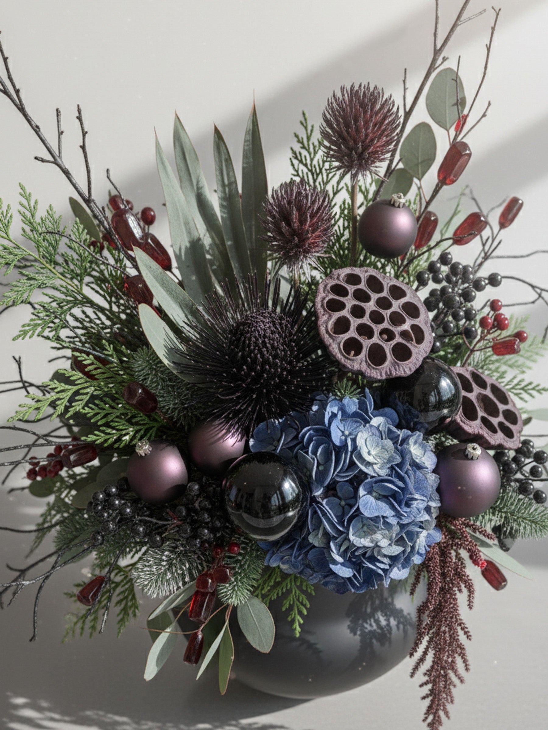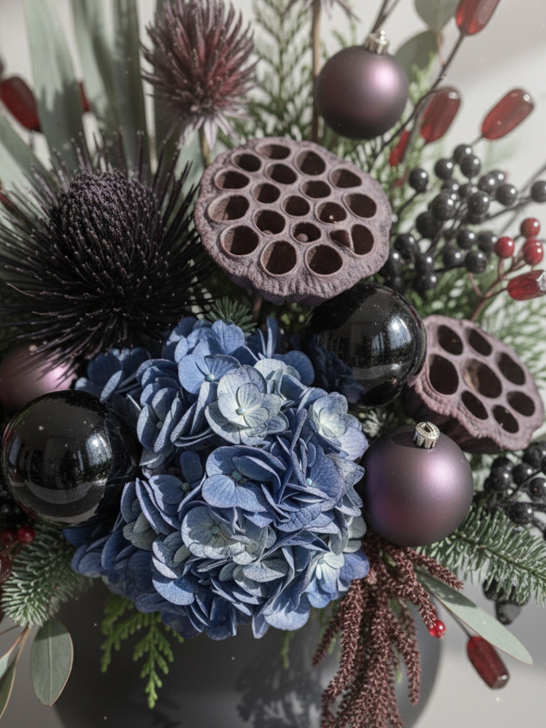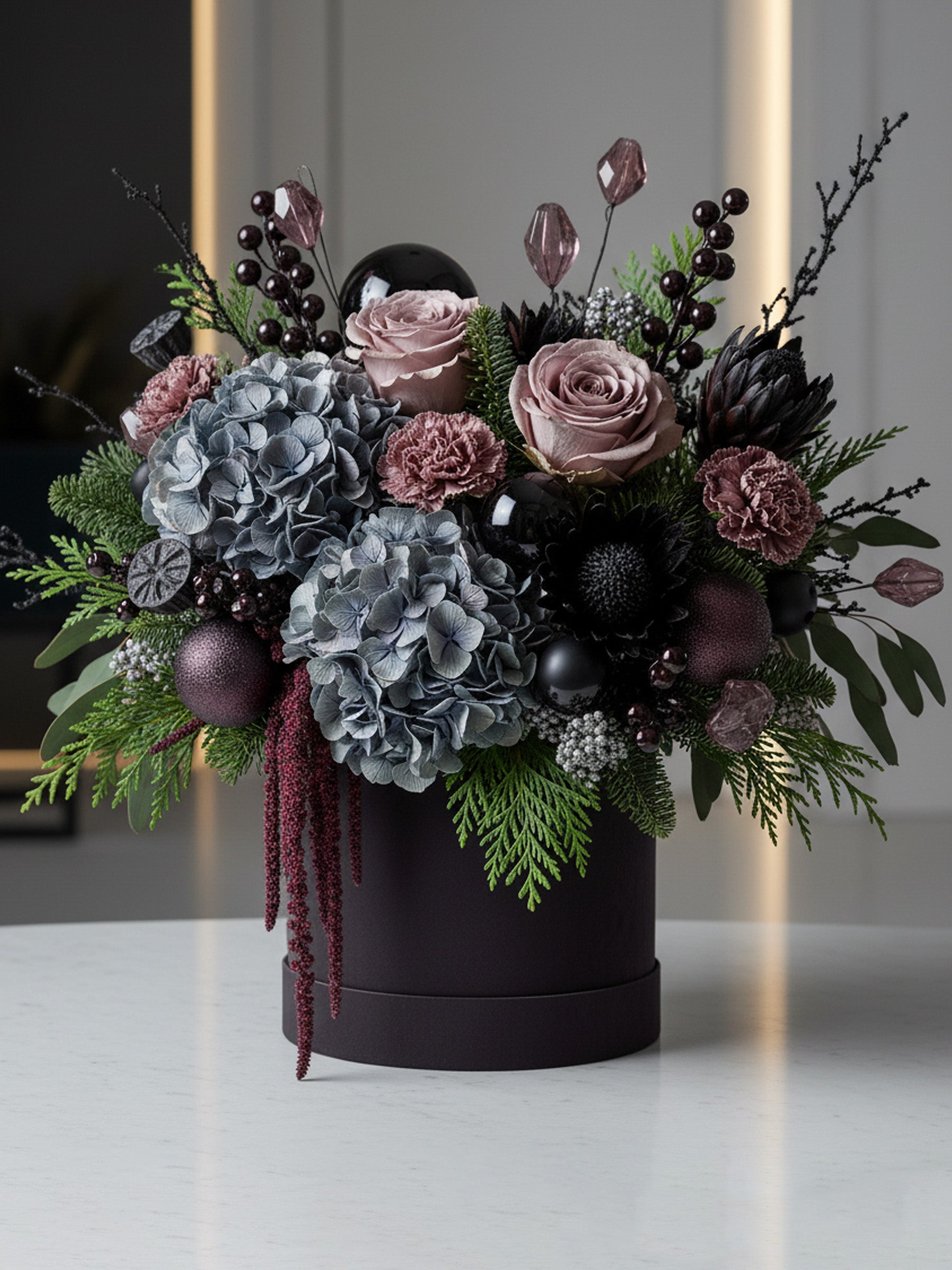 Preserved plum-blue hydrangea, Dried protea “Black Ice”, Preserved scabiosa stellata (deep plum), Preserved dusty-mauve roses, Preserved smoky pink dianthus, Dried cascading amaranthus plum noir.