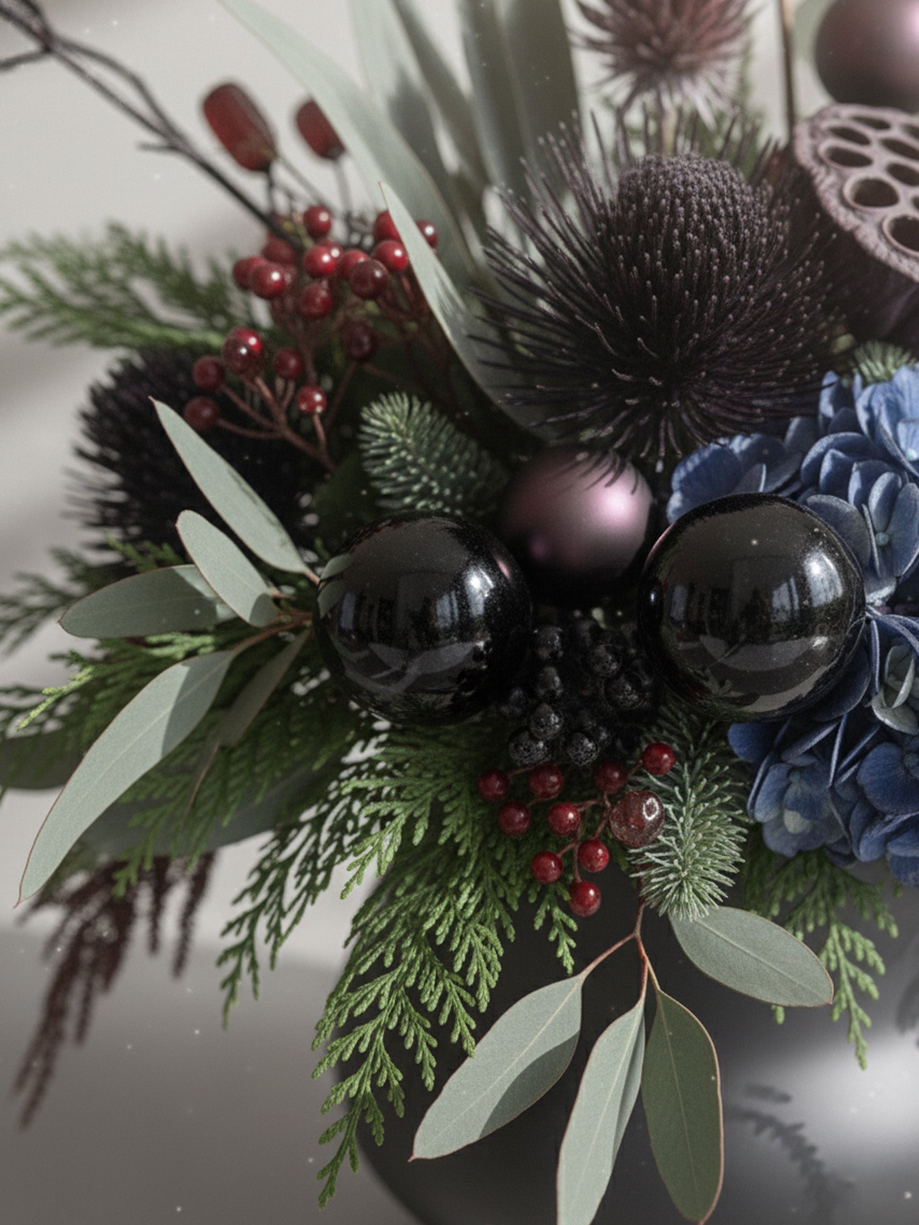 Matte black-chrome & plum velvet ornaments, Black garnet metallic berries, Frosted black twigs, Acrylic accents “plum glass”.