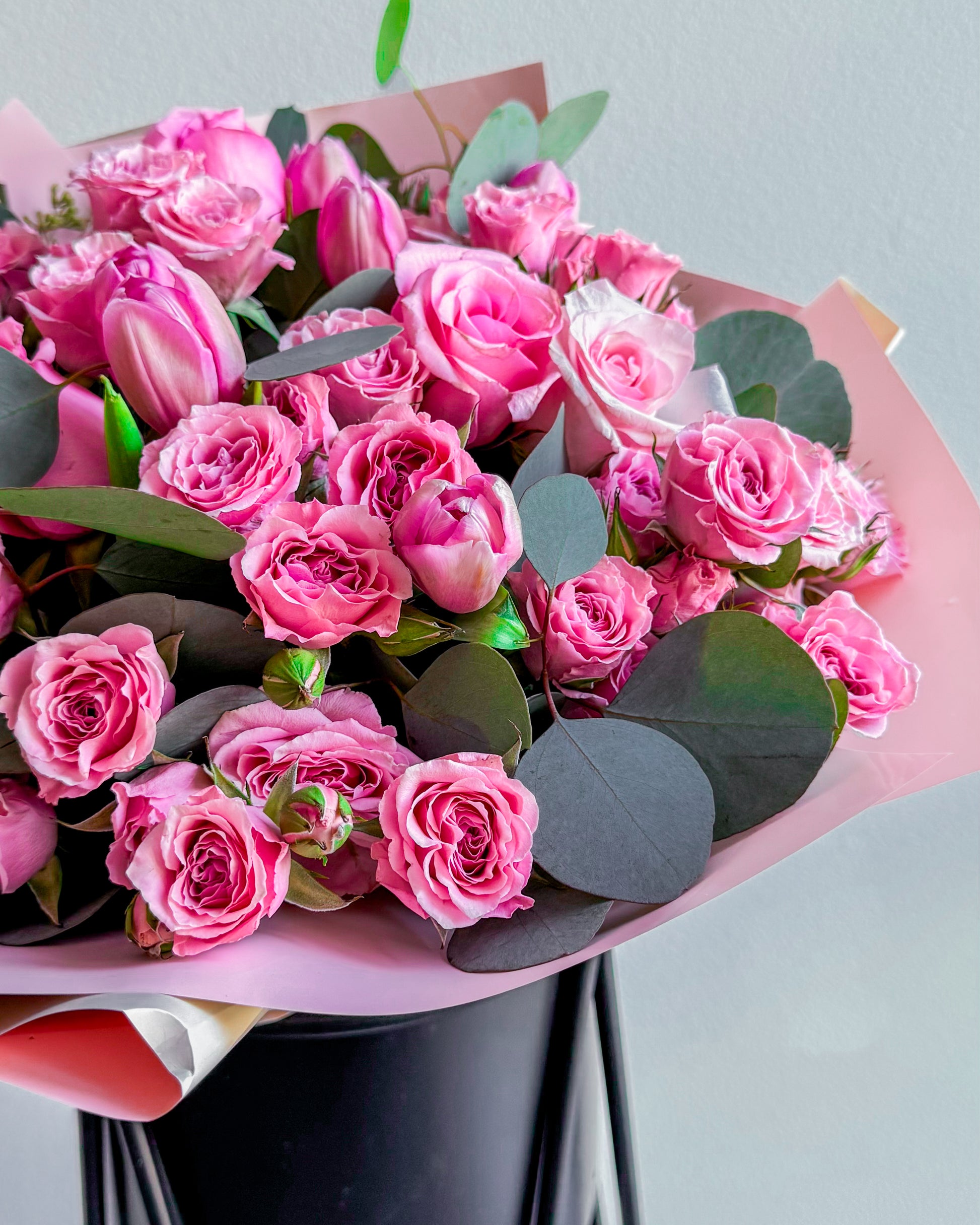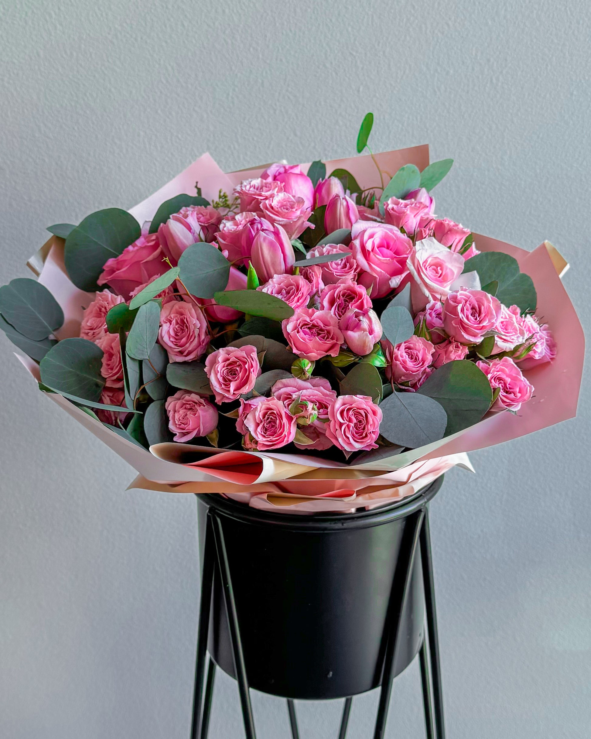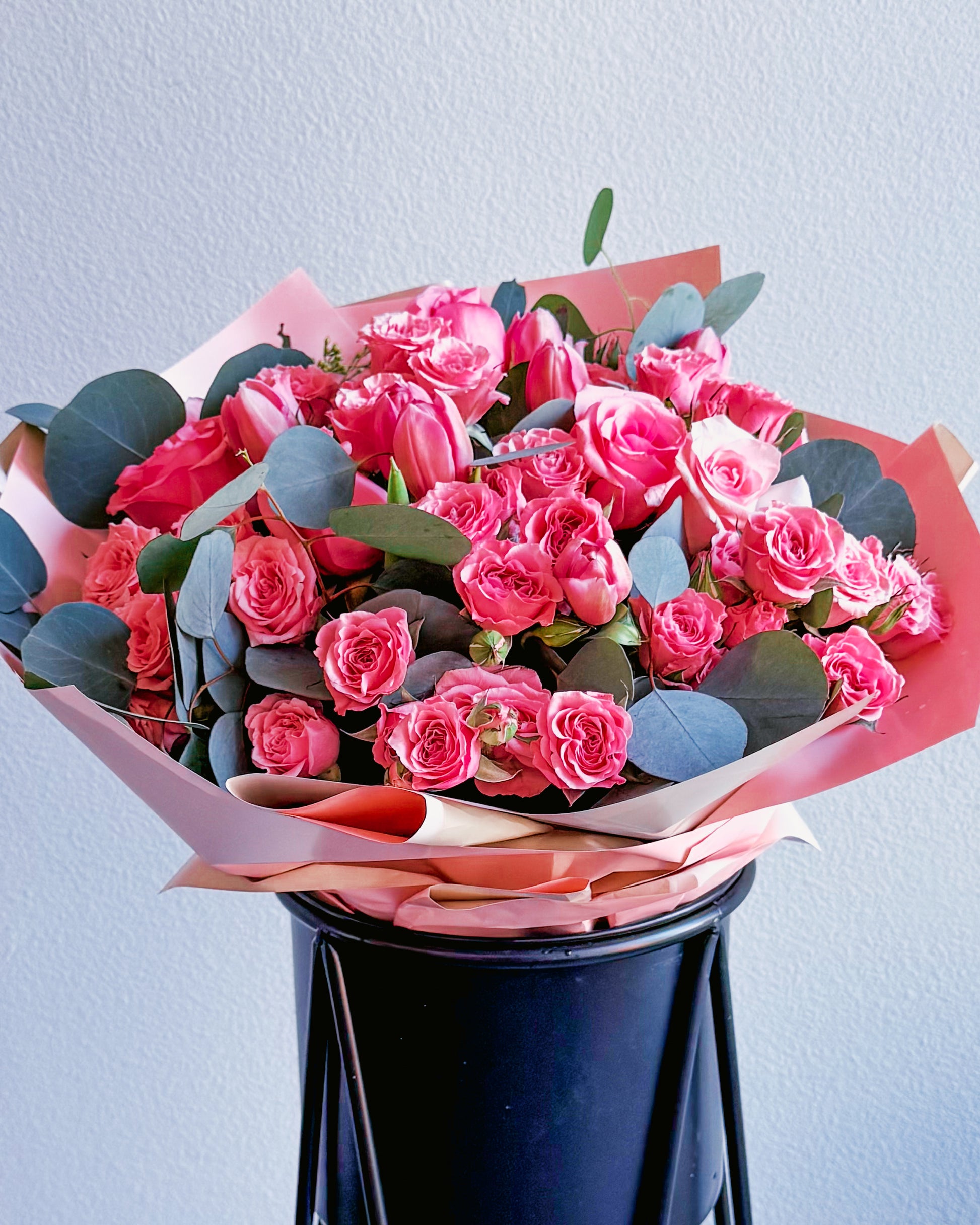 This bouquet is straight-up romance goals! You got these lush pink roses and tulips sittin’ pretty, all wrapped up in a soft pink vibe with that classy eucalyptus flex. It’s like a sunset in a bundle - sweet, flirty, and a lil’ extra (in the best way). Perfect for makin’ someone’s day or just flexin’ on how good your taste is.
