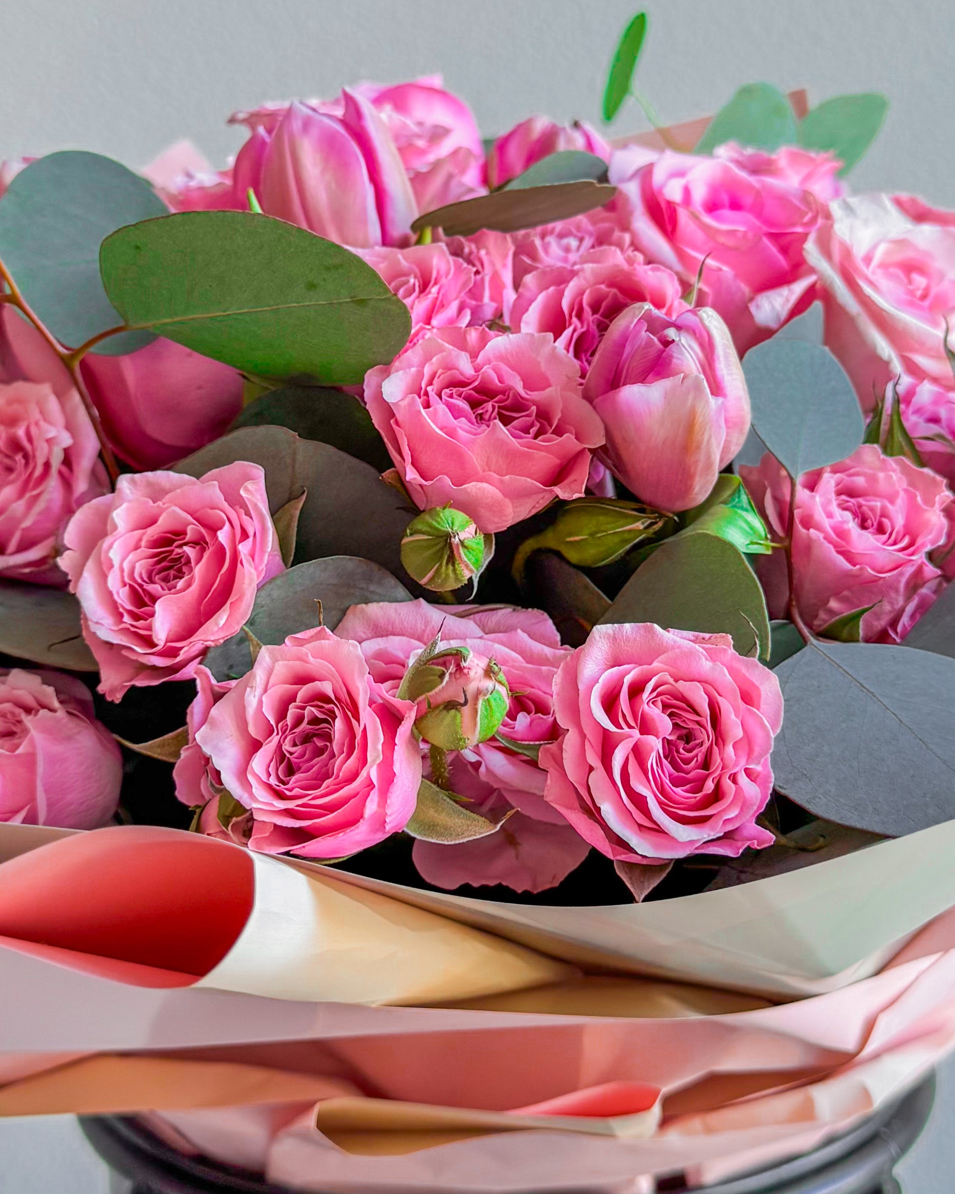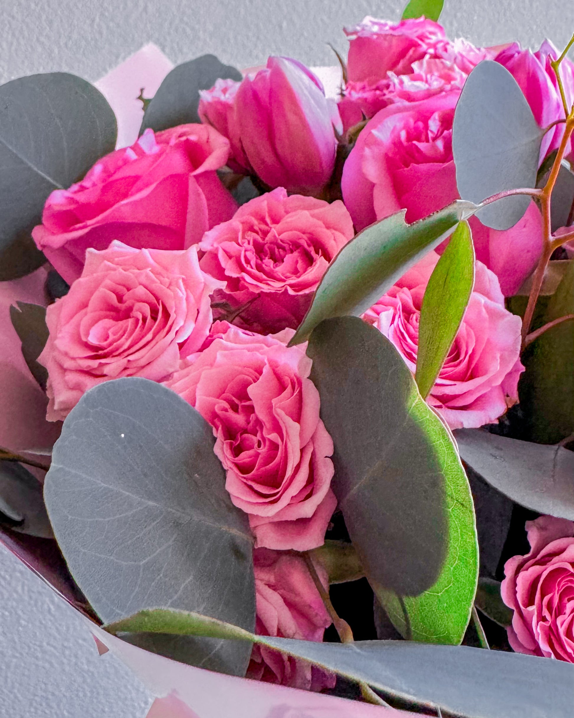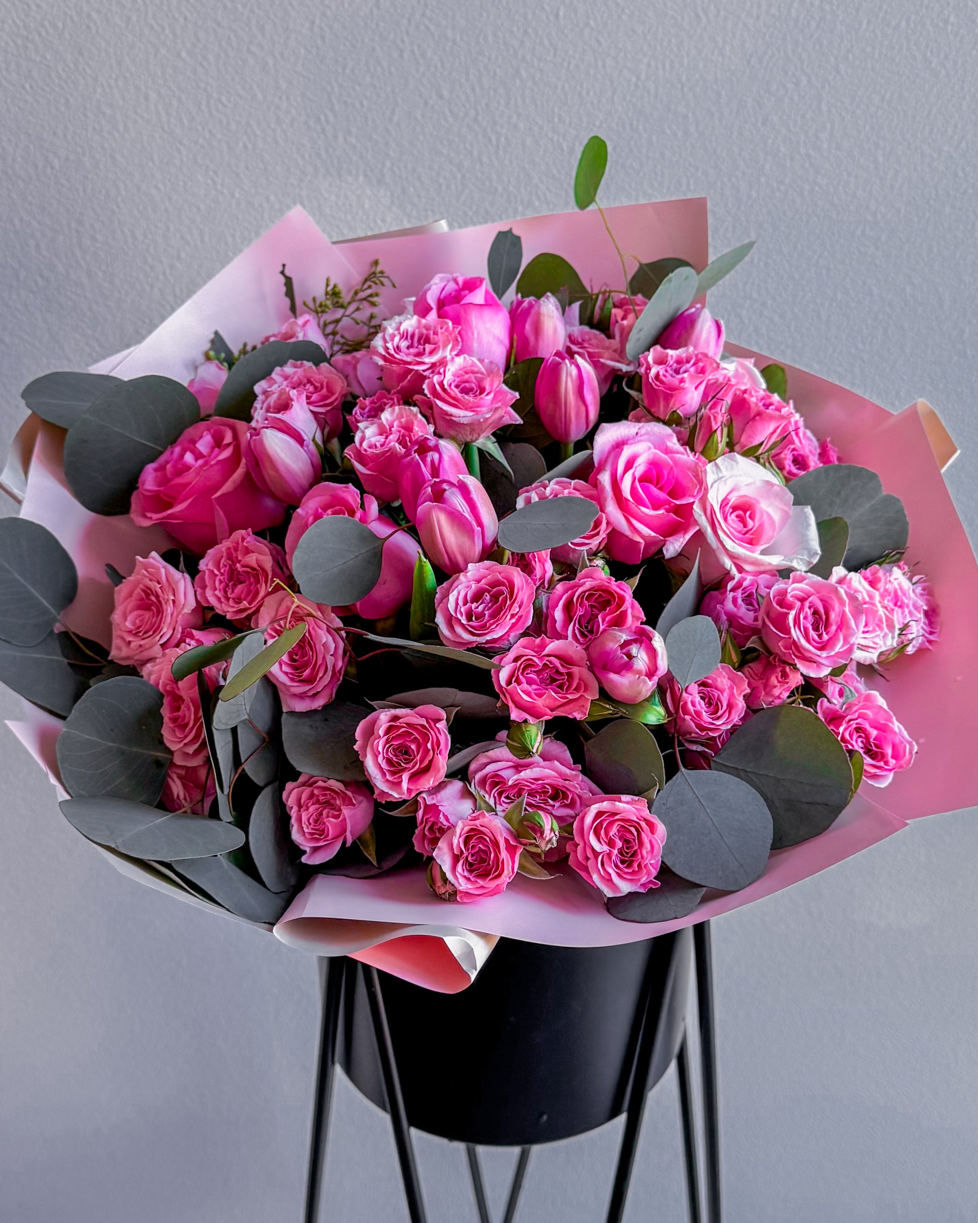 This bouquet is straight-up romance goals! You got these lush pink roses and tulips sittin’ pretty, all wrapped up in a soft pink vibe with that classy eucalyptus flex. It’s like a sunset in a bundle - sweet, flirty, and a lil’ extra (in the best way). Perfect for makin’ someone’s day or just flexin’ on how good your taste is.