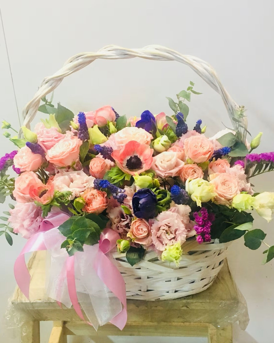 White basket with flowers of different colors and types, decorated with a pink ribbon on the handle. The basket contains pink roses and ranunculus, blue anemones, purple snapdragons, and eucalyptus.