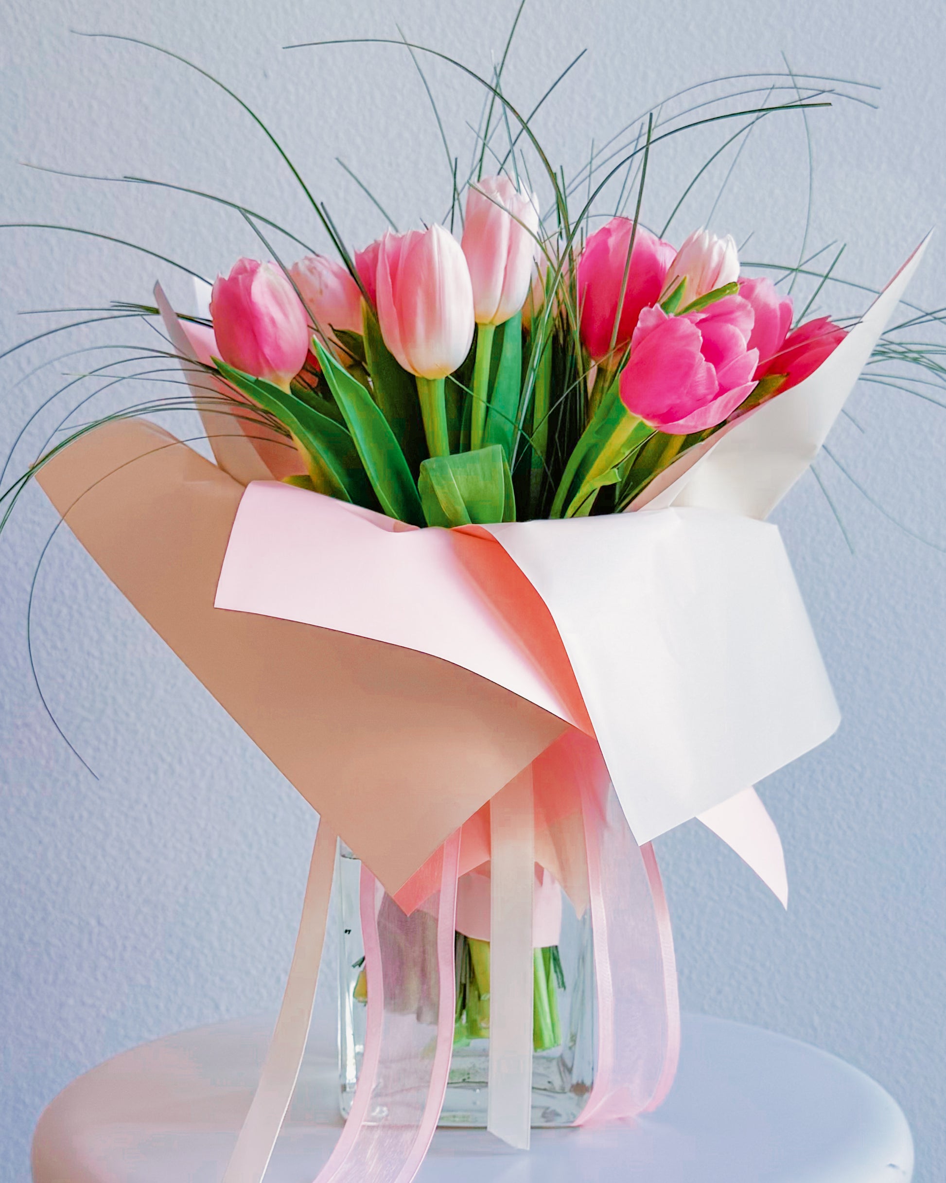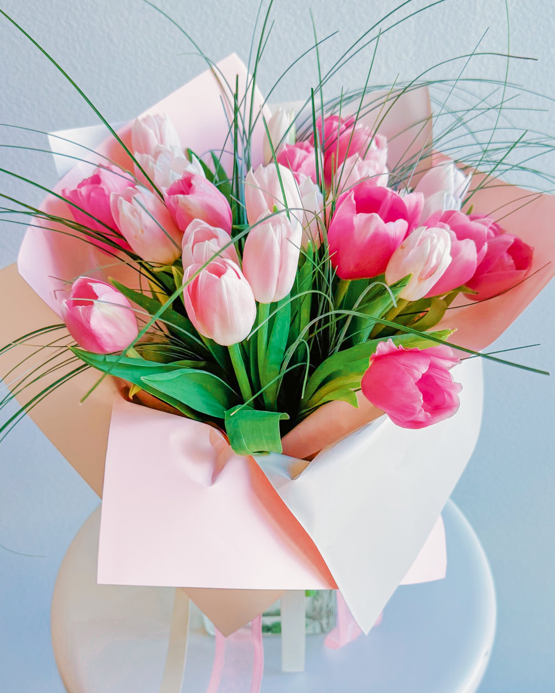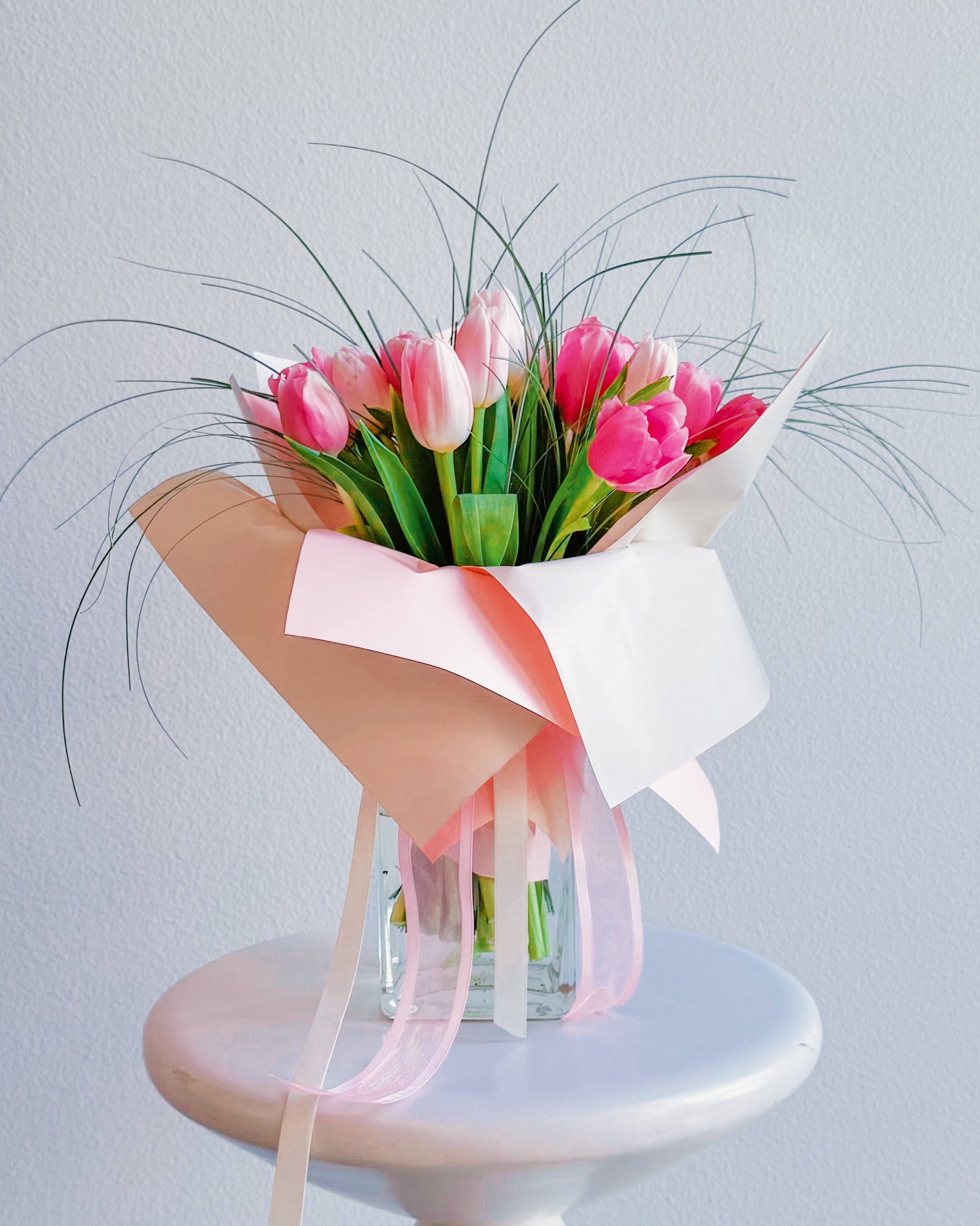 This bouquet is a gentle whisper of love and tenderness. The delicate tulips in shades of soft pink and vibrant magenta radiate pure emotion, evoking the first blush of romance or the warm embrace of cherished memories. Wrapped in pastel tones and complemented by wispy greenery, it feels like holding a spring meadow kissed by the morning sun.