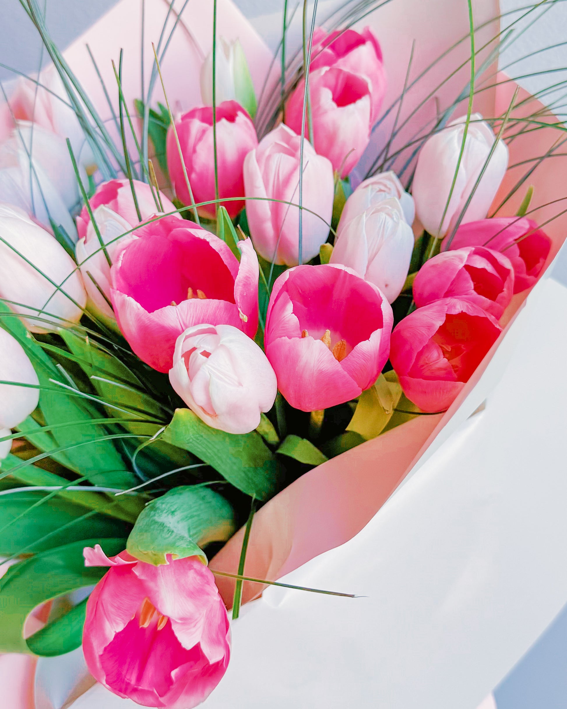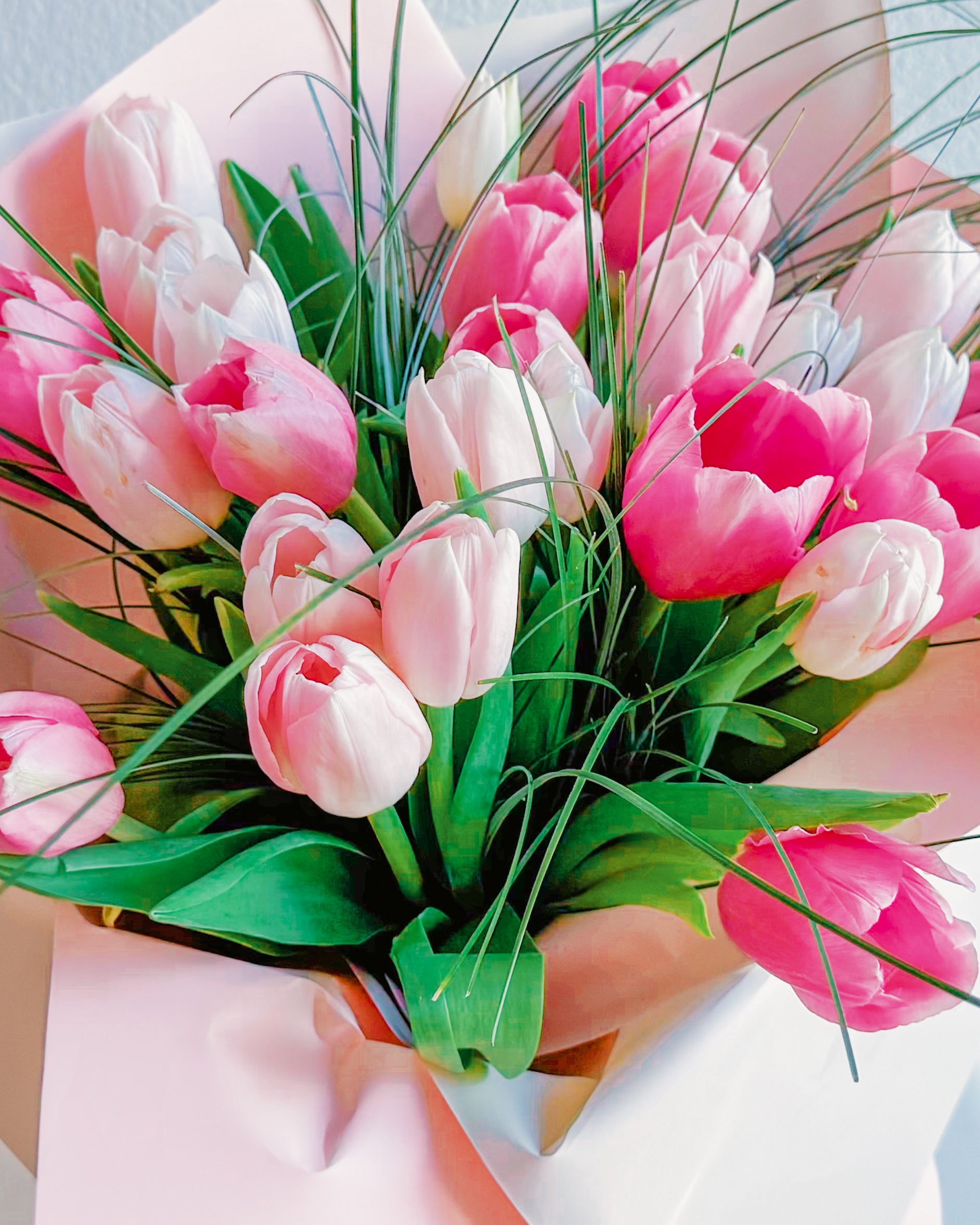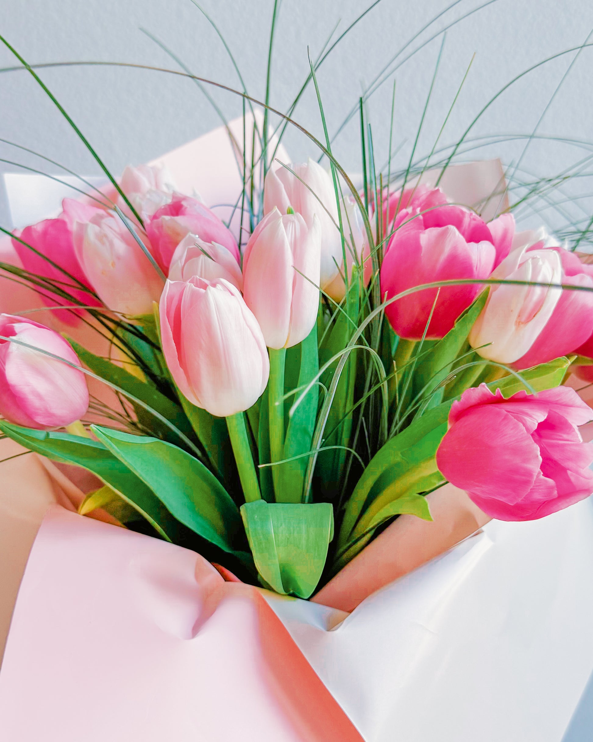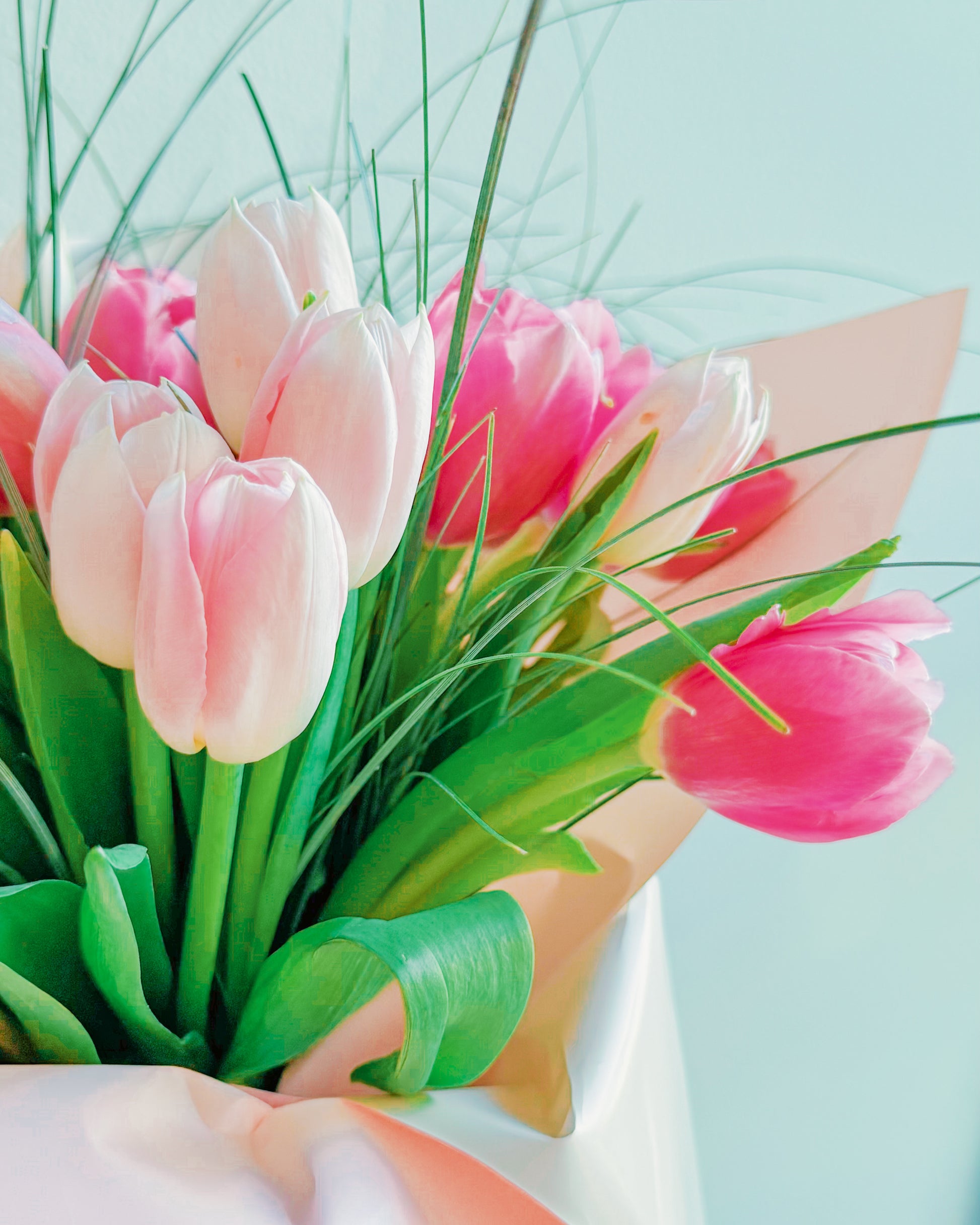 This bouquet is a gentle whisper of love and tenderness. The delicate tulips in shades of soft pink and vibrant magenta radiate pure emotion, evoking the first blush of romance or the warm embrace of cherished memories. Wrapped in pastel tones and complemented by wispy greenery, it feels like holding a spring meadow kissed by the morning sun.