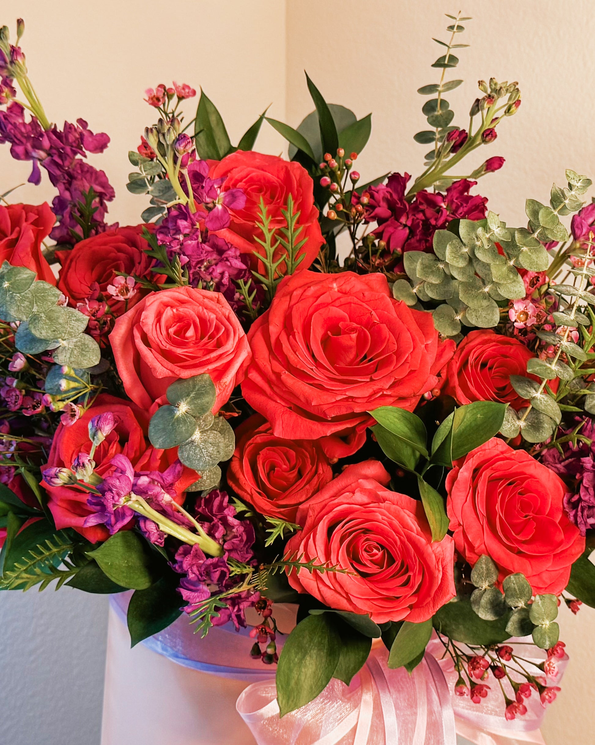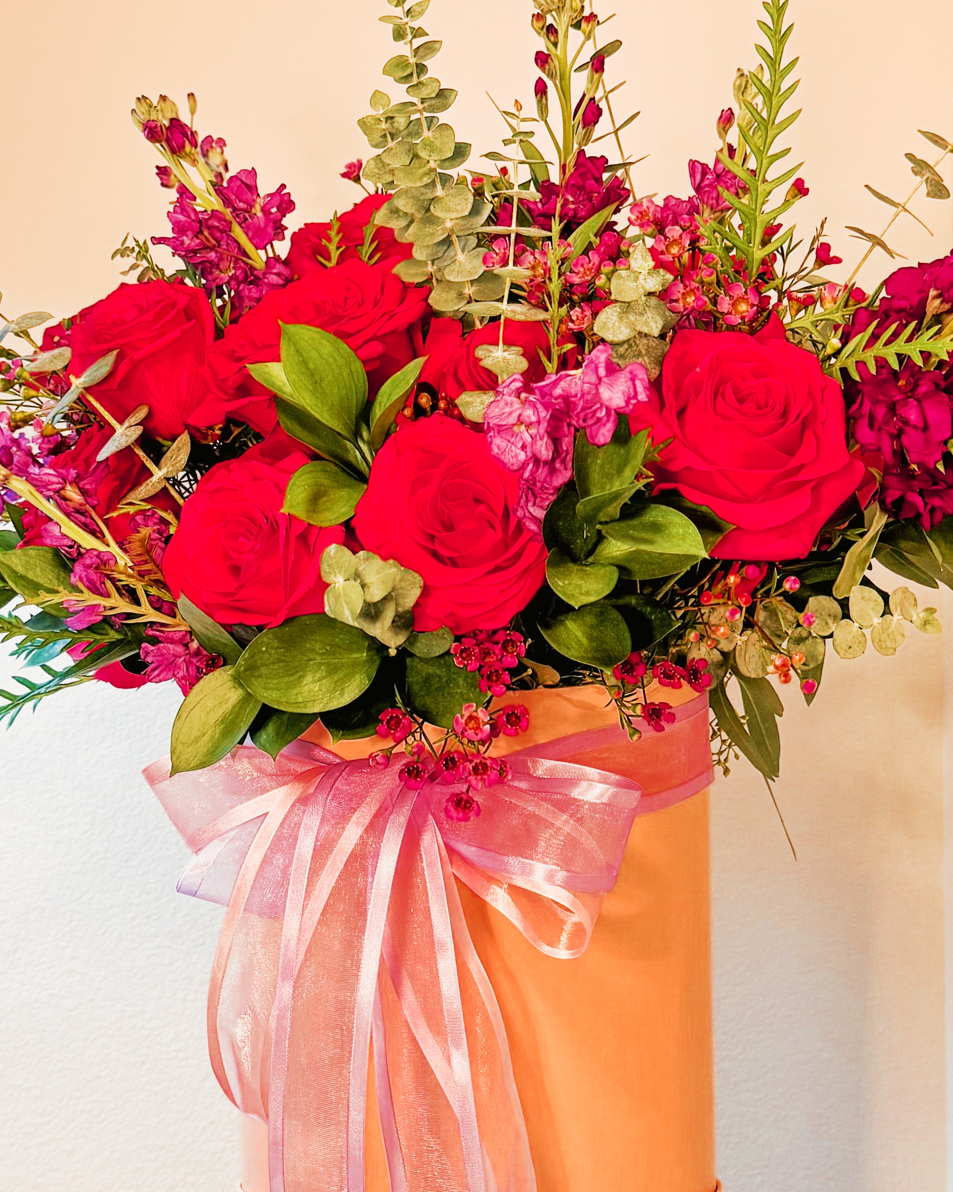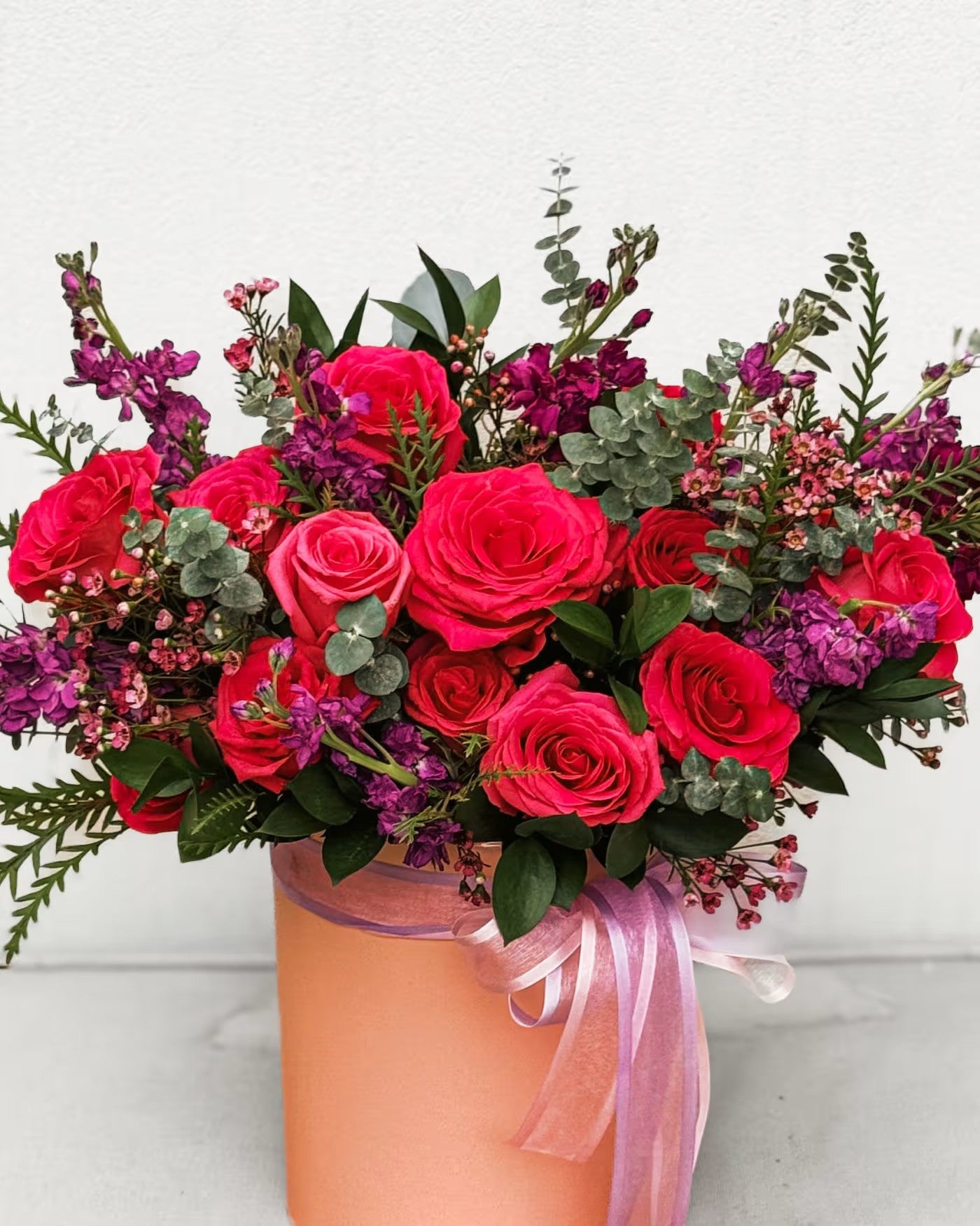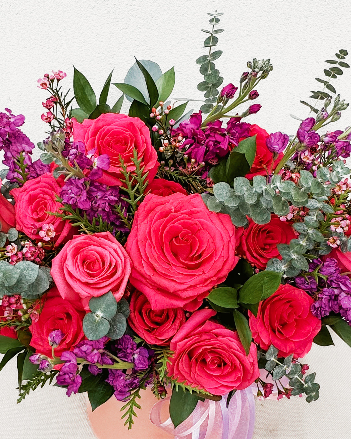 This vibrant bouquet radiates passion and elegance with its stunning combination of bold red and pink roses, rich purple stock flowers, and dainty pink wax flowers, all beautifully accented with lush greenery and silver eucalyptus. Arranged in a soft peach round hatbox and adorned with a delicate pink ribbon, it’s the perfect mix of romance and sophistication.