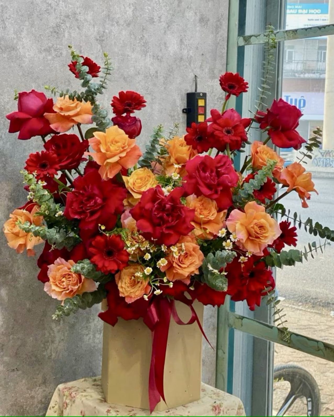 Express your deepest emotions with this heart-shaped arrangement of radiant red and warm orange roses, paired with elegant red gerberas and delicate chamomile blooms. Accented by lush eucalyptus and finished with a flowing crimson ribbon, this bouquet is a perfect symbol of love and passion.