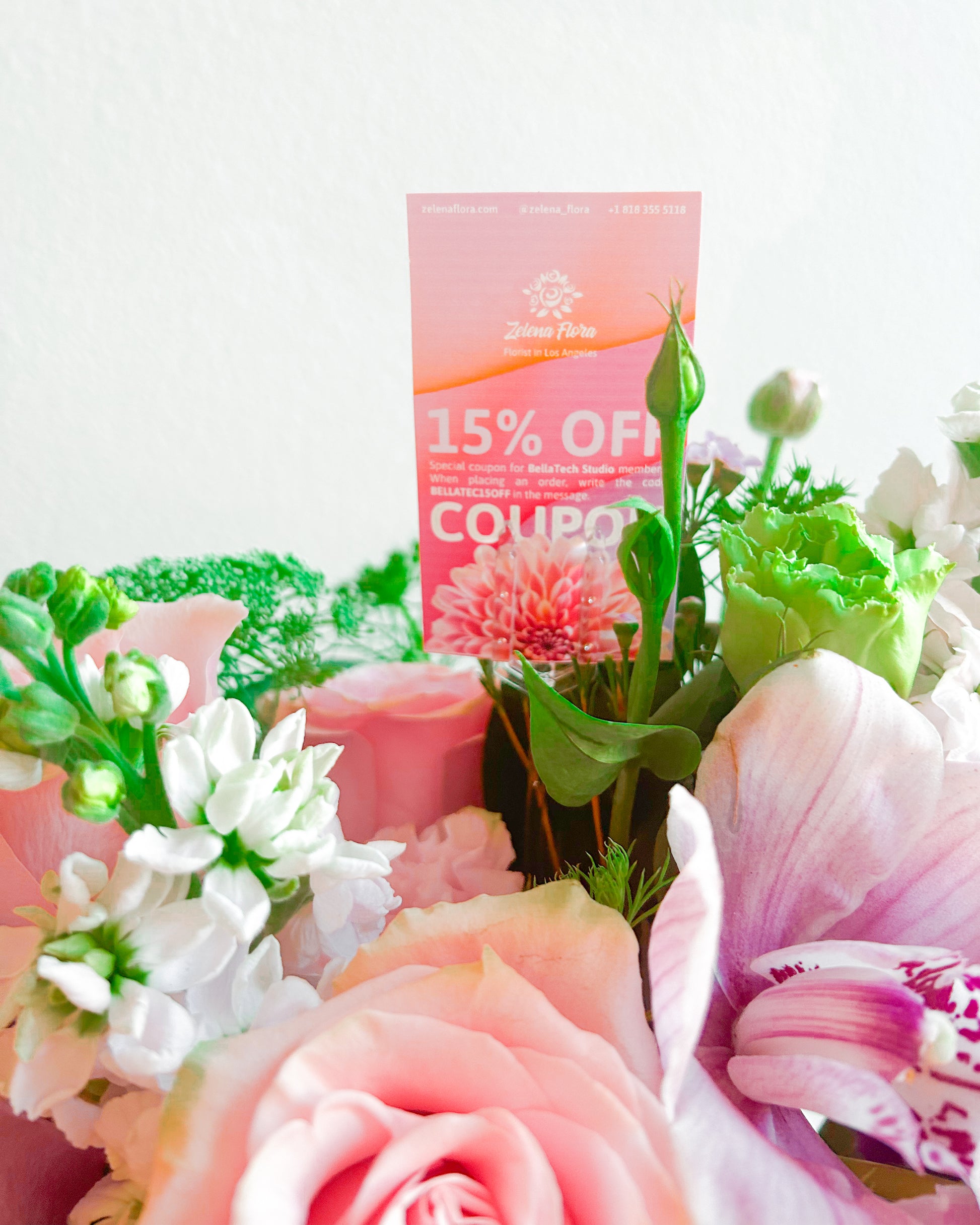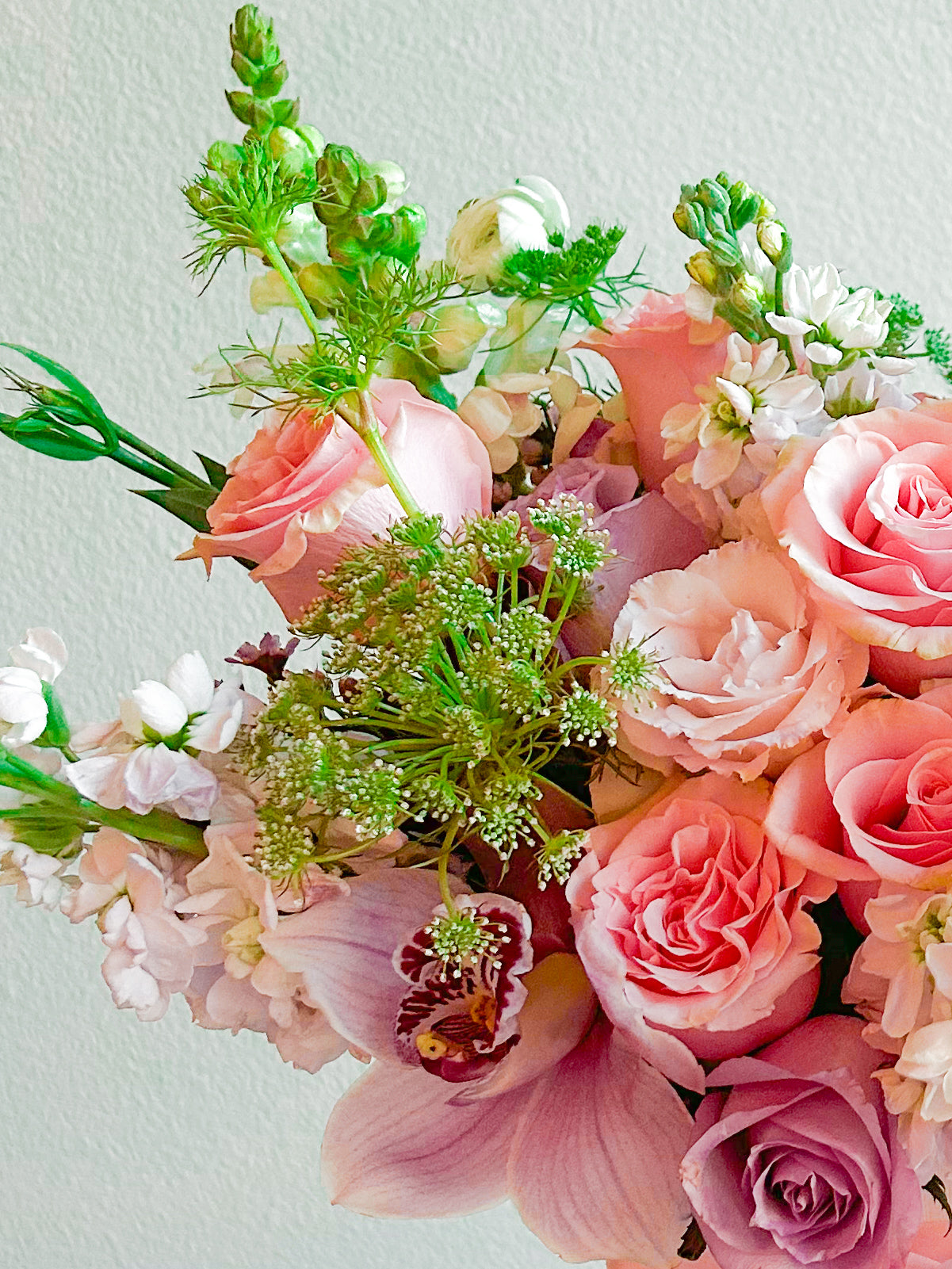 Flowers & Plants: Roses, orchids, stock flowers, lisianthus, Queen Anne’s lace, snapdragons, greenery.