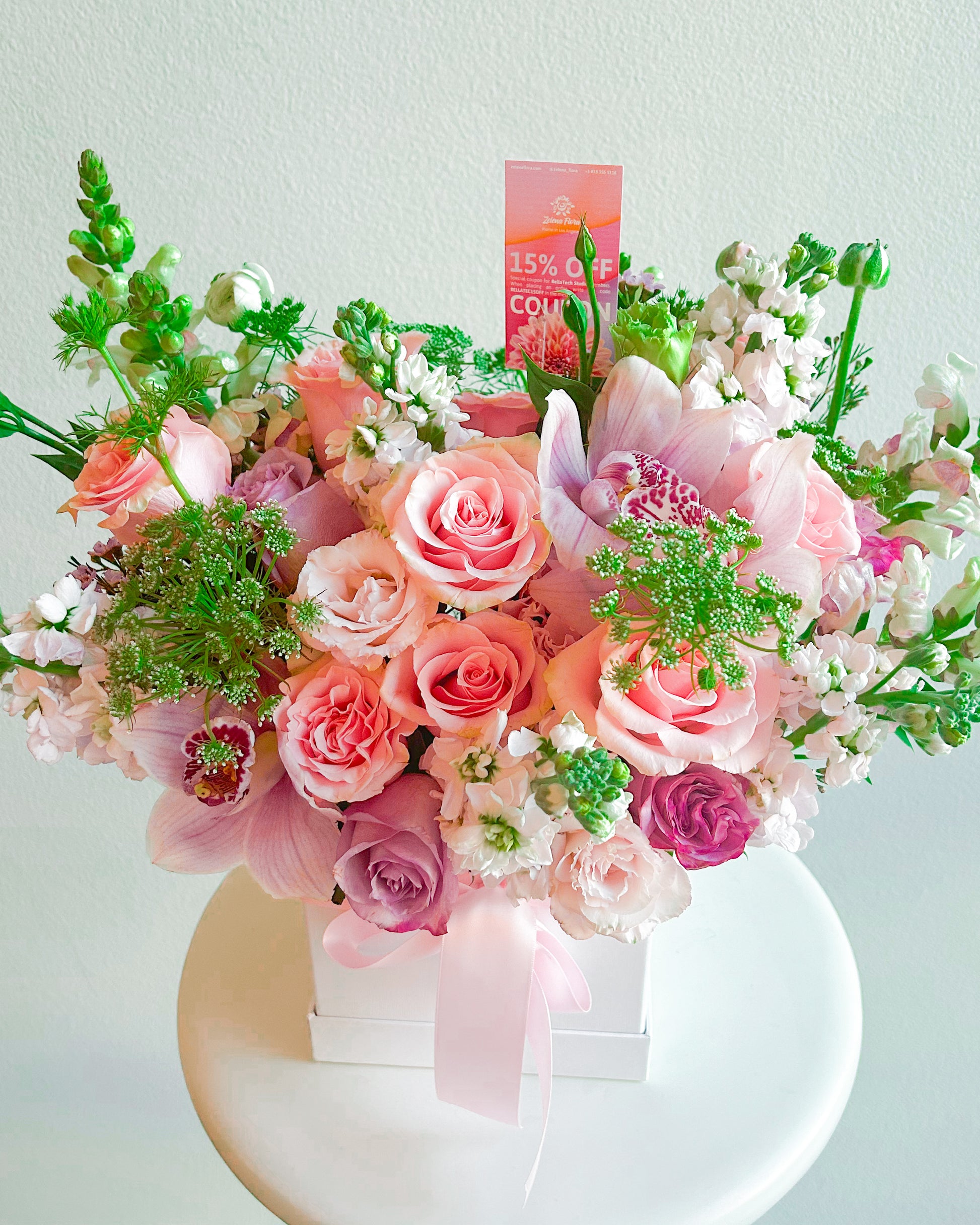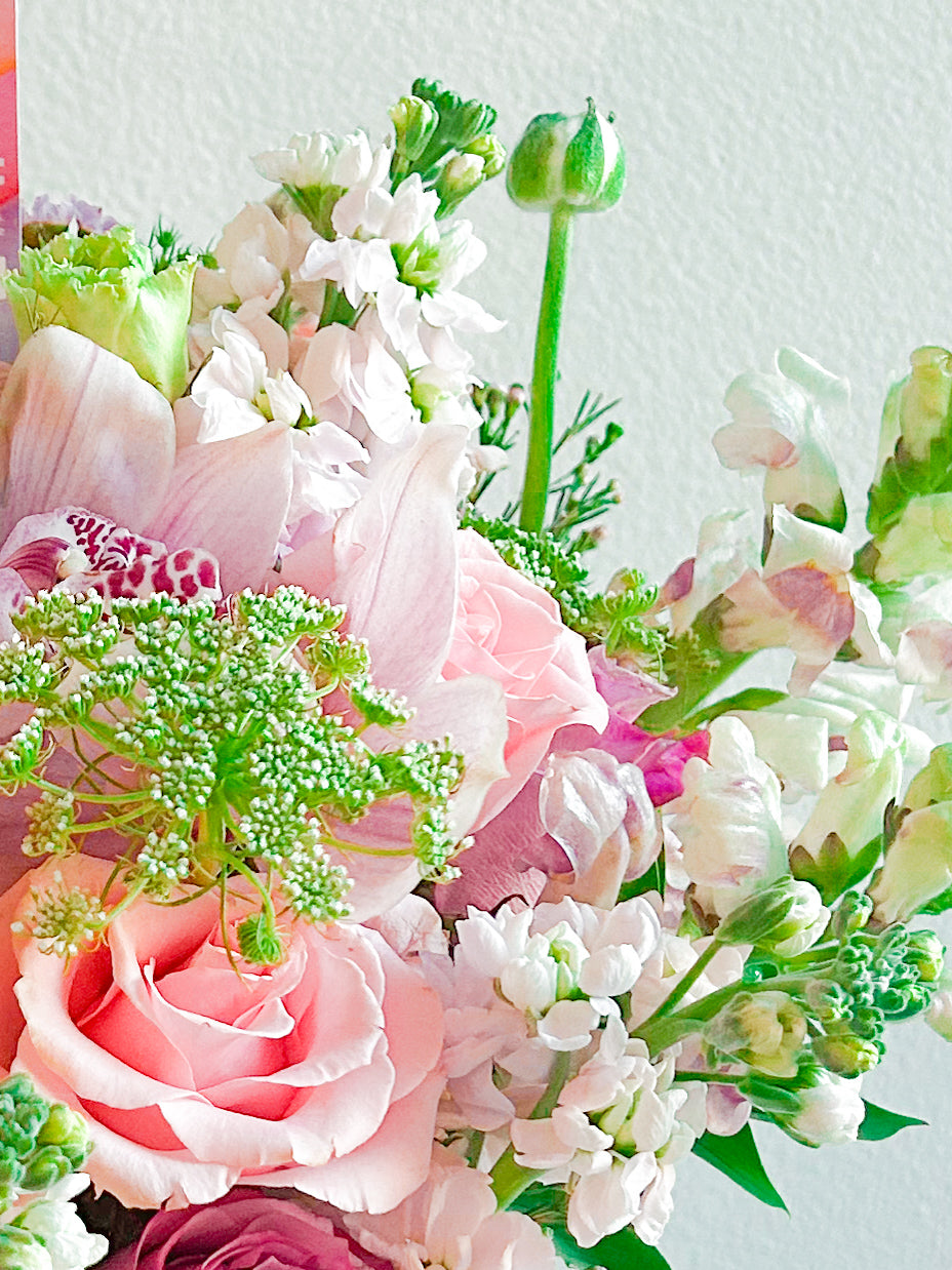 This bouquet? Straight-up gorgeous. Think soft pinks, lush greens, and that effortless “I woke up like this” kind of elegance. Roses, orchids, and delicate florals all come together in a dreamy, romantic explosion of color. It’s giving luxury, it’s giving fairytale, it’s giving you need this. Wrapped up in a chic box with a ribbon? Yeah, it’s a total statement.