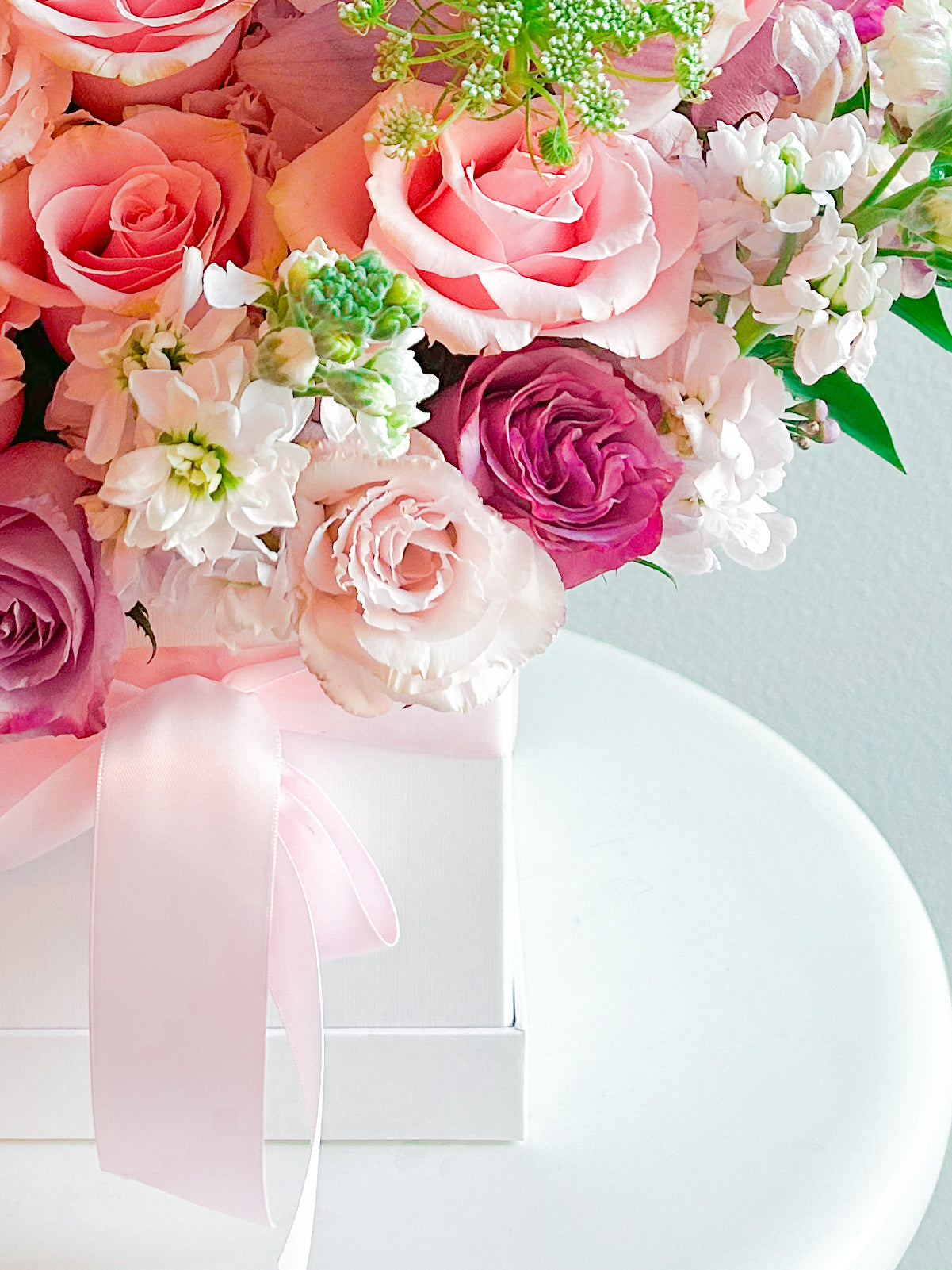 Fresh flowers, Satin ribbon, White gift box
