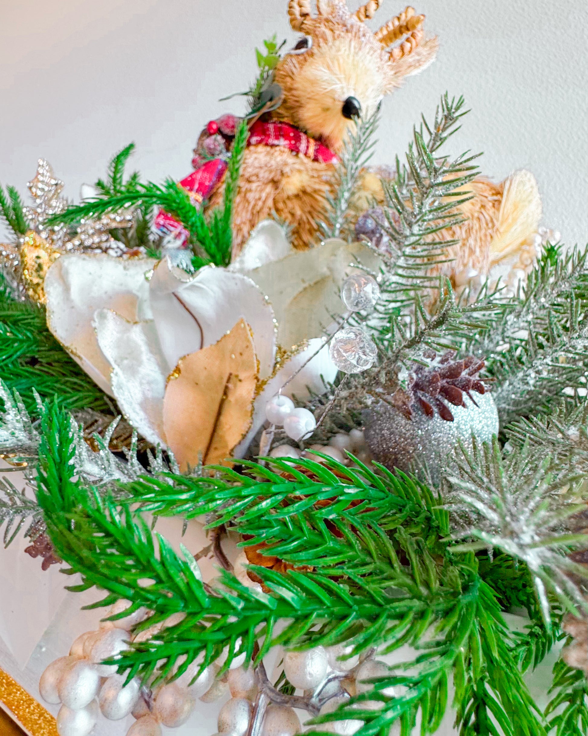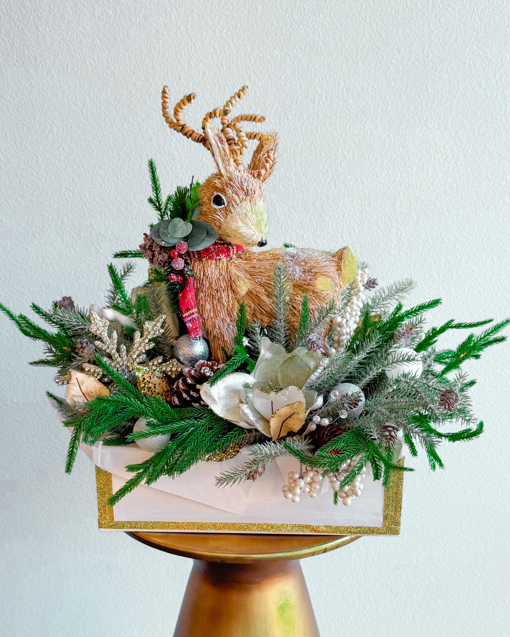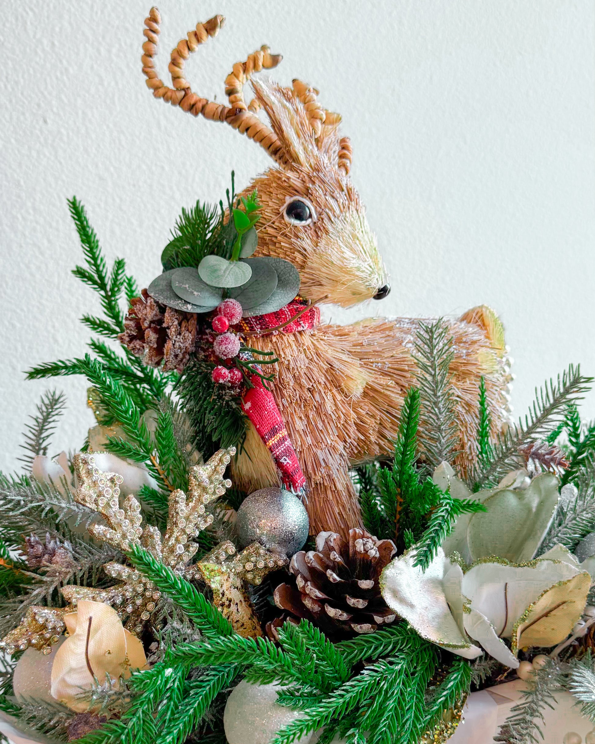 Fresh greens, natural cones, straw/reed reindeer, faux flowers/berries, glass or shatter-resistant ornaments, metallic ribbon, waterproof liner, kraft carry box, tissue/eco wrap, Zelenaflora care card.