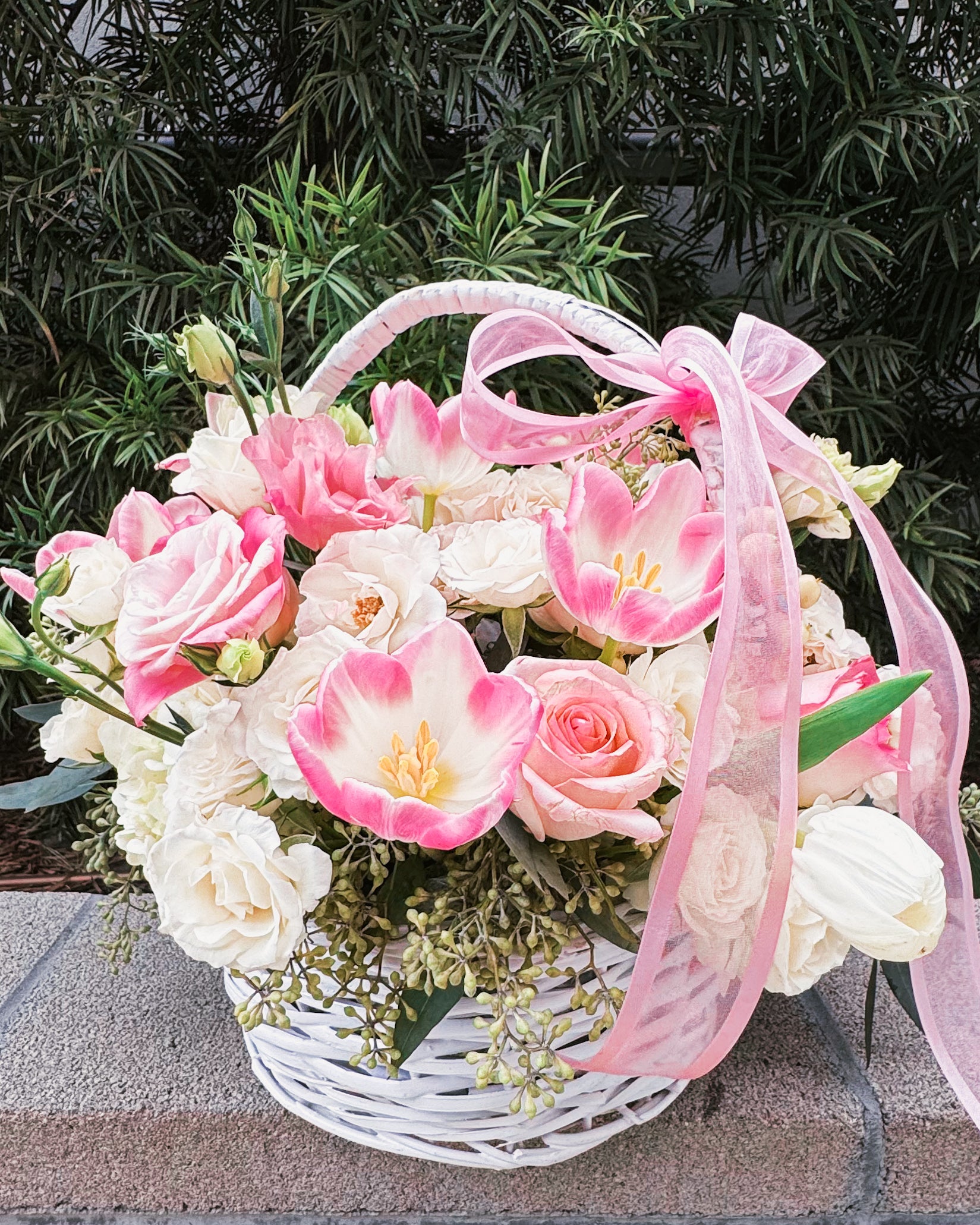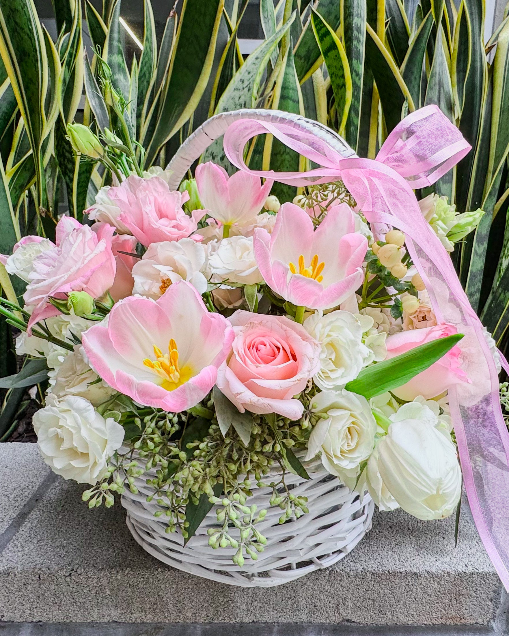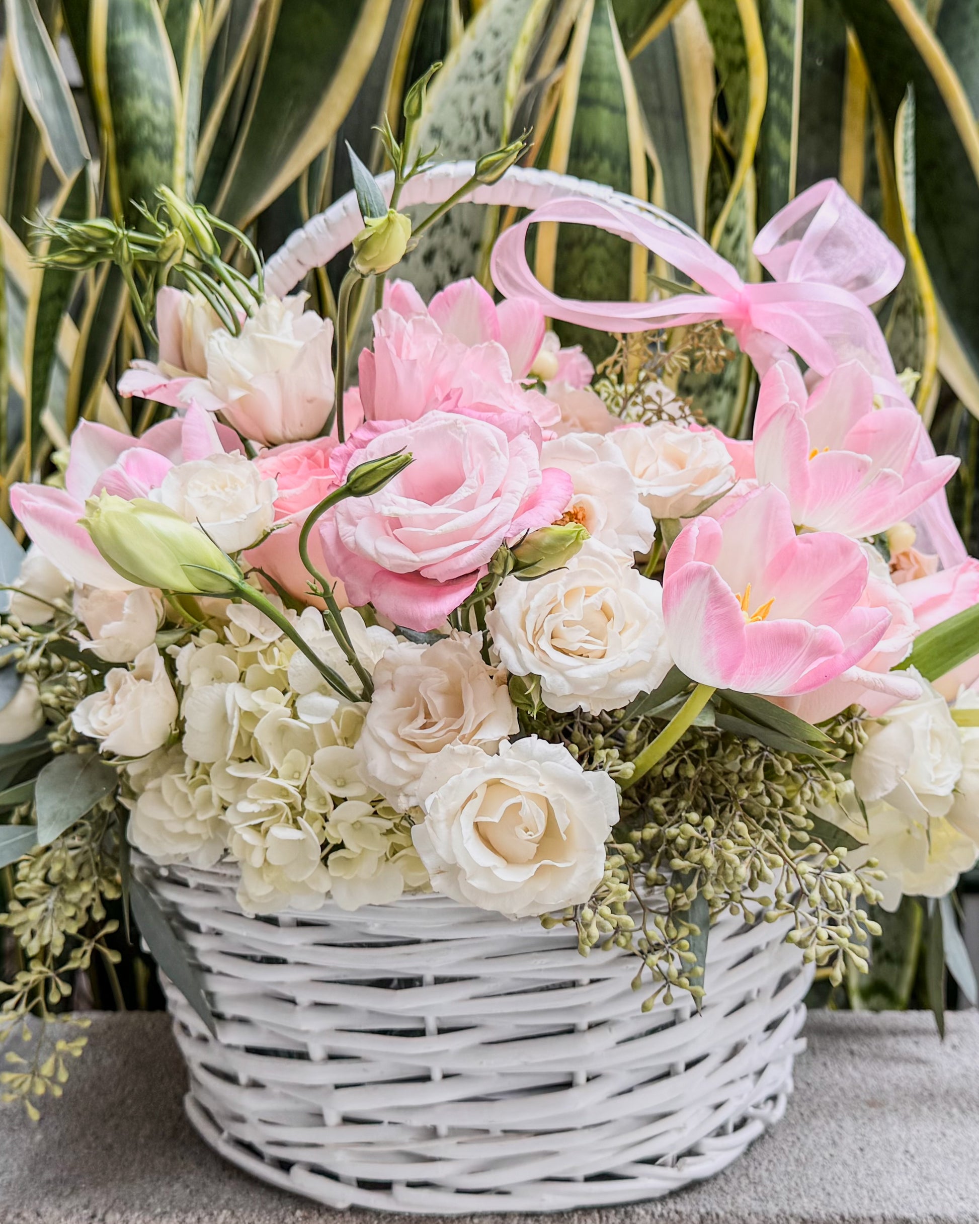 This charming basket bouquet brims with delicate pink roses, creamy white spray roses, and cheerful pink tulips, creating a soft, romantic harmony. Accented with lush white hydrangeas, lisianthus buds, eucalyptus leaves, and finished with a dainty pink ribbon, it is a perfect symbol of elegance and grace.