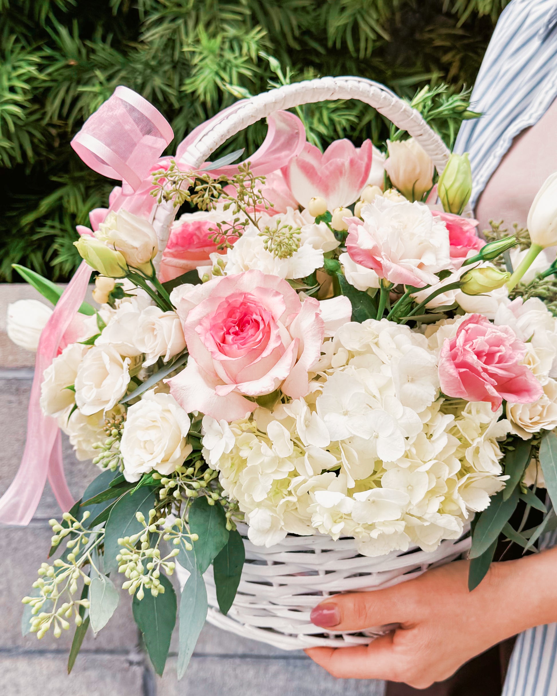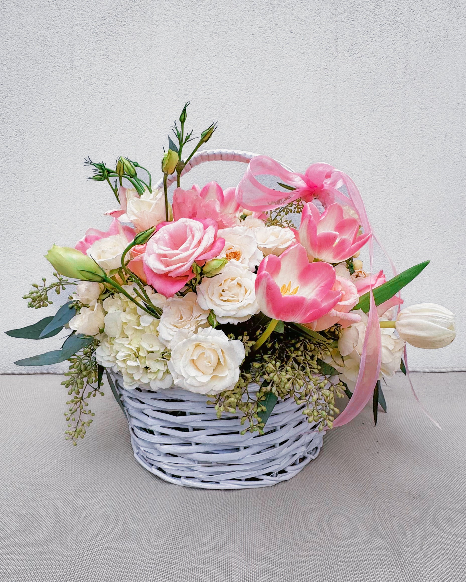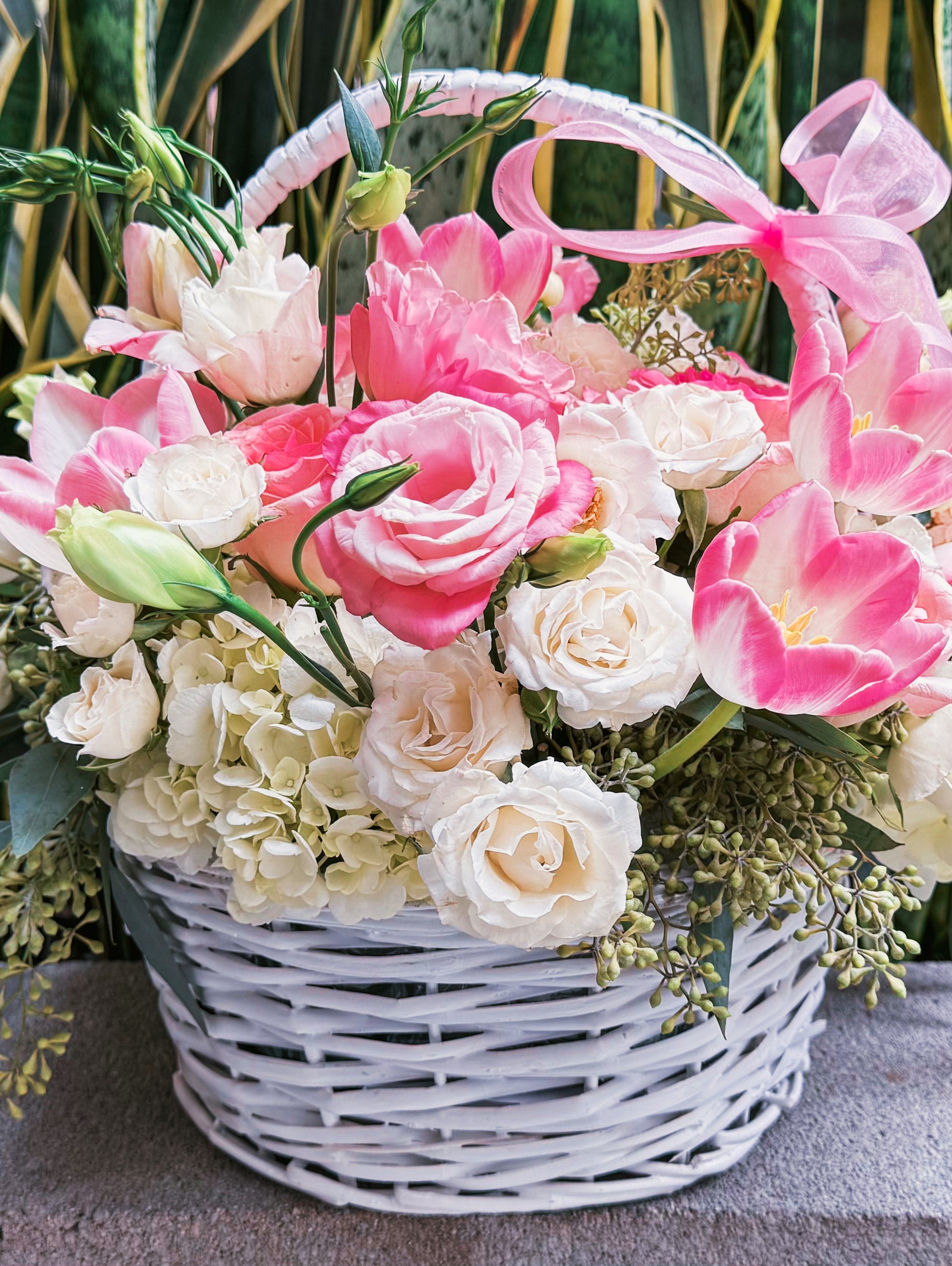 This charming basket bouquet brims with delicate pink roses, creamy white spray roses, and cheerful pink tulips, creating a soft, romantic harmony. Accented with lush white hydrangeas, lisianthus buds, eucalyptus leaves, and finished with a dainty pink ribbon, it is a perfect symbol of elegance and grace.