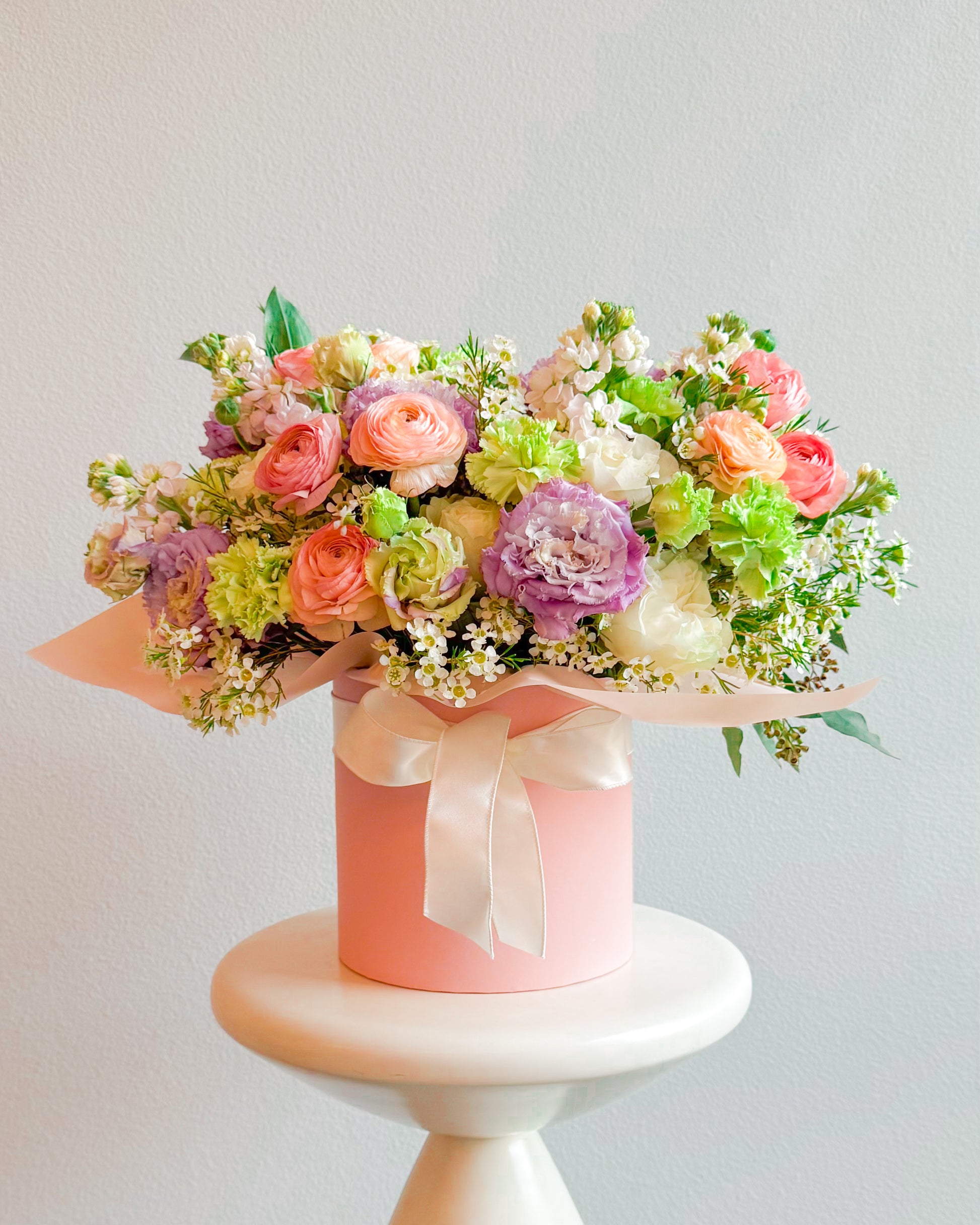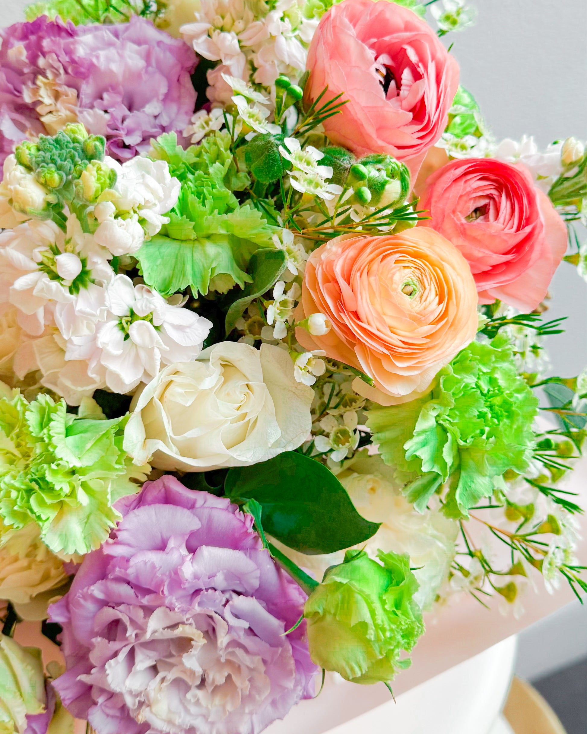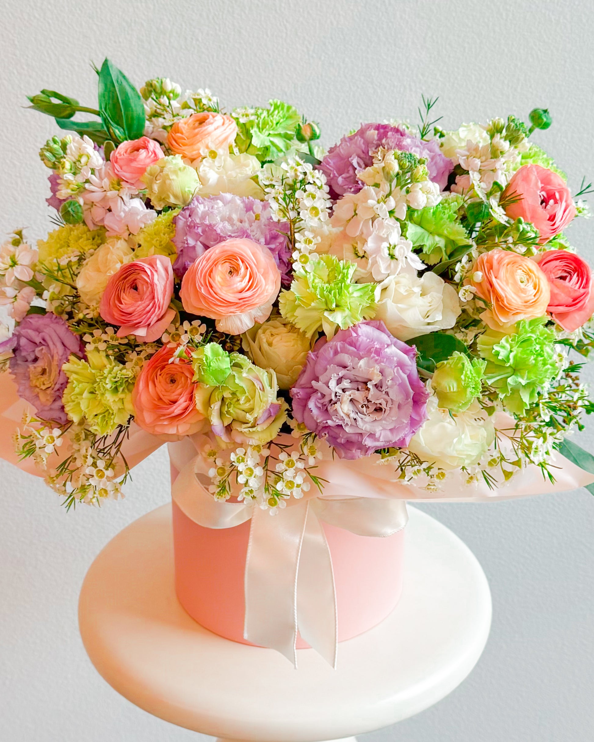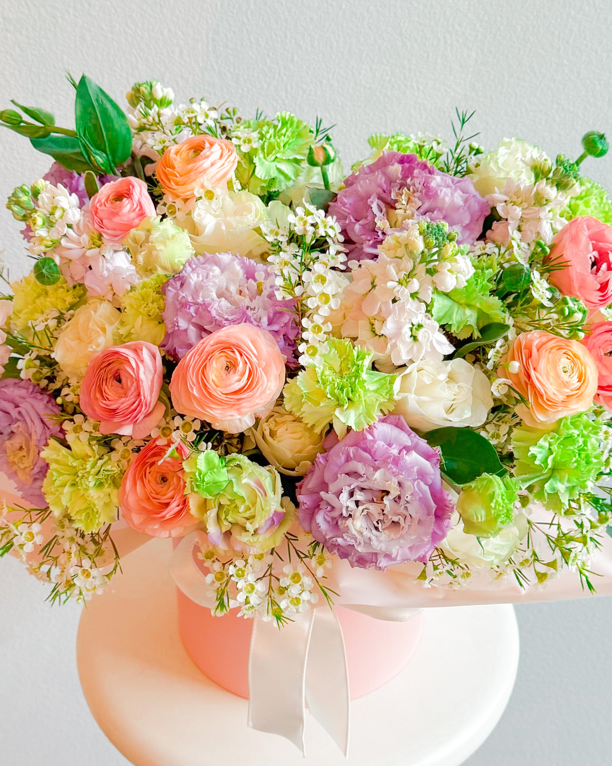 Picture this: a sunny afternoon in LA, the skyline glowing golden, and in your hands - a bouquet as effortlessly stylish as the city itself. Soft peach ranunculus, lavender lisianthus, and lush white roses mingle with fresh greens, wrapped in a sleek pastel box. Whether it’s love, gratitude, or just a ‘treat yourself’ moment - this bouquet speaks your vibe. Fresh, dreamy, and totally Insta-worthy. Go ahead, make someone’s day. Or your own.