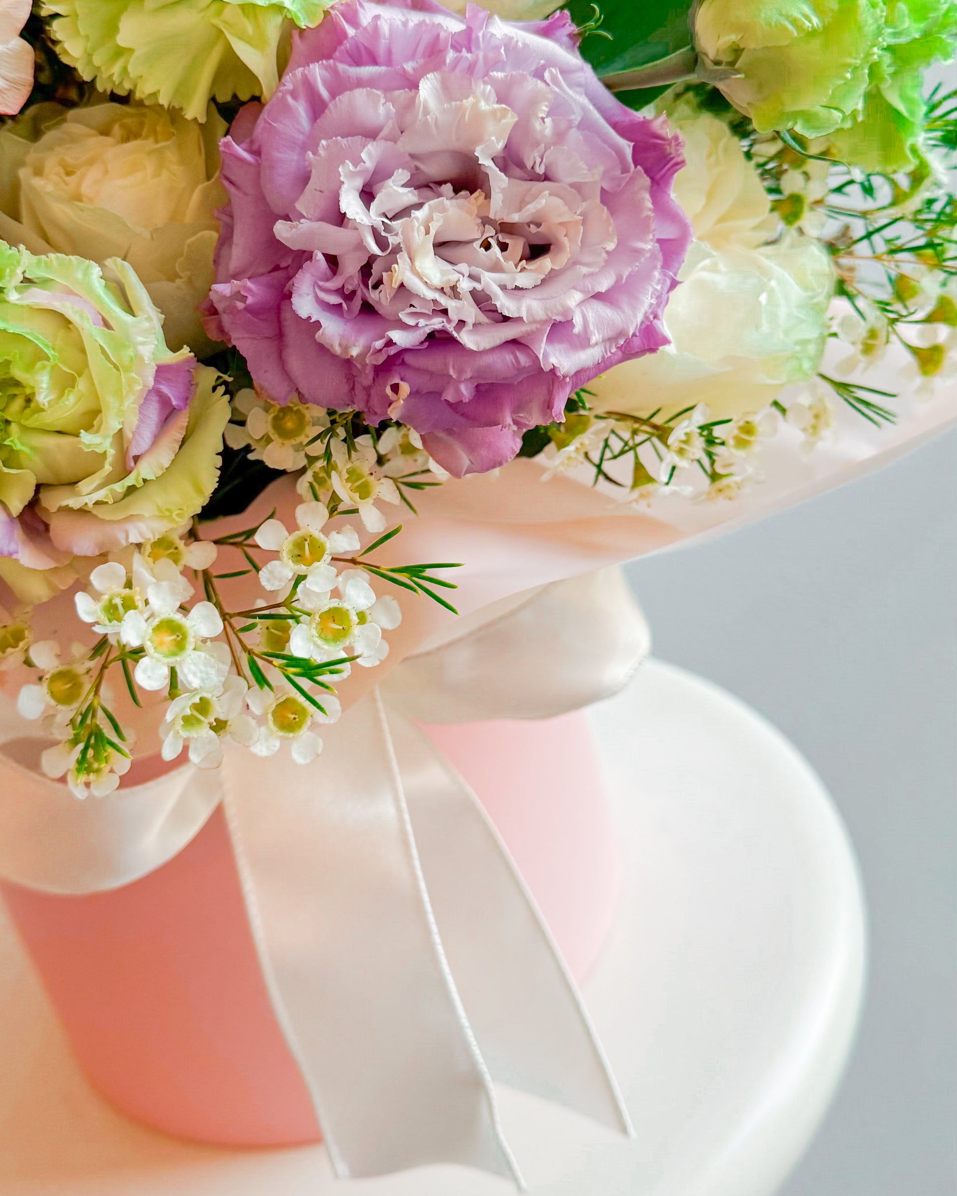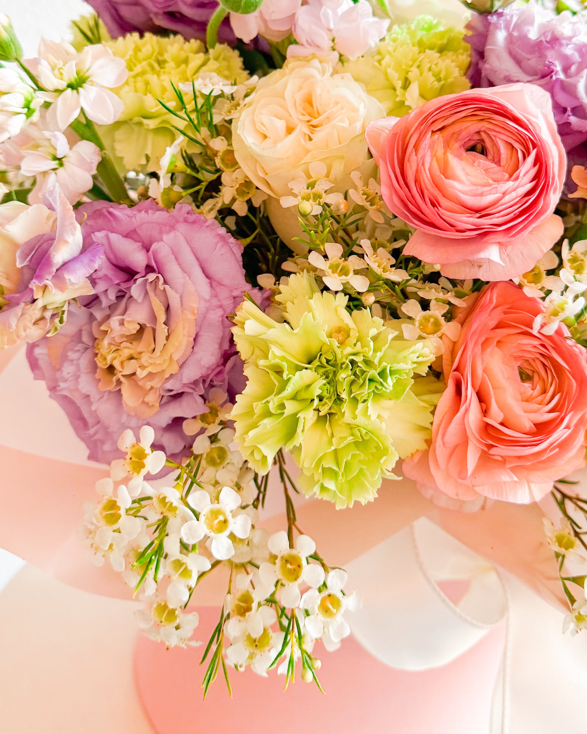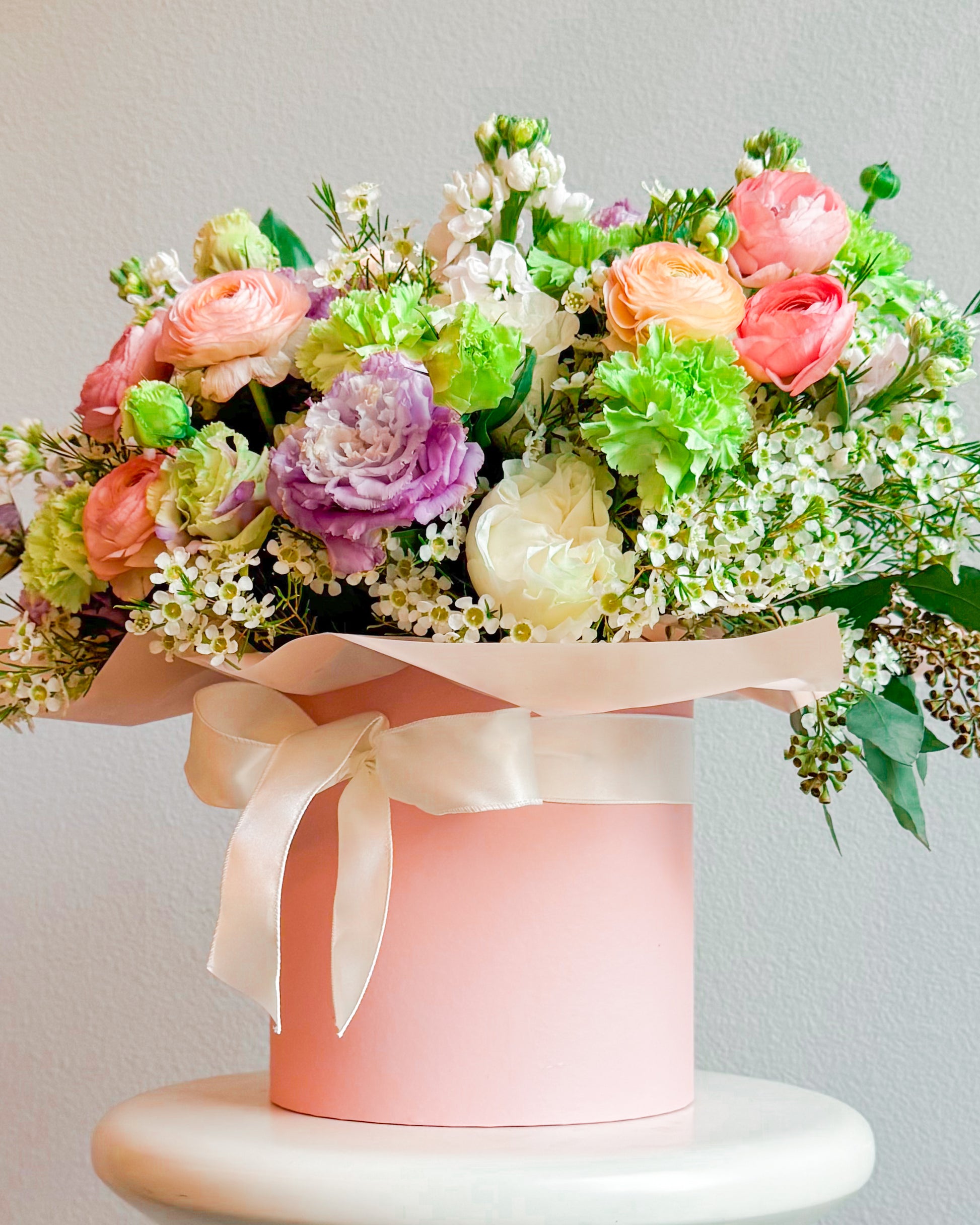 Fresh Flowers, Satin Ribbon, Pastel-Colored Hat Box, Floral Foam for Hydration.