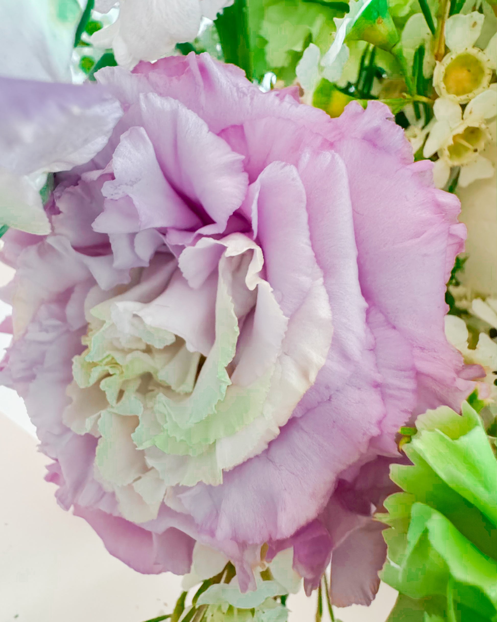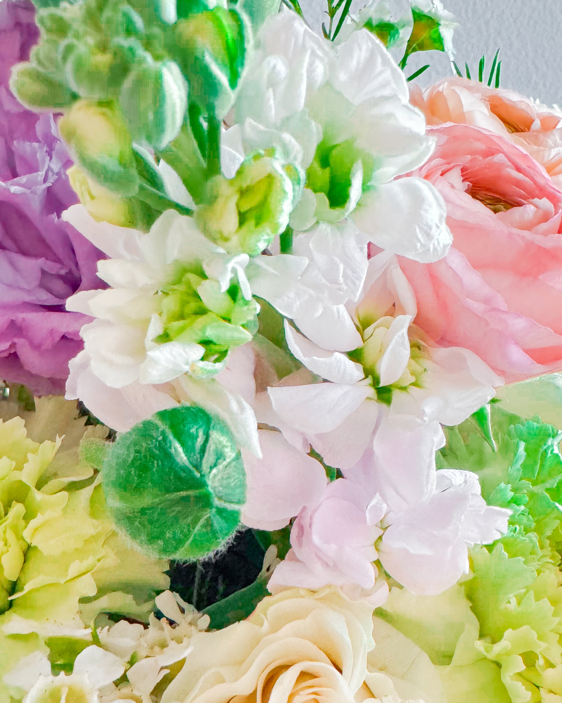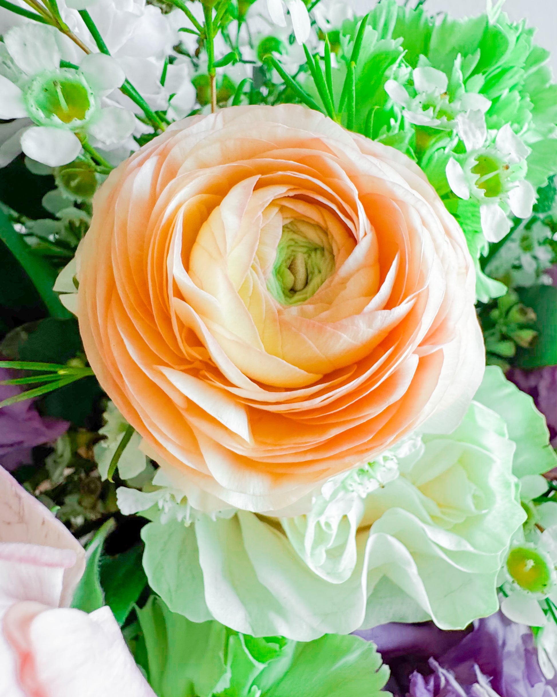 Flowers: Ranunculus, Lisianthus, Roses, Spray Roses, Waxflowers, Stock Flowers, Carnations.