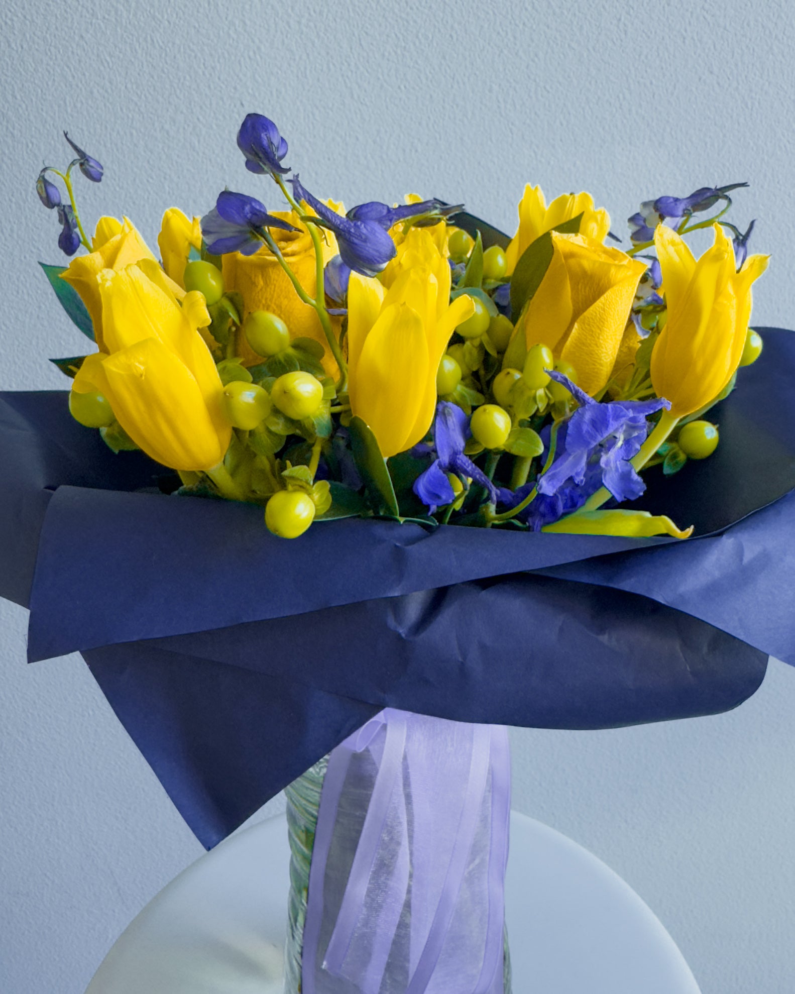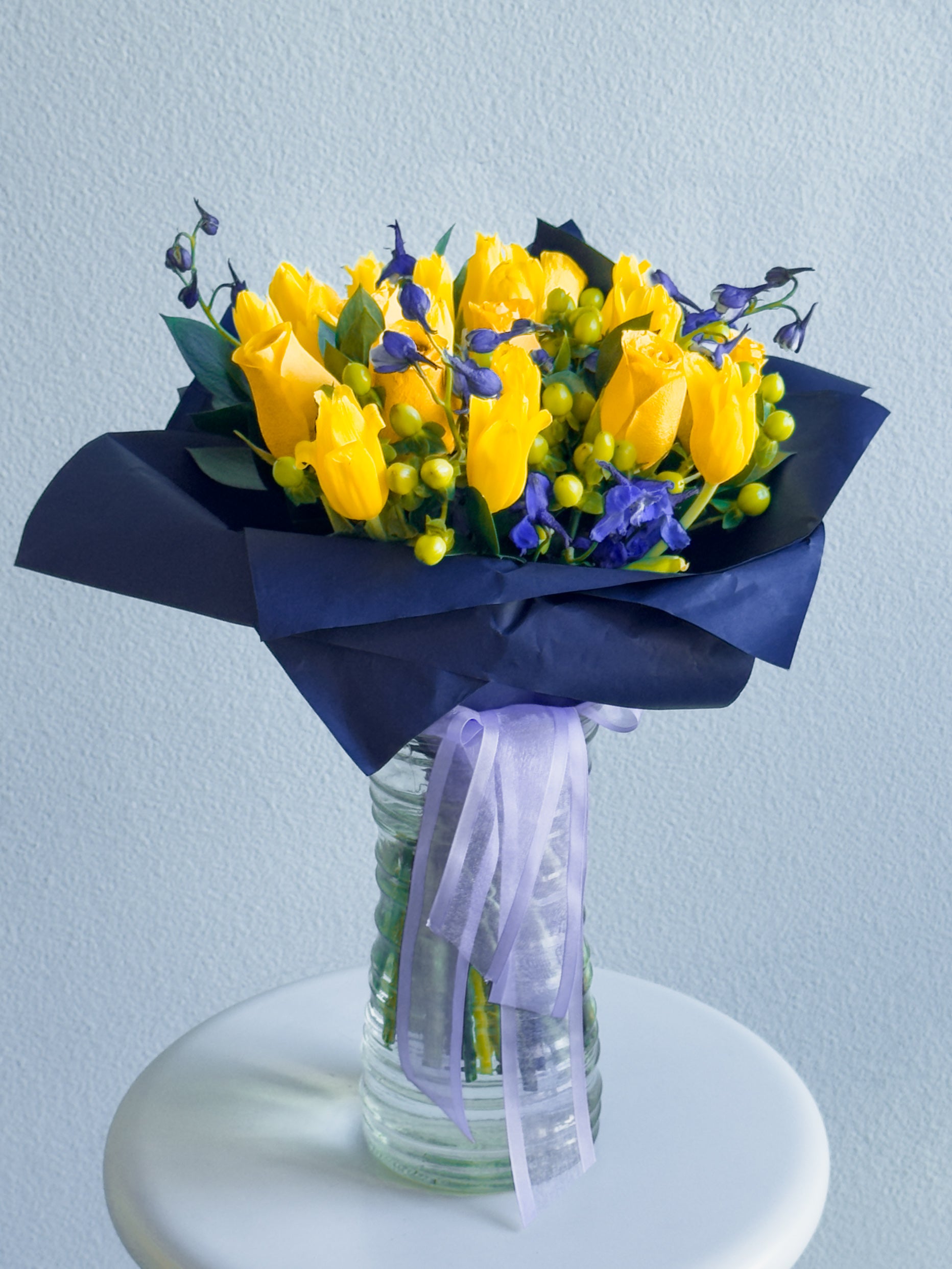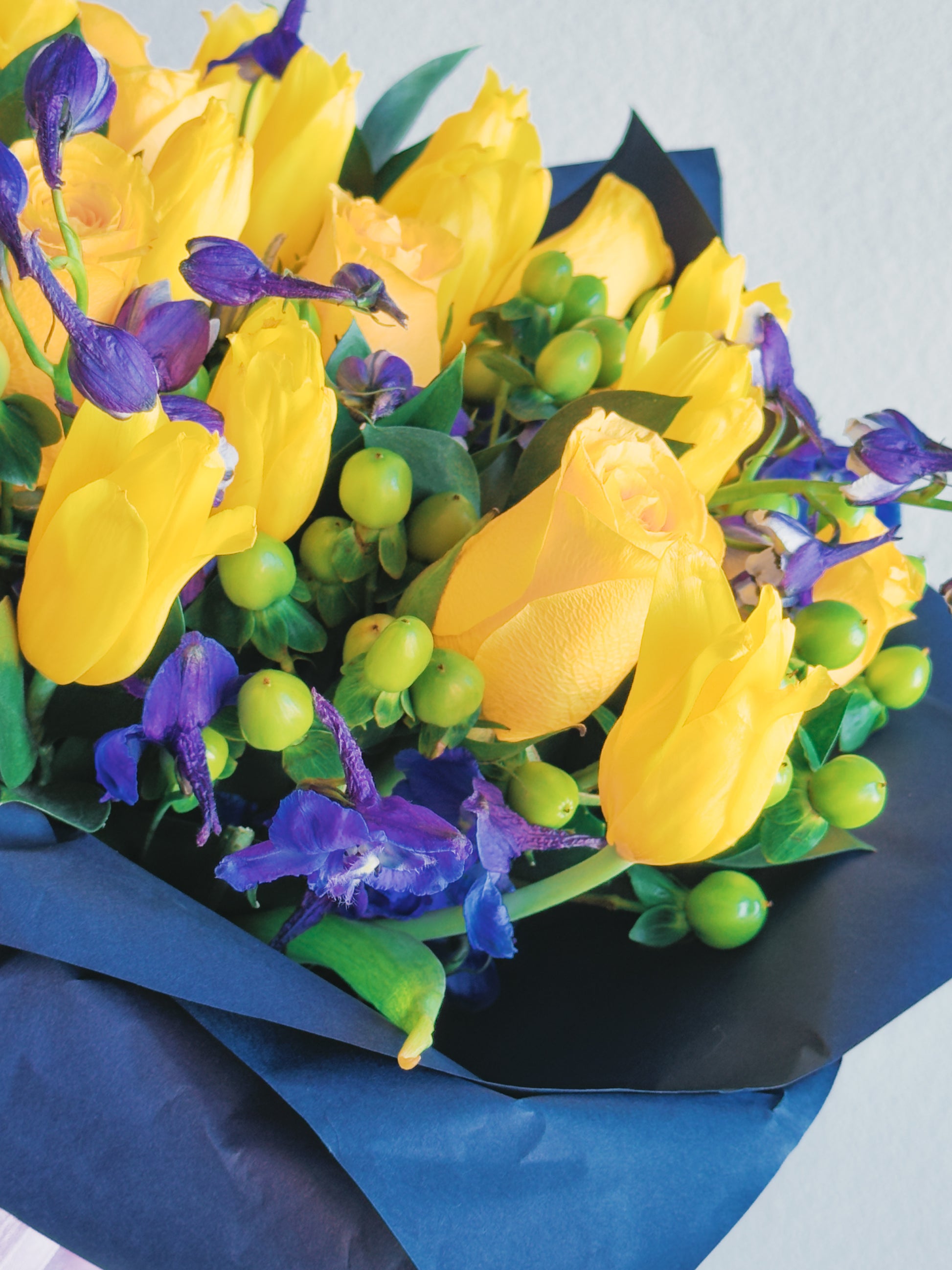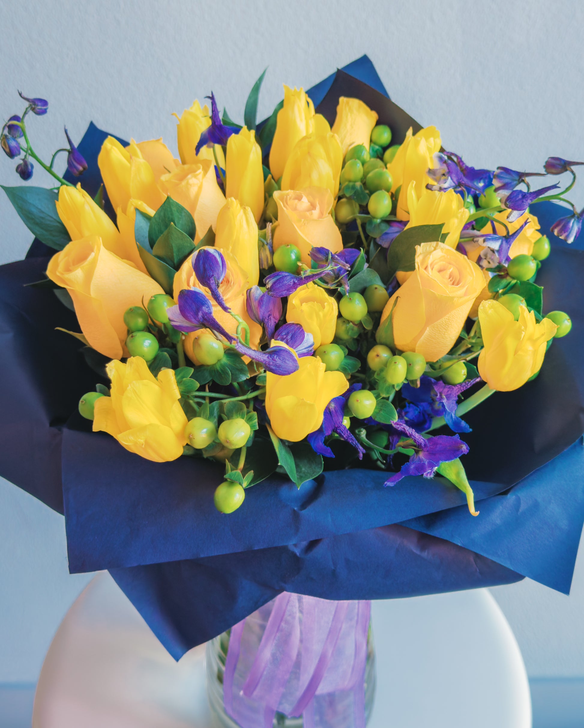 This bouquet is a celebration of contrasts and harmony! Vibrant yellow roses and tulips radiate energy, while the deep purple delphiniums create a striking color contrast, bringing depth and elegance. Green hypericum berries add playful texture, and the lush greenery ties everything together in a modern, bold arrangement. Wrapped in navy blue paper with a soft purple ribbon, this bouquet feels like a ray of sunshine captured in a sophisticated frame.