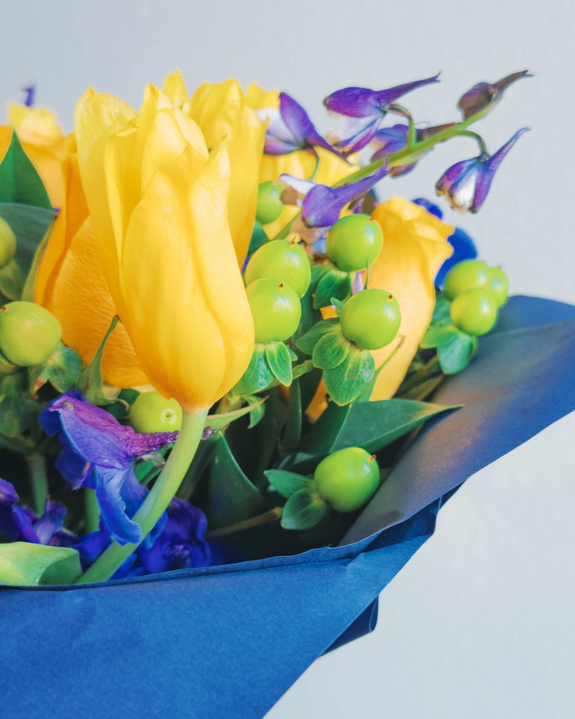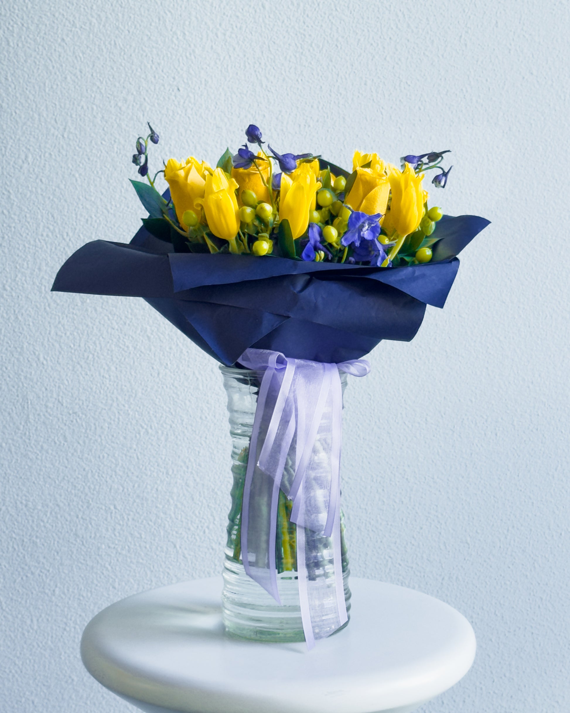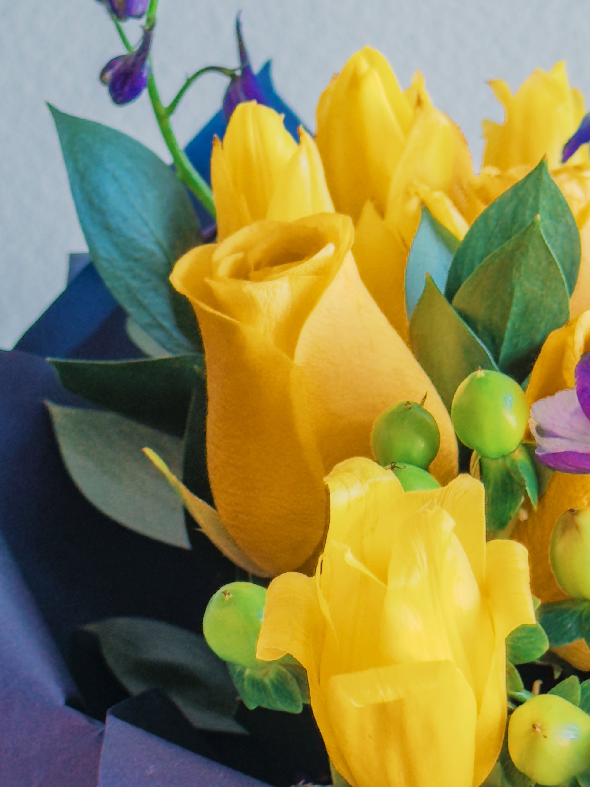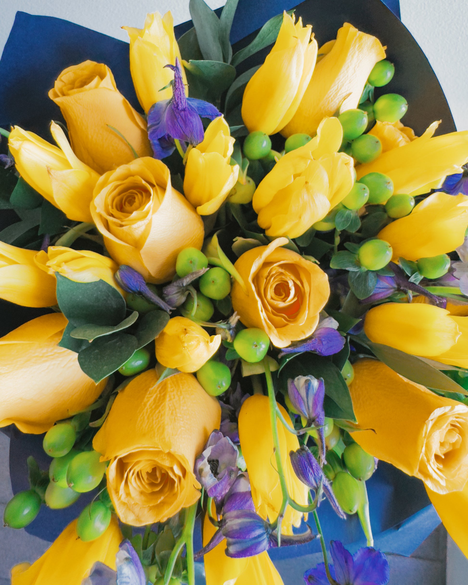 This bouquet is a celebration of contrasts and harmony! Vibrant yellow roses and tulips radiate energy, while the deep purple delphiniums create a striking color contrast, bringing depth and elegance. Green hypericum berries add playful texture, and the lush greenery ties everything together in a modern, bold arrangement. Wrapped in navy blue paper with a soft purple ribbon, this bouquet feels like a ray of sunshine captured in a sophisticated frame.