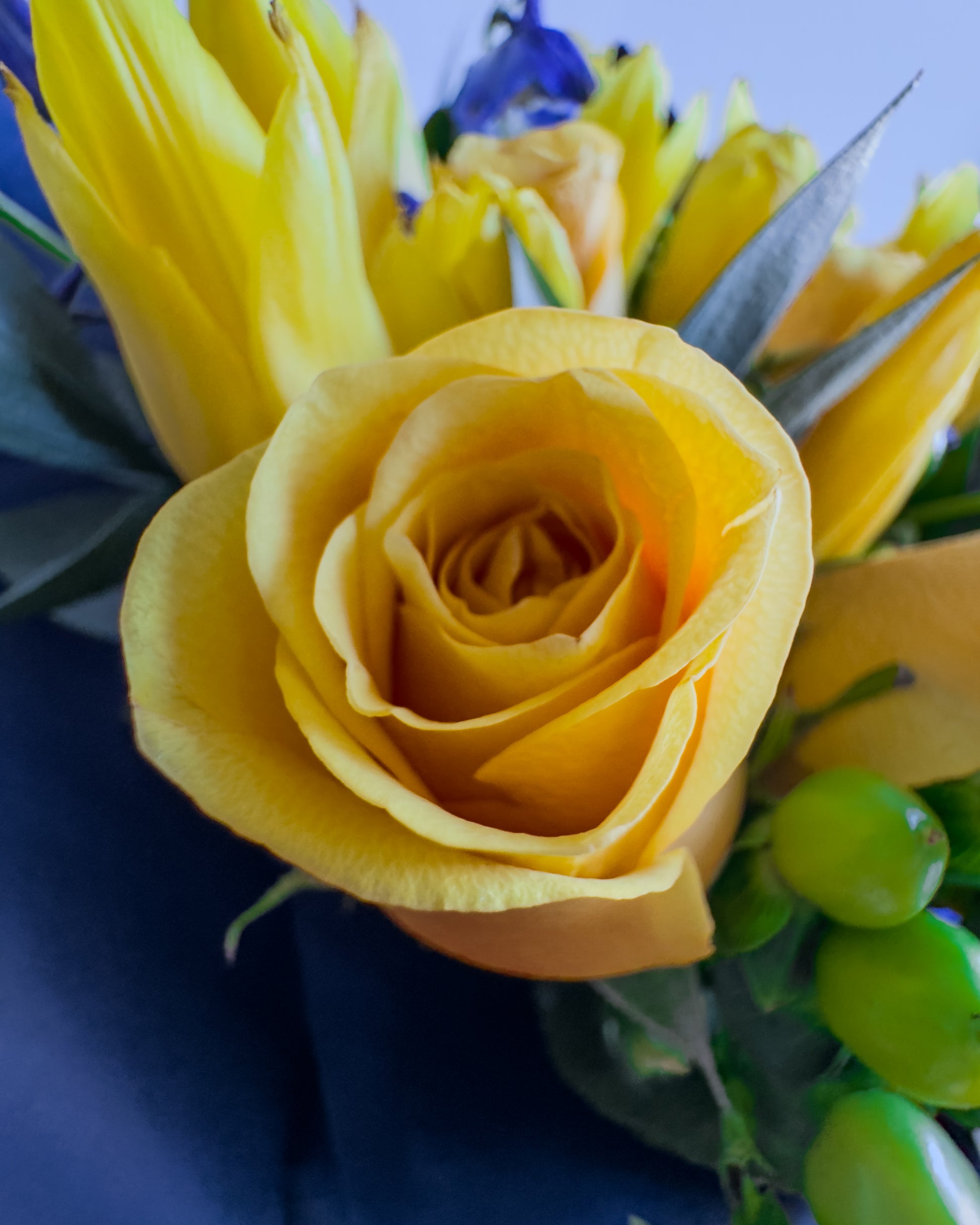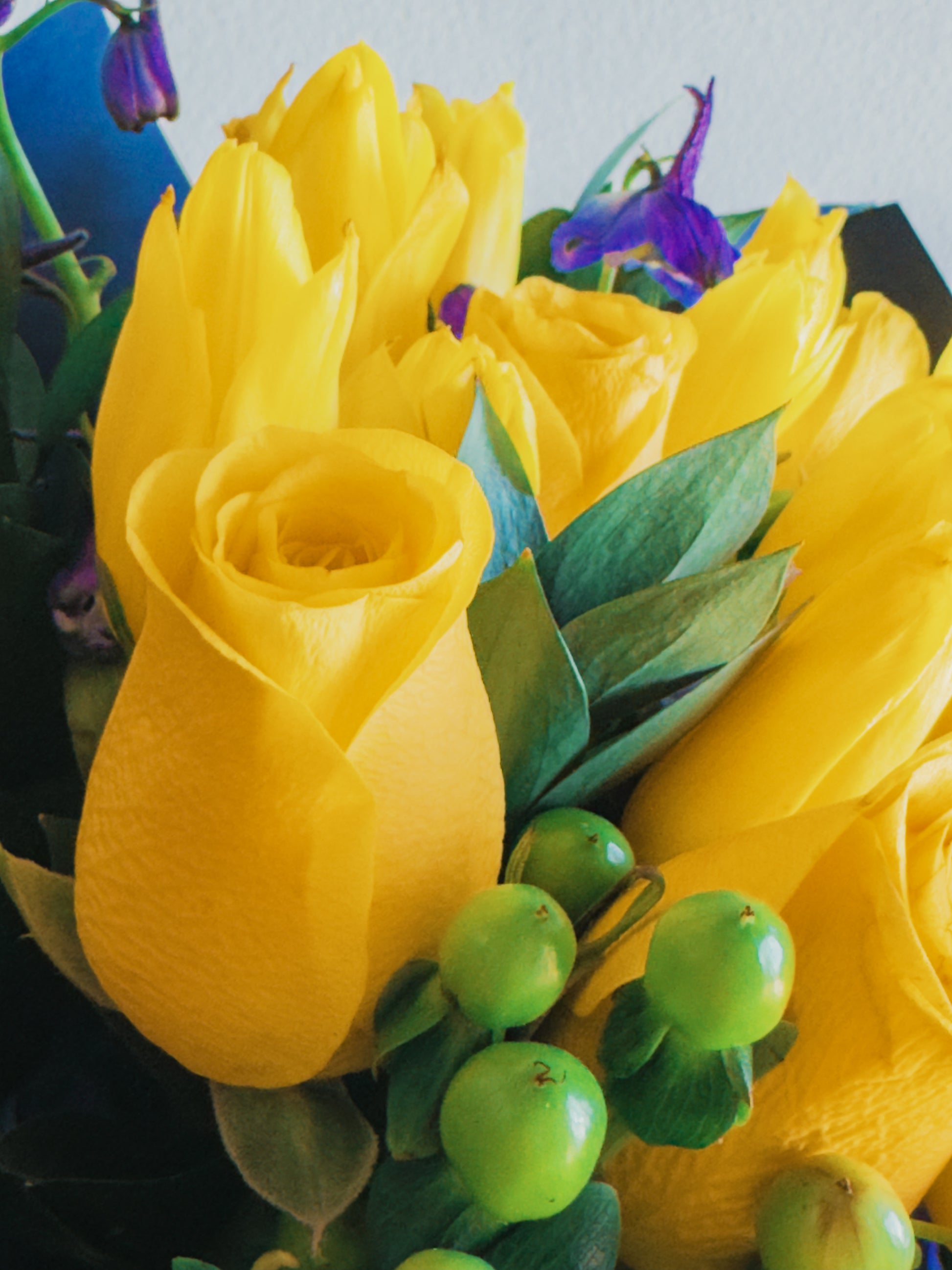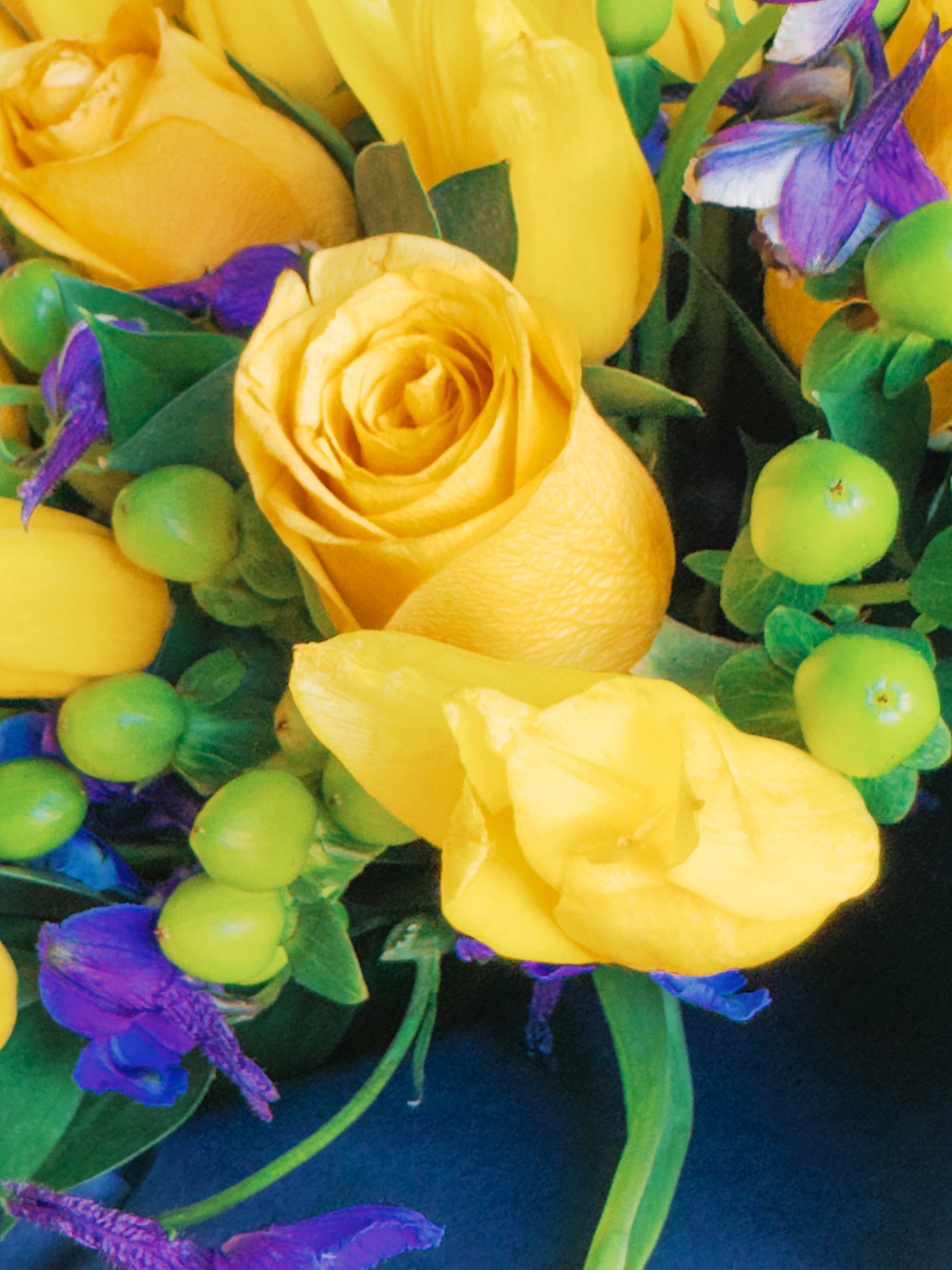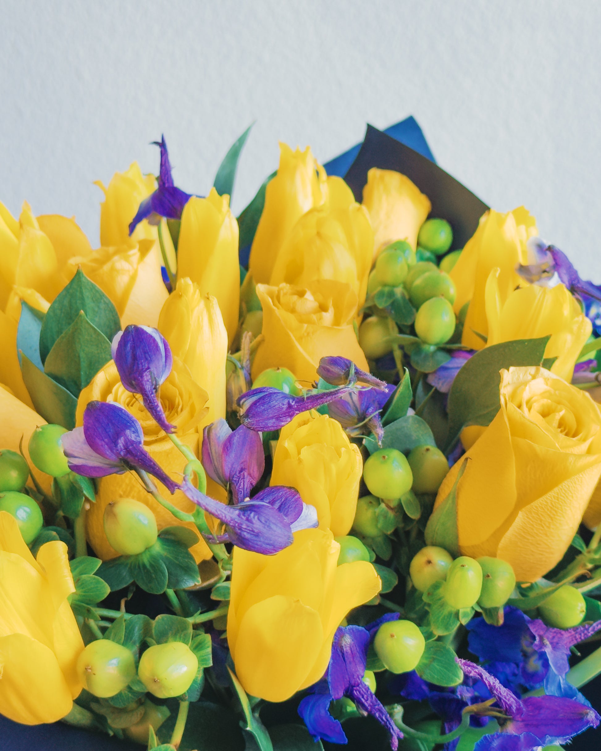 This bouquet is a celebration of contrasts and harmony! Vibrant yellow roses and tulips radiate energy, while the deep purple delphiniums create a striking color contrast, bringing depth and elegance. Green hypericum berries add playful texture, and the lush greenery ties everything together in a modern, bold arrangement. Wrapped in navy blue paper with a soft purple ribbon, this bouquet feels like a ray of sunshine captured in a sophisticated frame.
